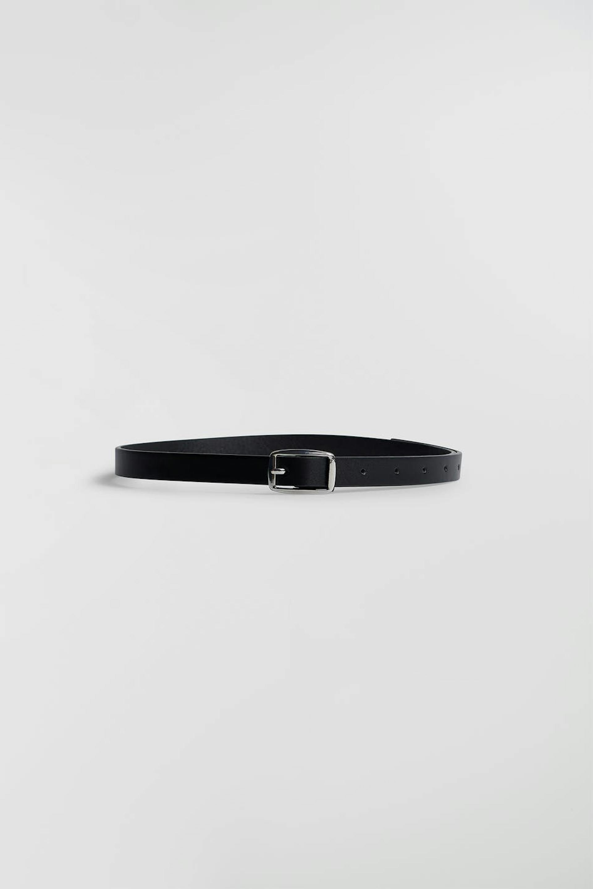 Bälte med silverfärgat spänne. Bältet är svart.