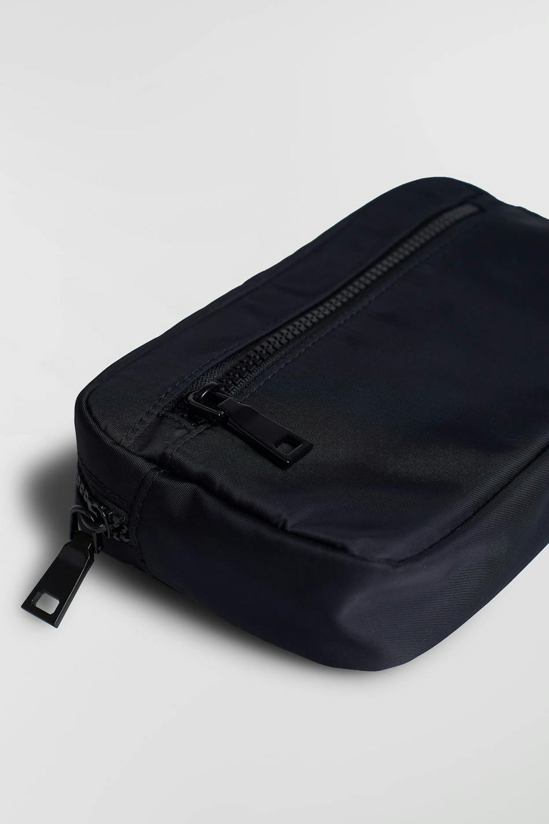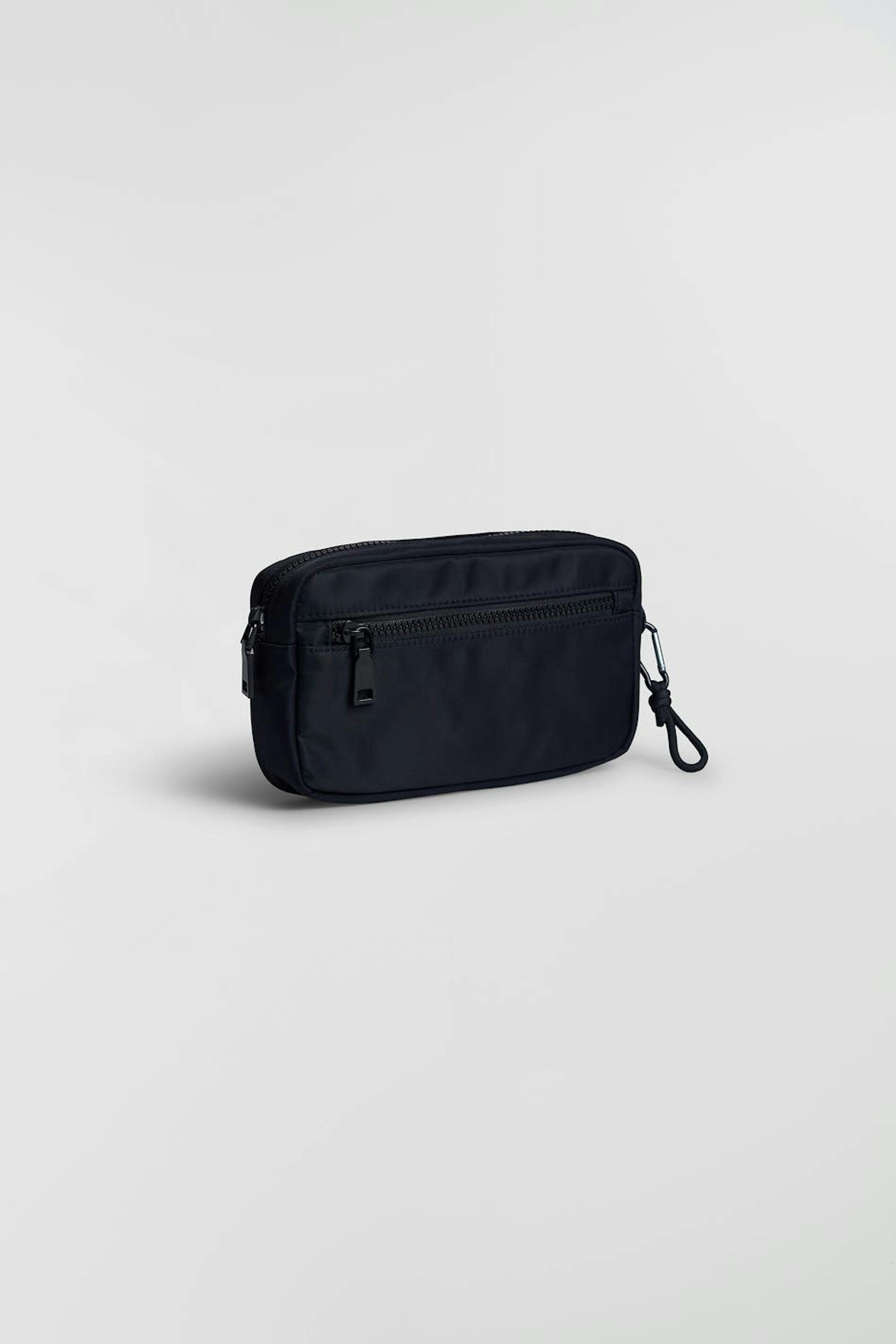 Sminkväska med exklusiva detaljer. Sminkväskan är svart och har en karbinhake upptill. Den har ett ytterfack med blixtlås.