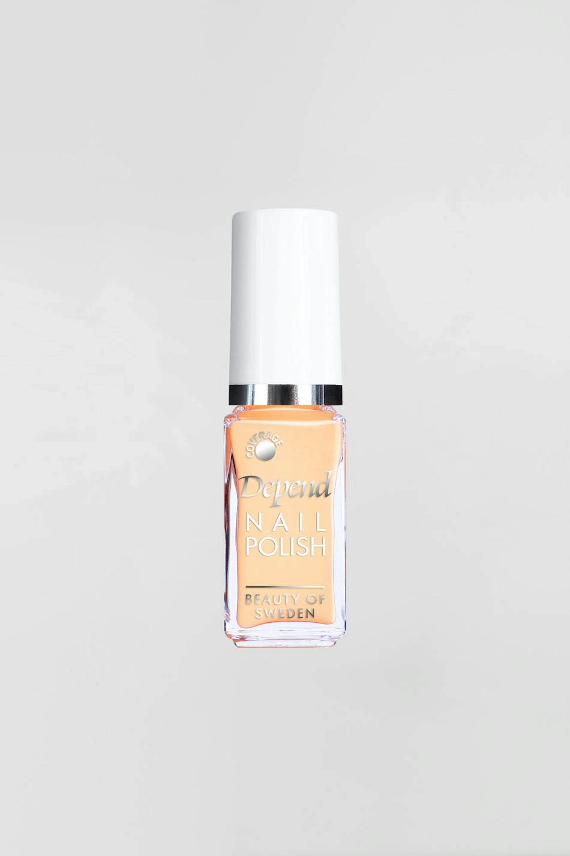 Litet nagellack från Depend med en platt borste med en rundad kant. Nagellacket är oranget.