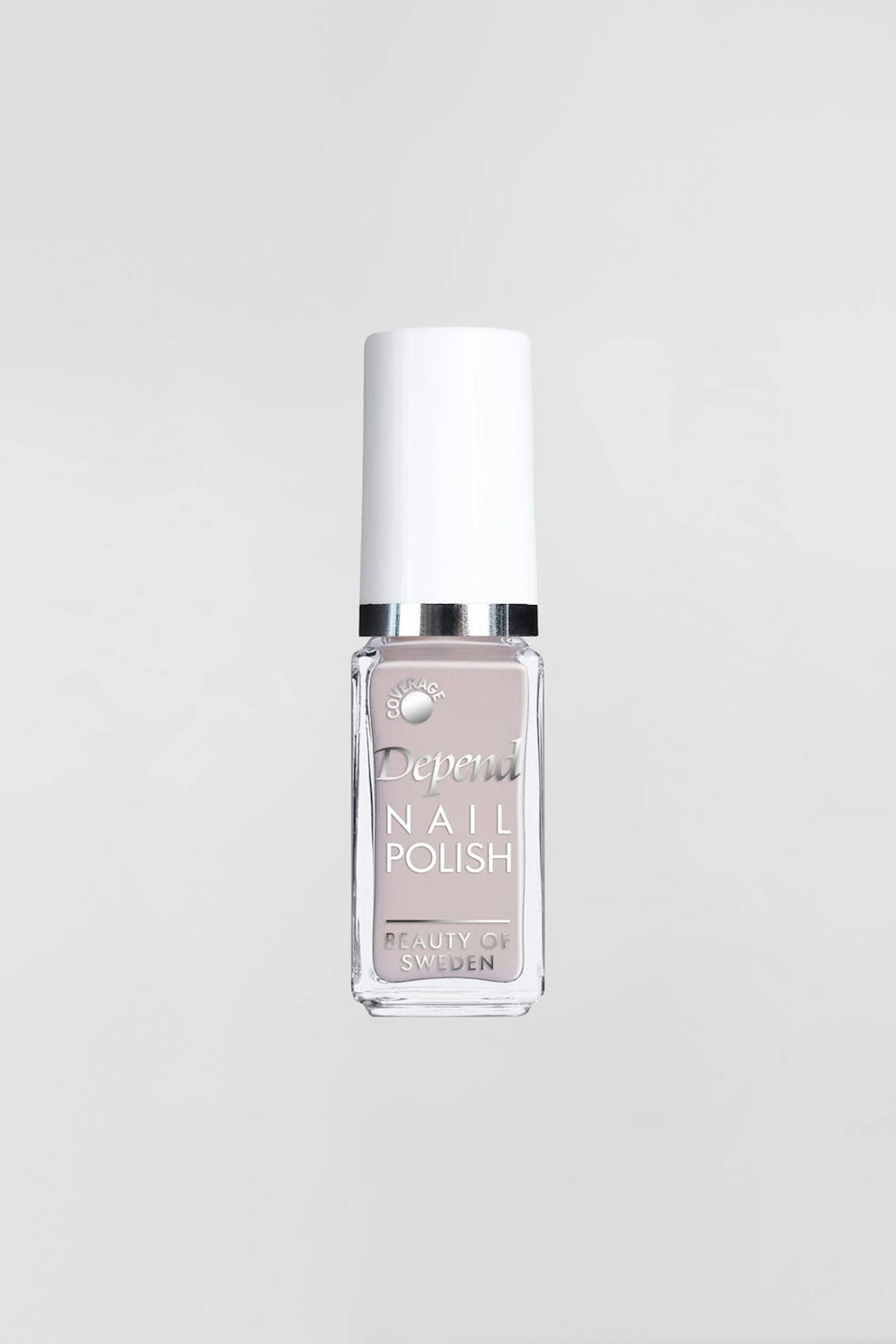 Litet nagellack från Depend med en platt borste med en rundad kant. Nagellacket är grått.