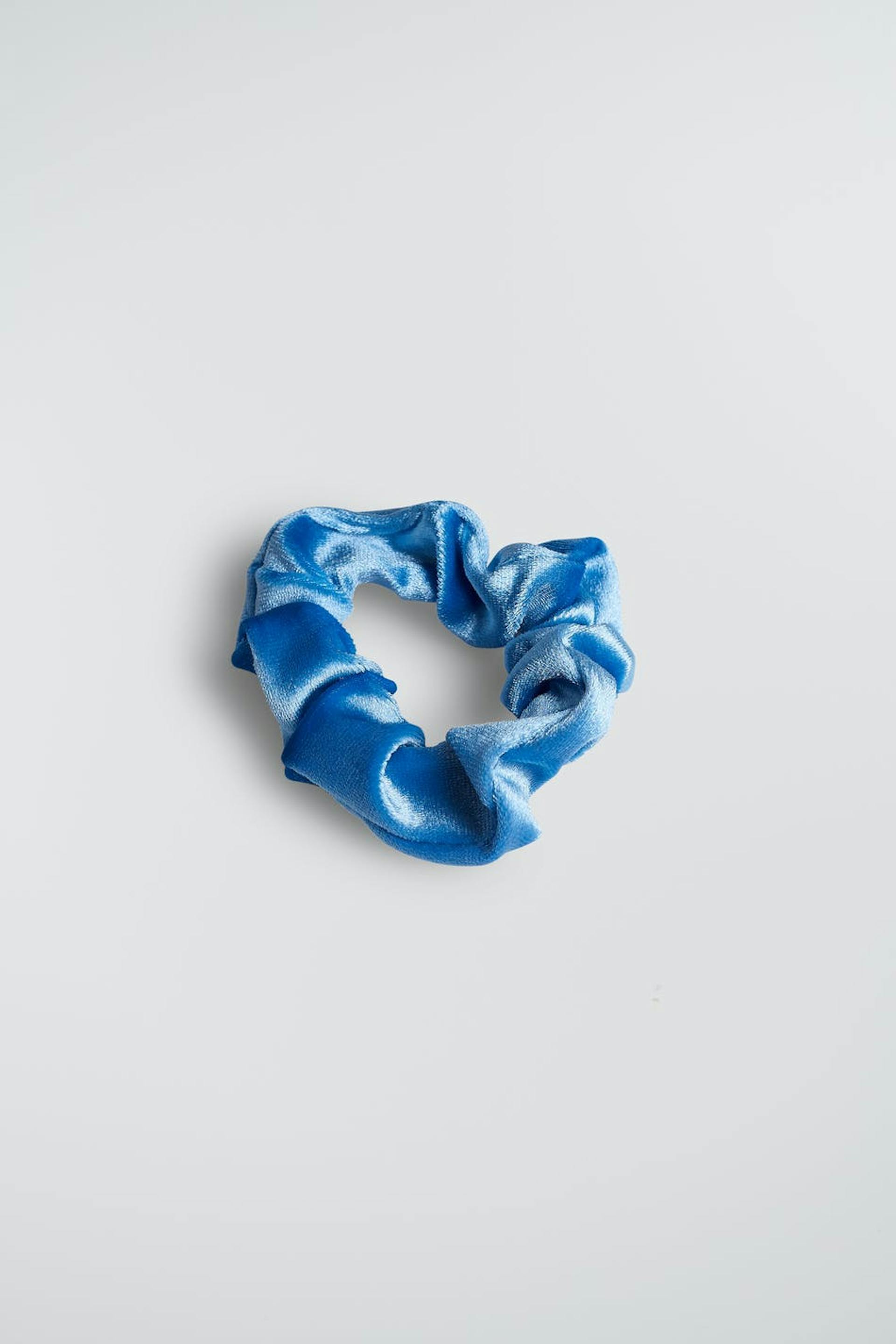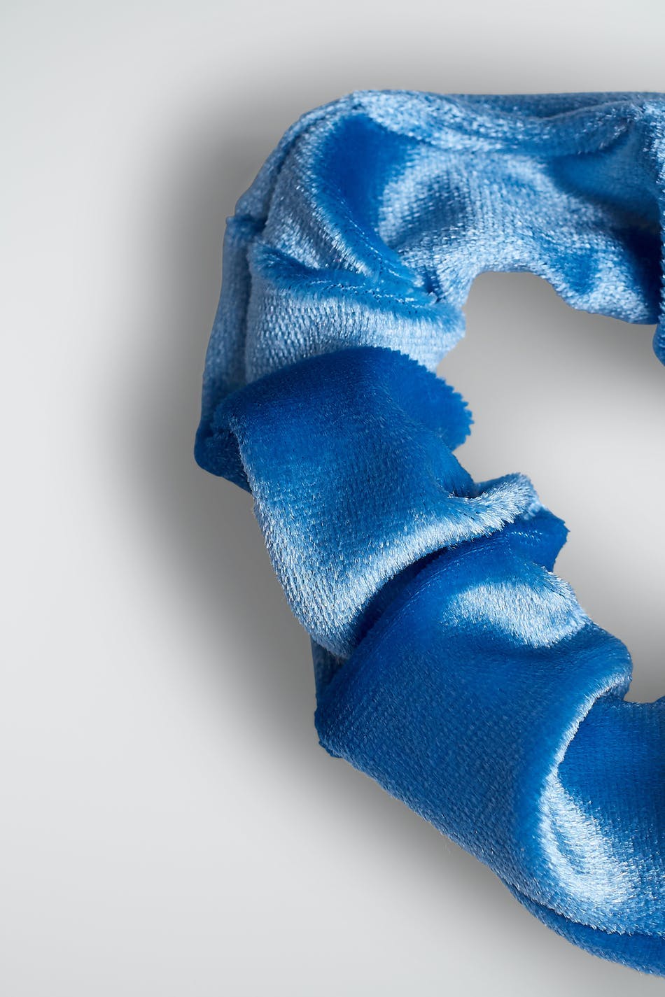 Liten scrunchie. Håraccessoaren är blå. Den är gjord av velour.