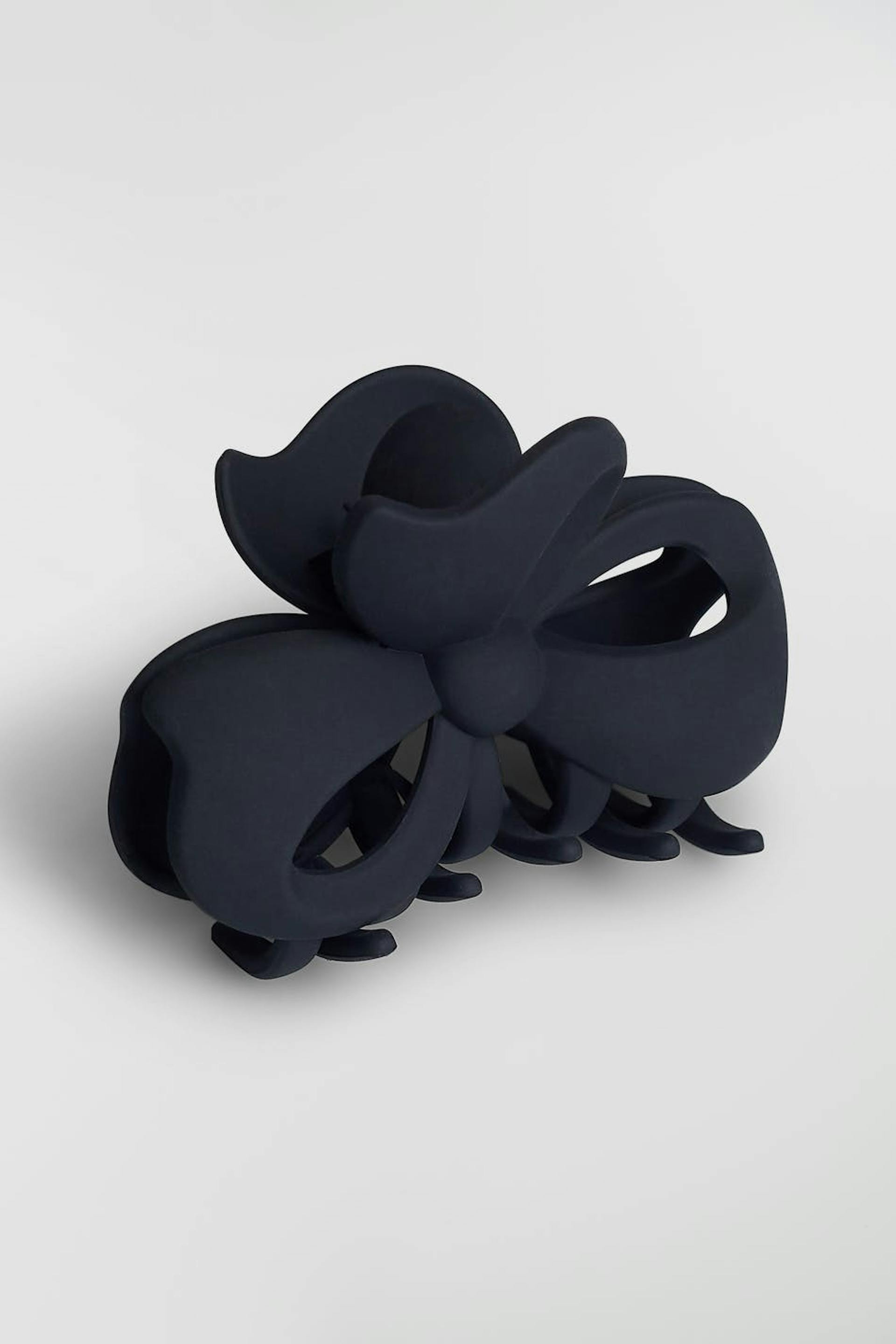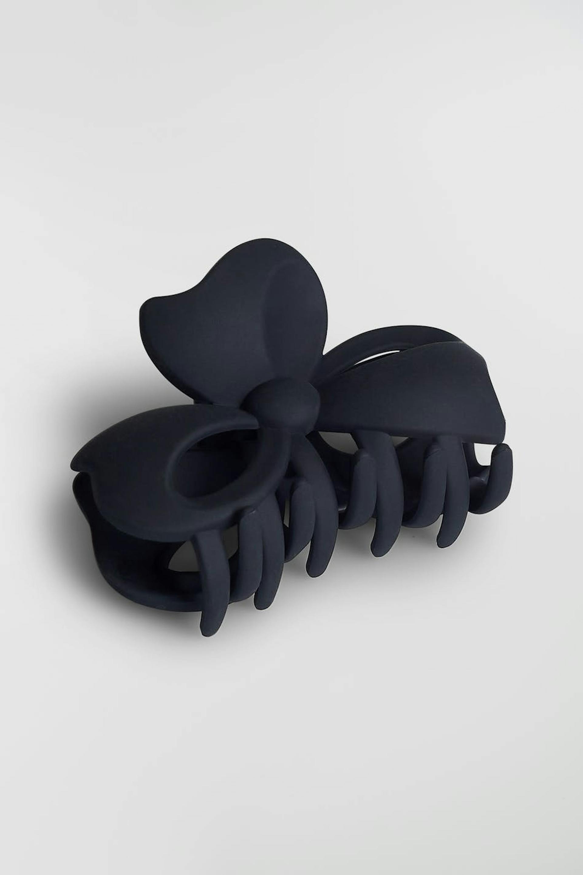 Rosettformad hårklämma med en matt, svart färg.