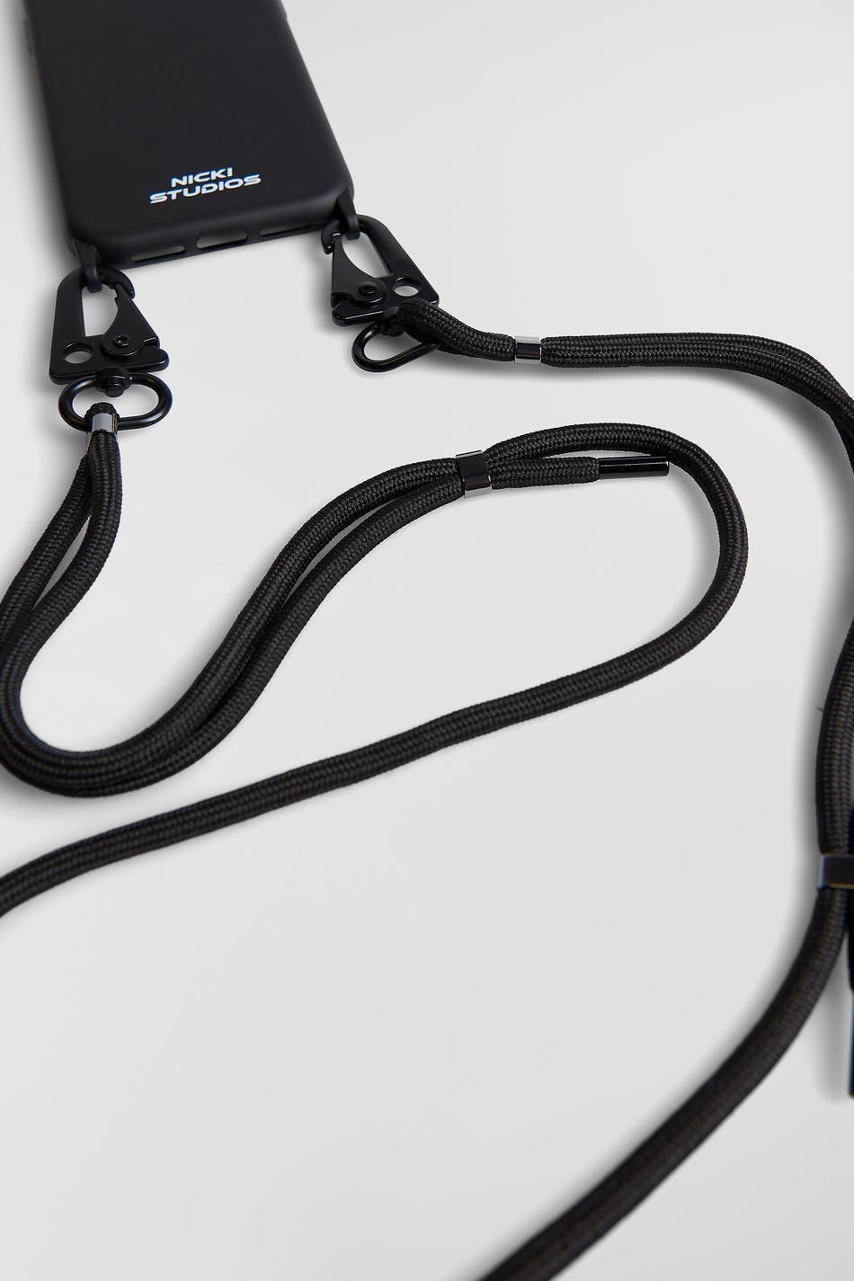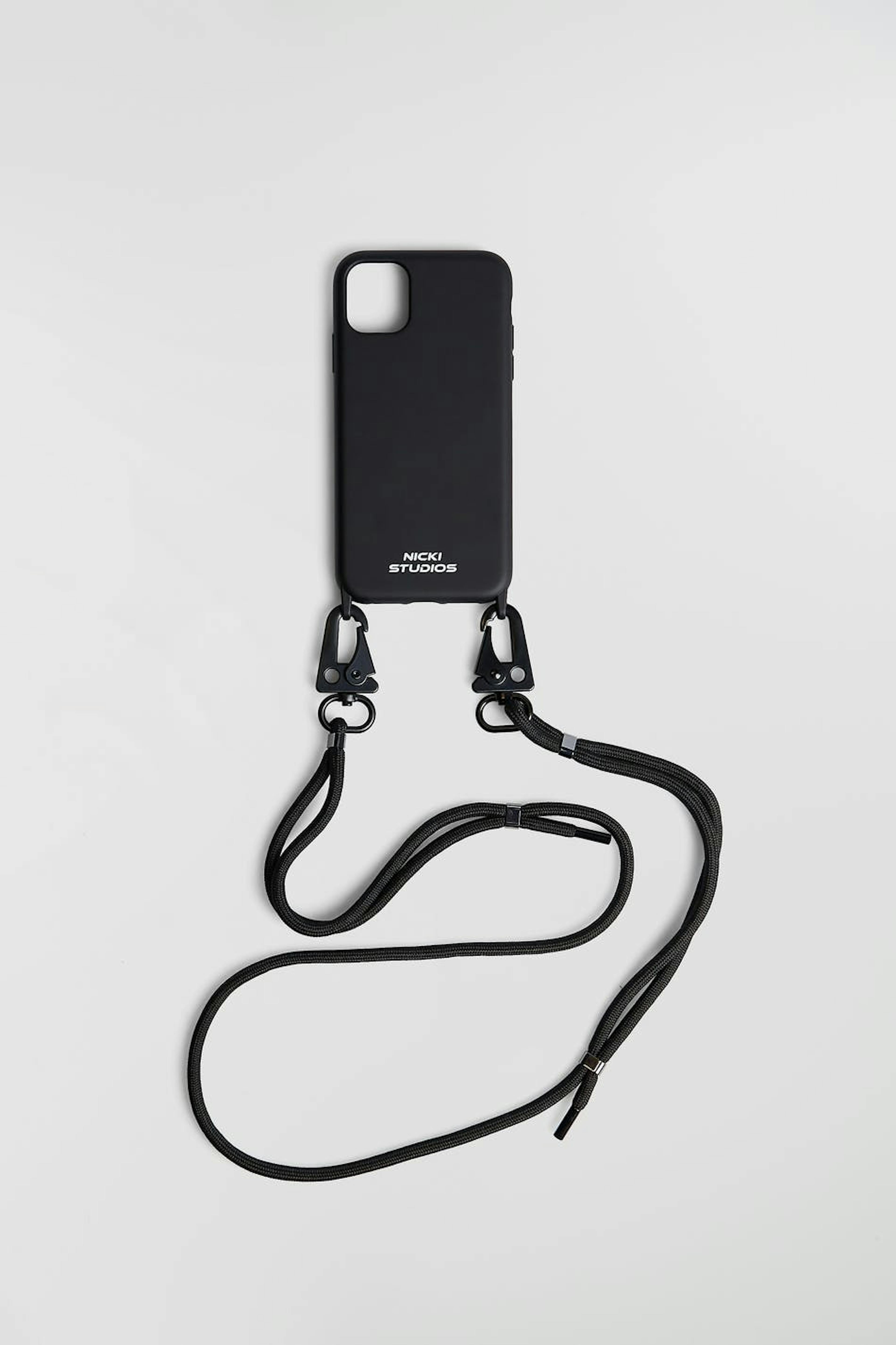 Nicki Studios X Gina Tricot. Mobilskal för iPhone XR/11 med avtagbara snören med karbinhakar. Mobilskalet är svart och har en logotyp framtill.