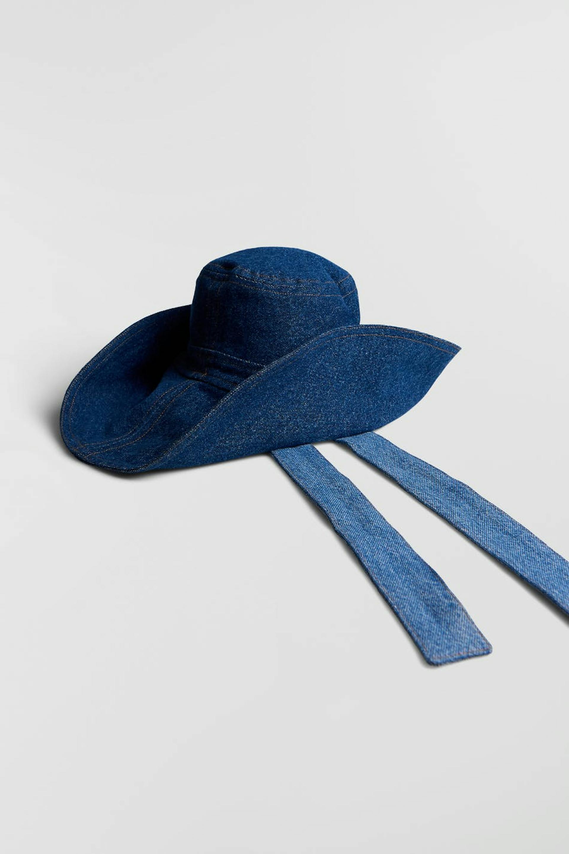 Hanna MW X Gina Tricot. Hatt med vikbara kanter. Hatten är blå och har långa knytband på sidorna. Hatten är tillverkad av tygrester och material från överblivna plagg.
