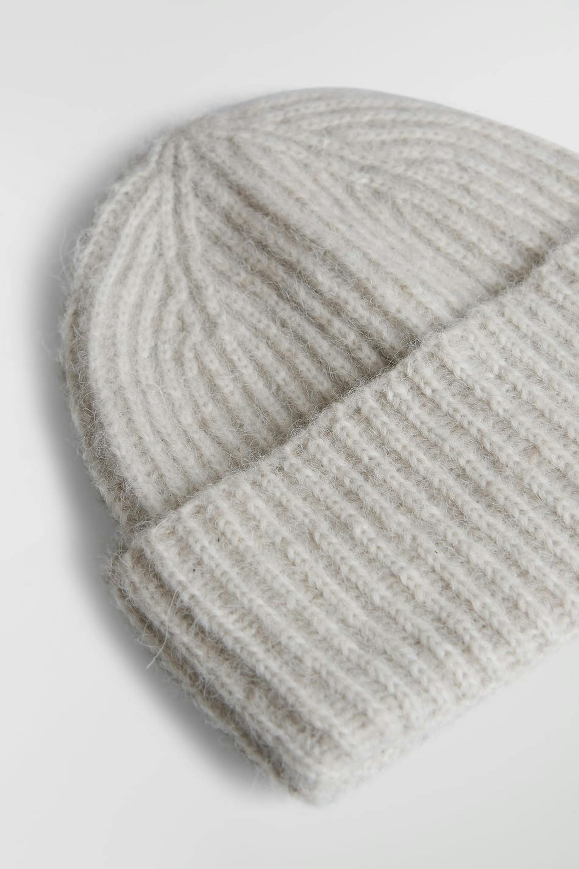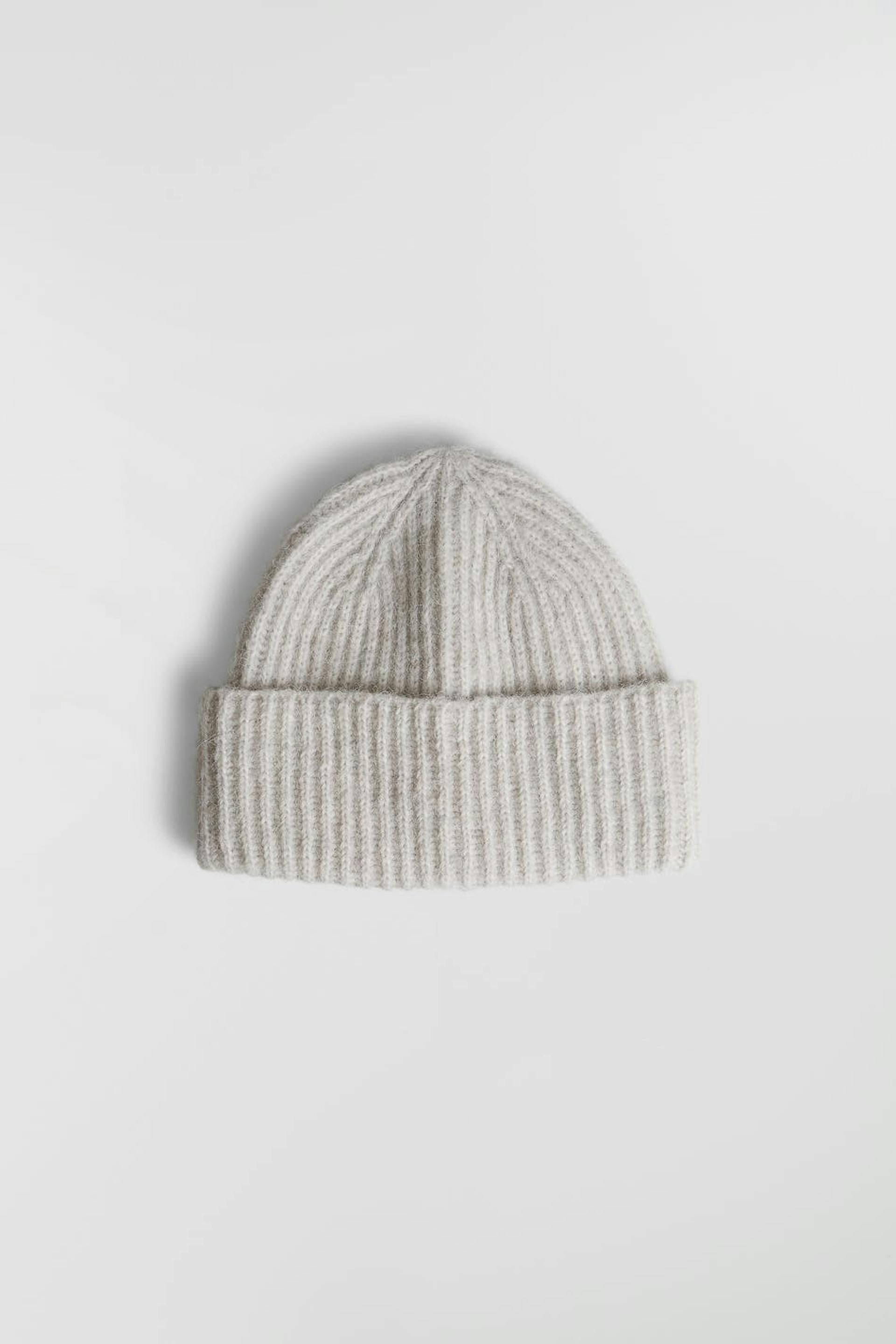 Ribbstickad mössa med uppvikt kant. Hatten är grå.