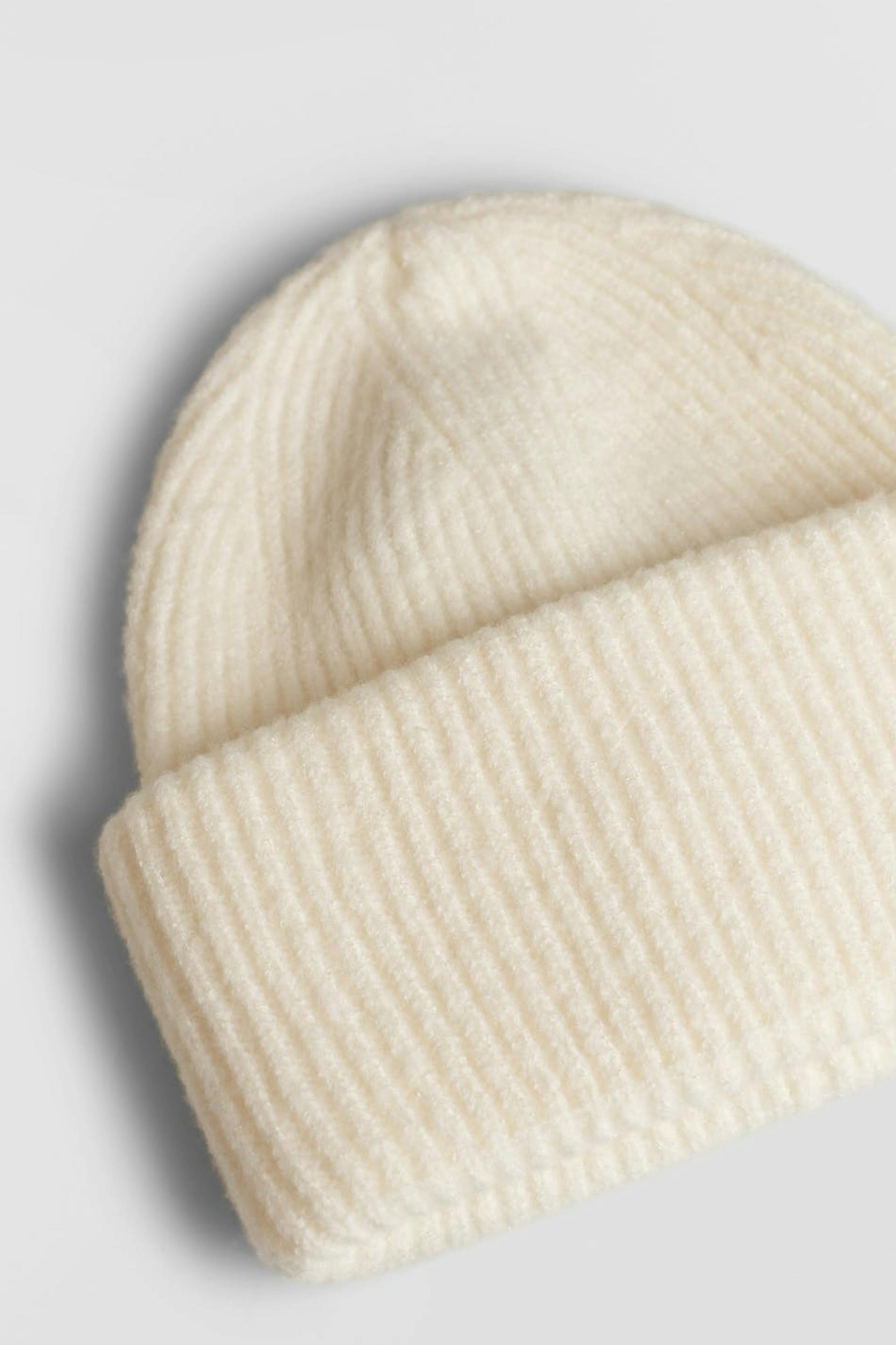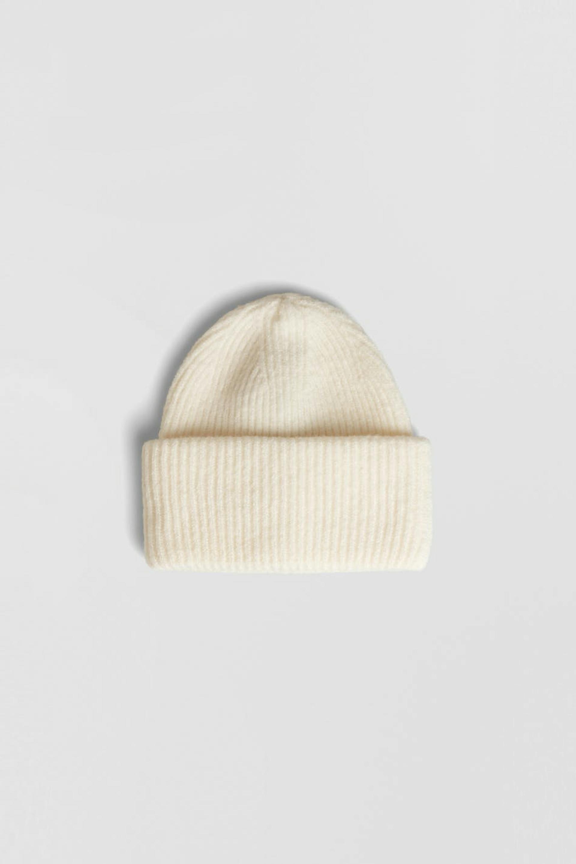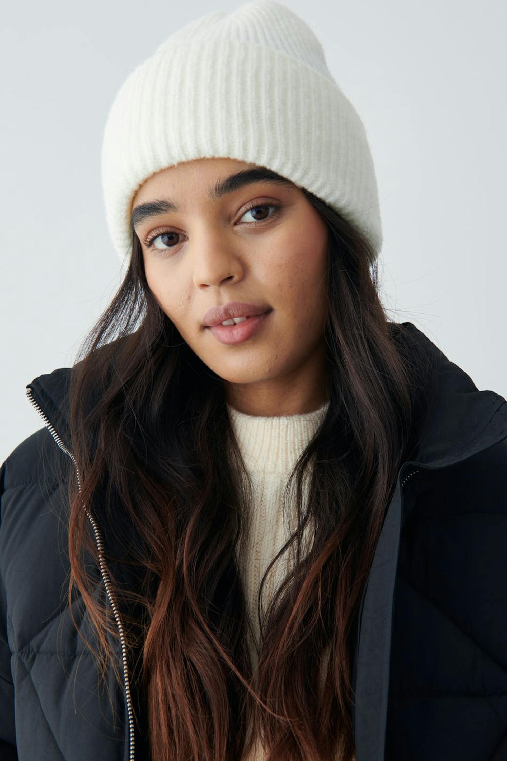 Ribbstickad mössa med en vikt kant. Mössan är vit.