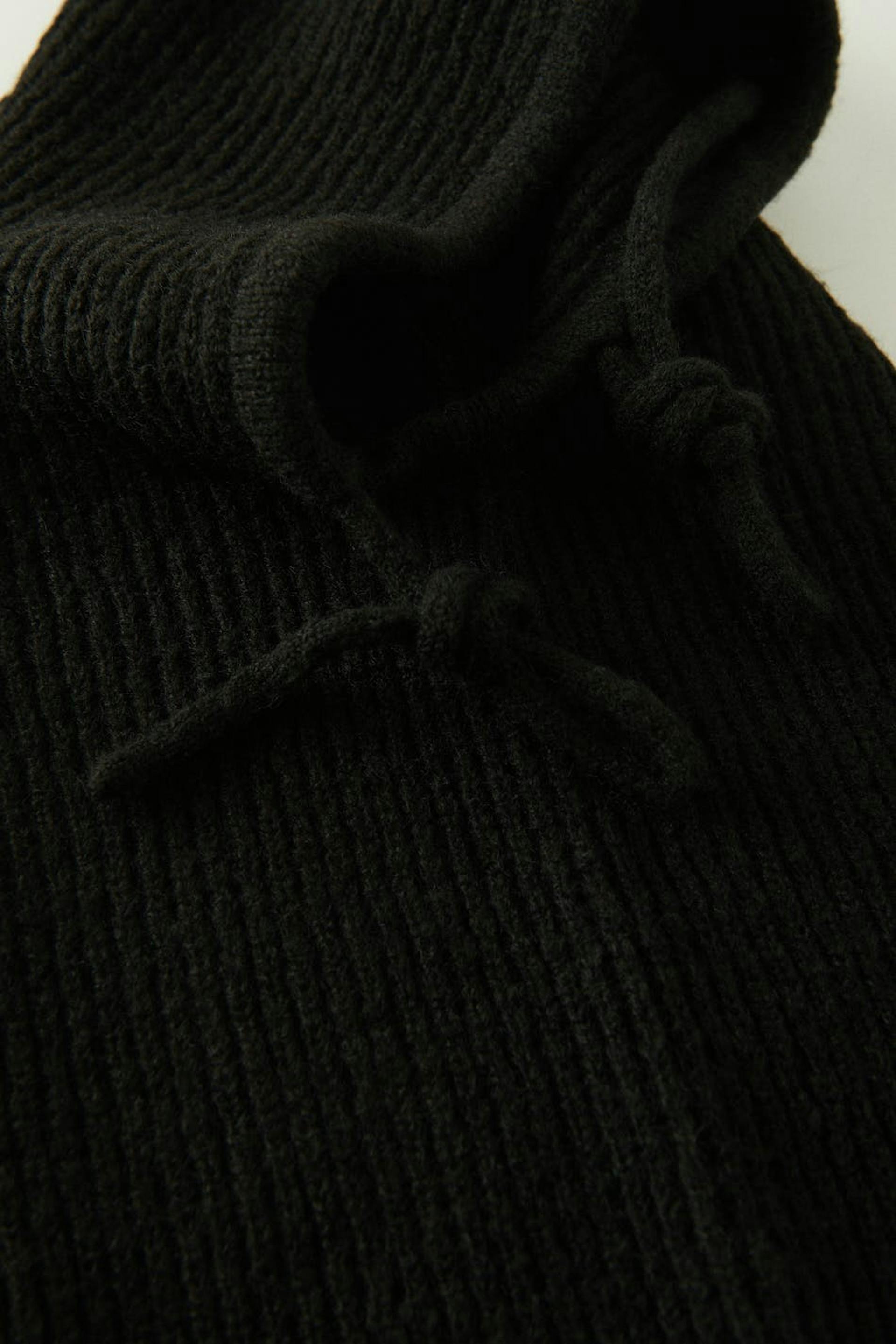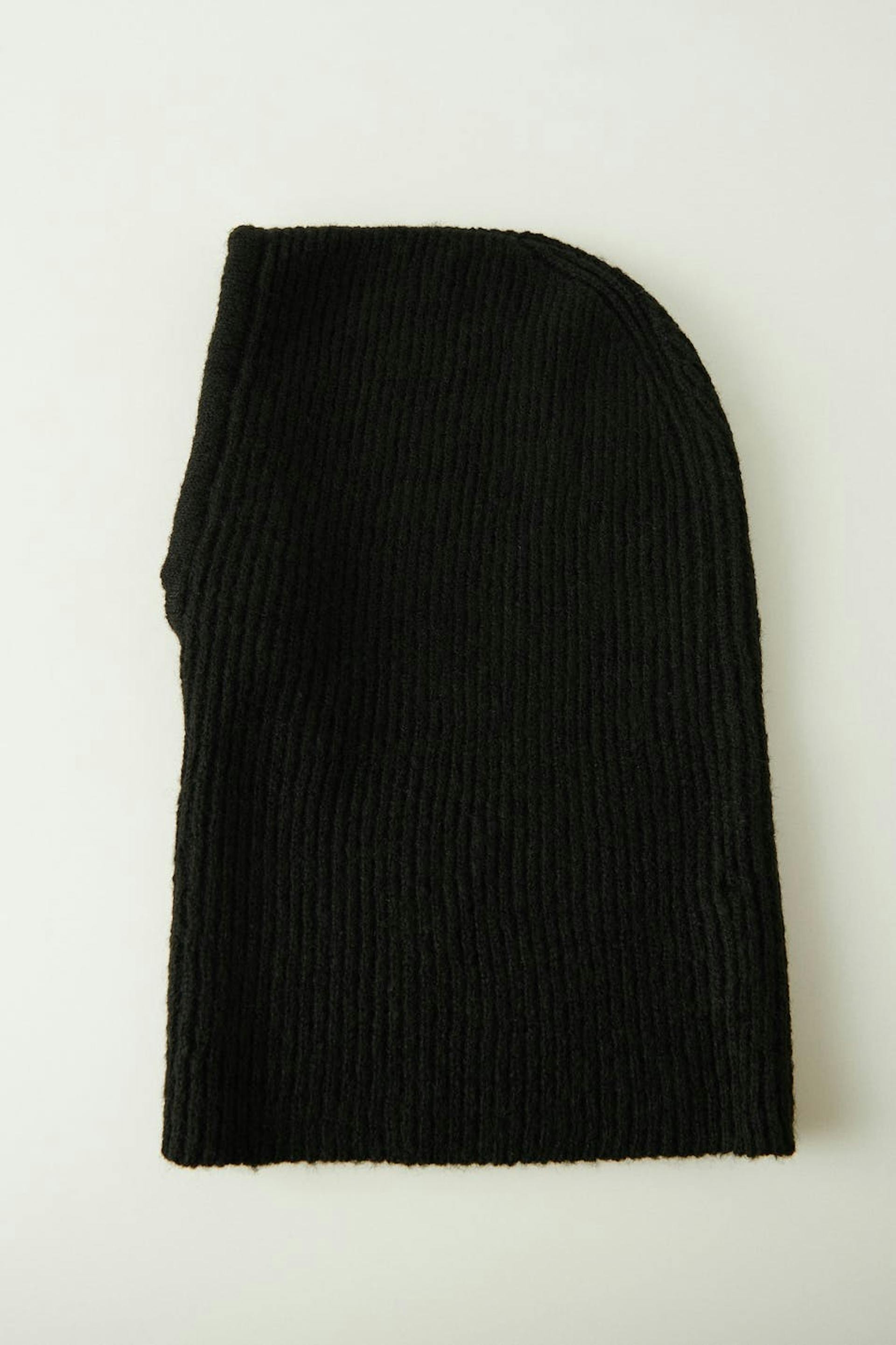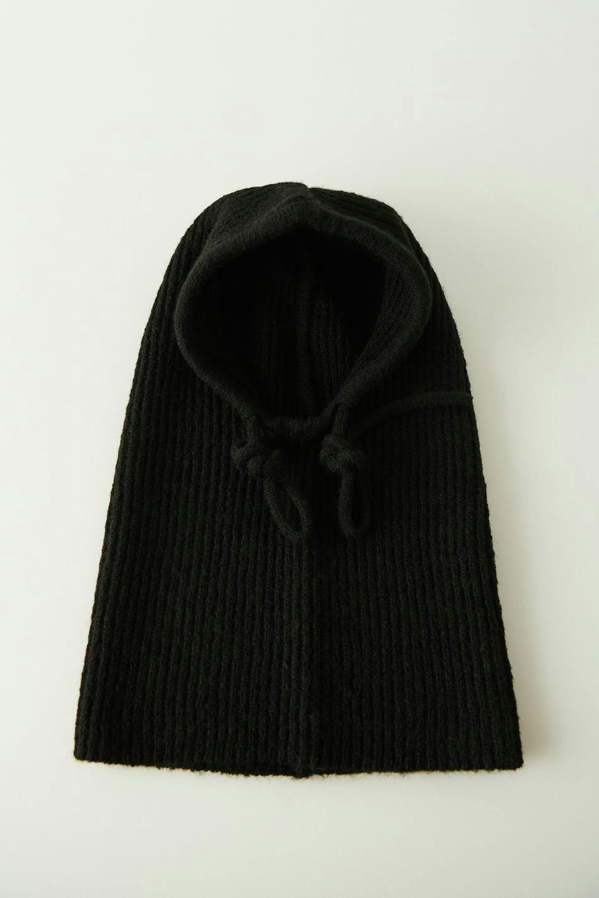 Stickad balaklava med knytning framtill. Balaklavan är svart.