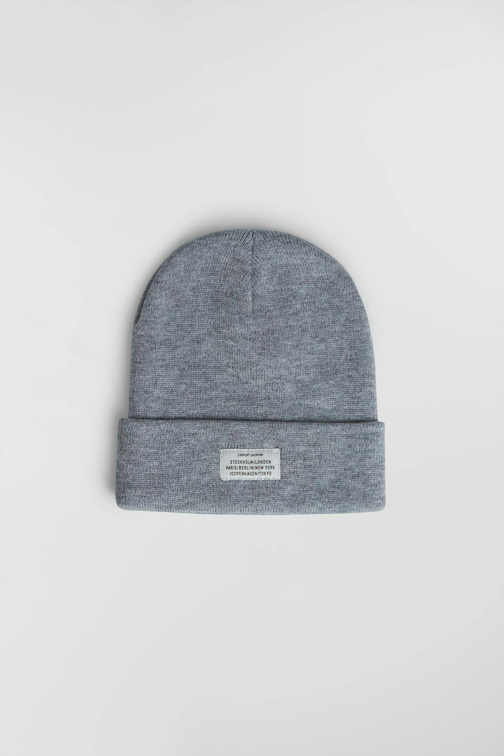 Mössa med broderad text. Mössan är grå och har en uppvikt kant.