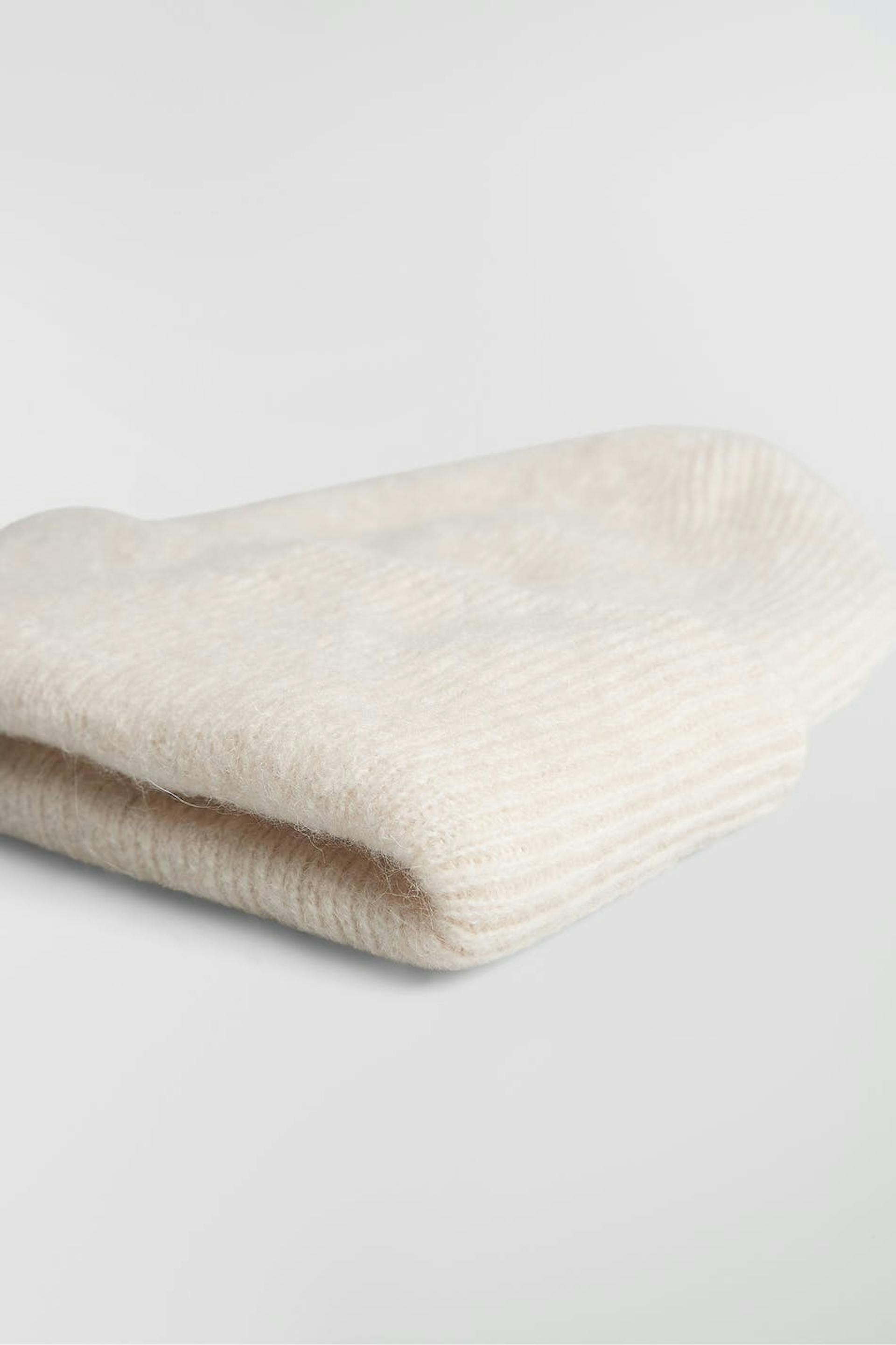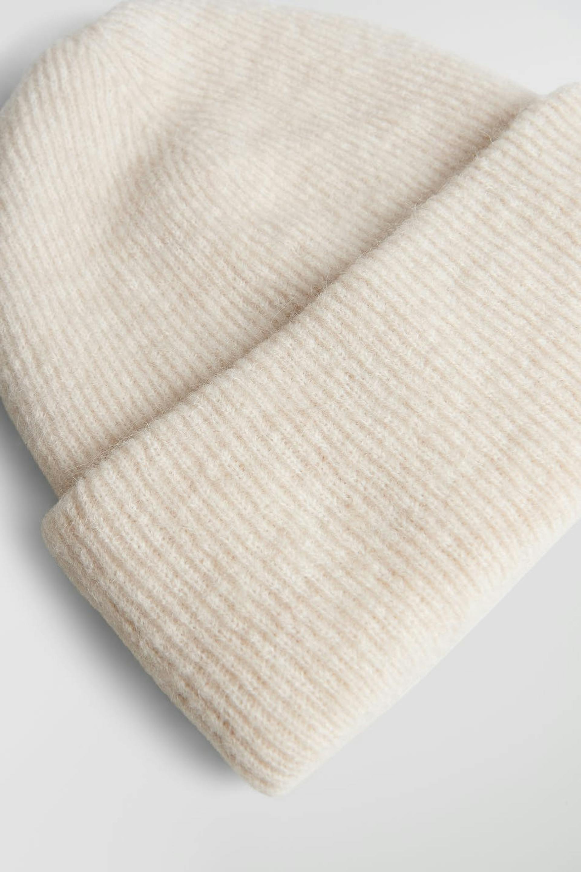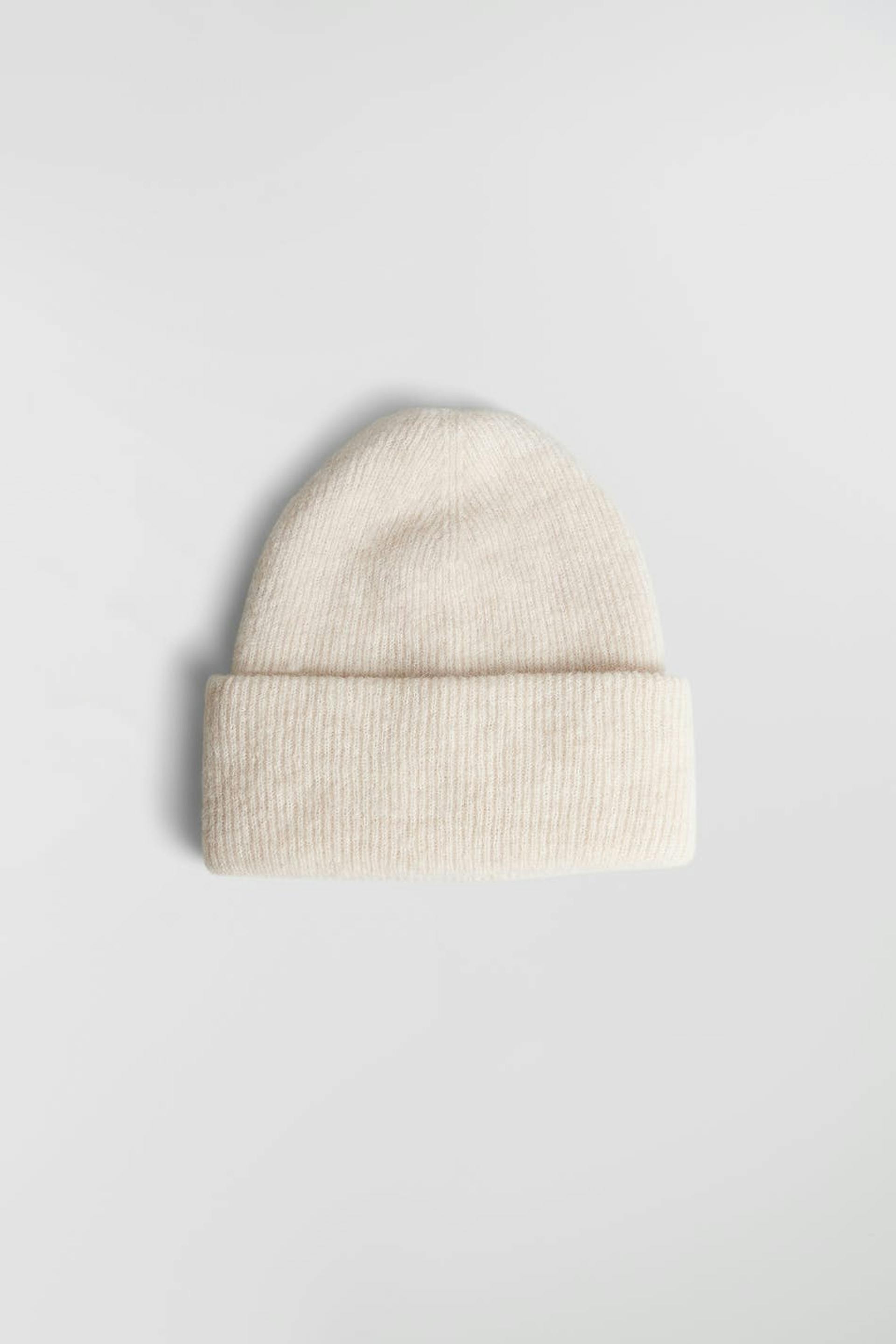 Mjukt stickad mössa med uppvikt kant. Mössan är vit.