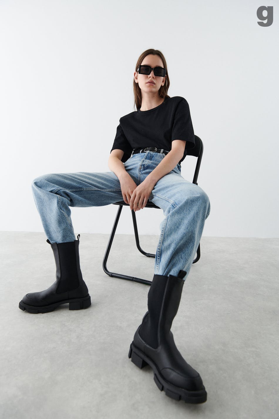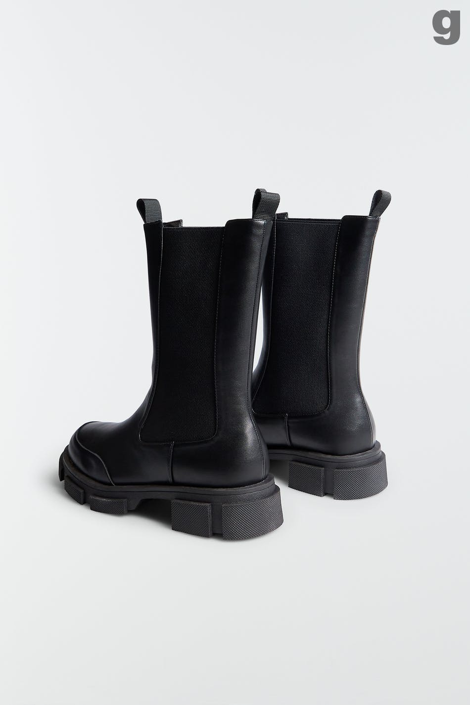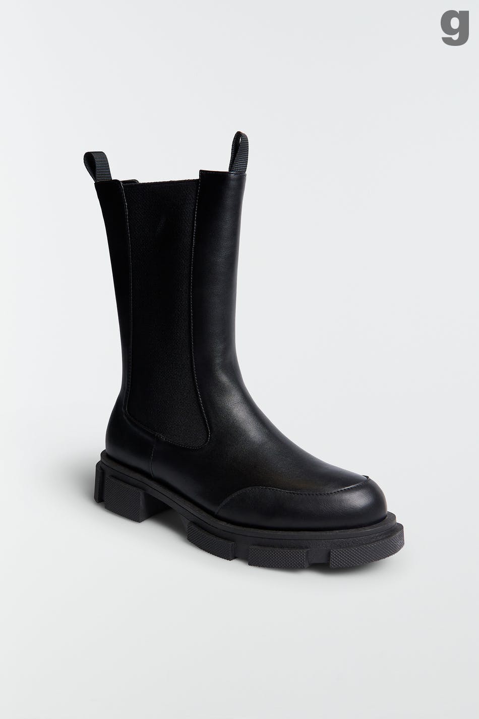 Chunky boots med medelhögt skaft. Bootsen är svarta och har en grov sula med klack. De är gjorda av PU och har rundad tå och resår på sidorna.
