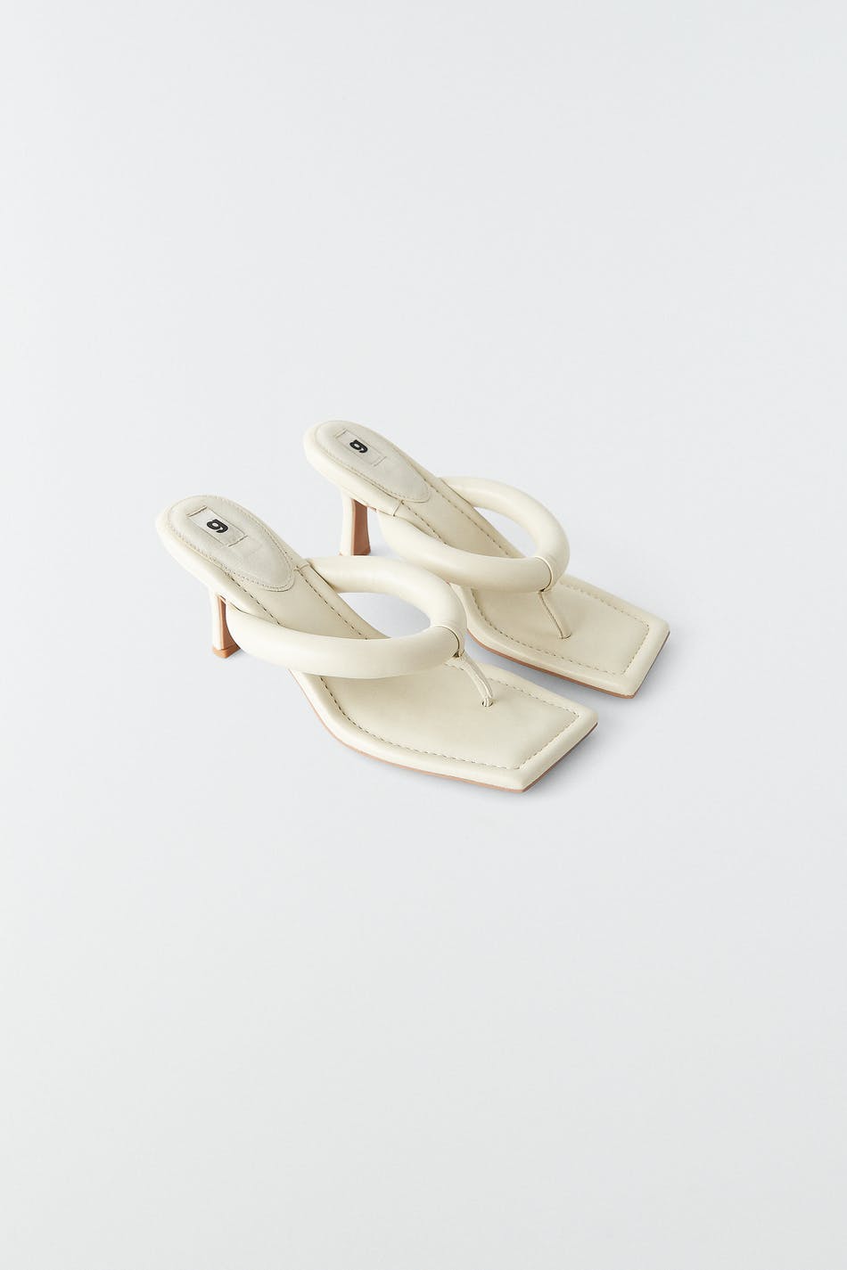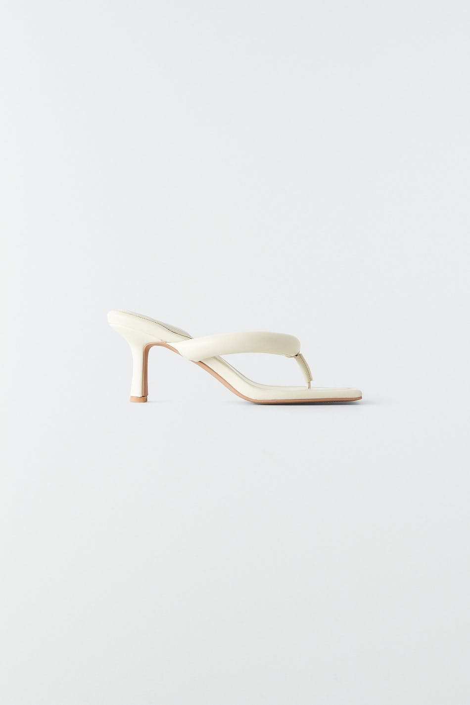 Högklackade sandaler med slip in-design i läderimitation. Sandalerna är vita och har fyrkantig tå. De har vadderad tårem och stilettklack.