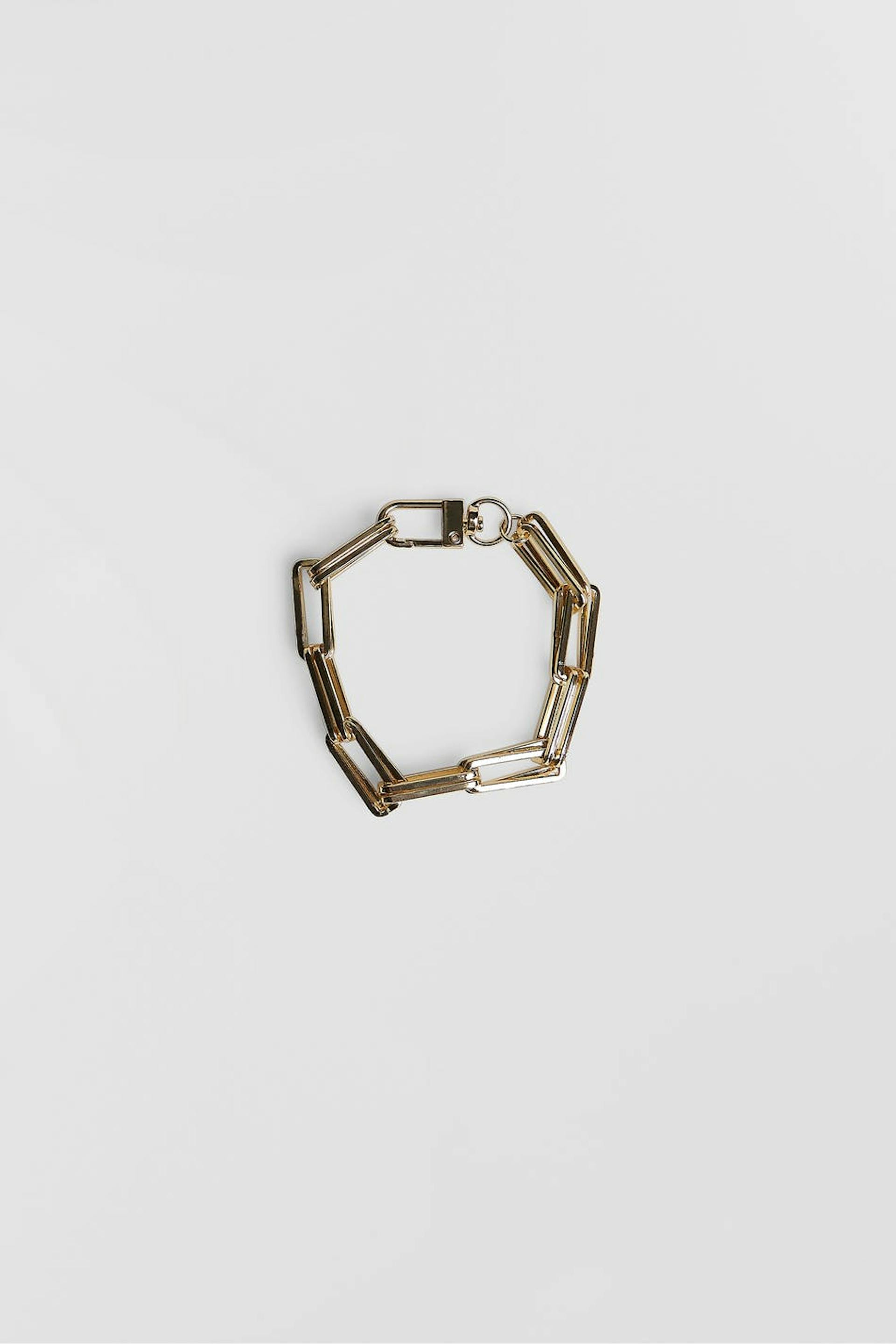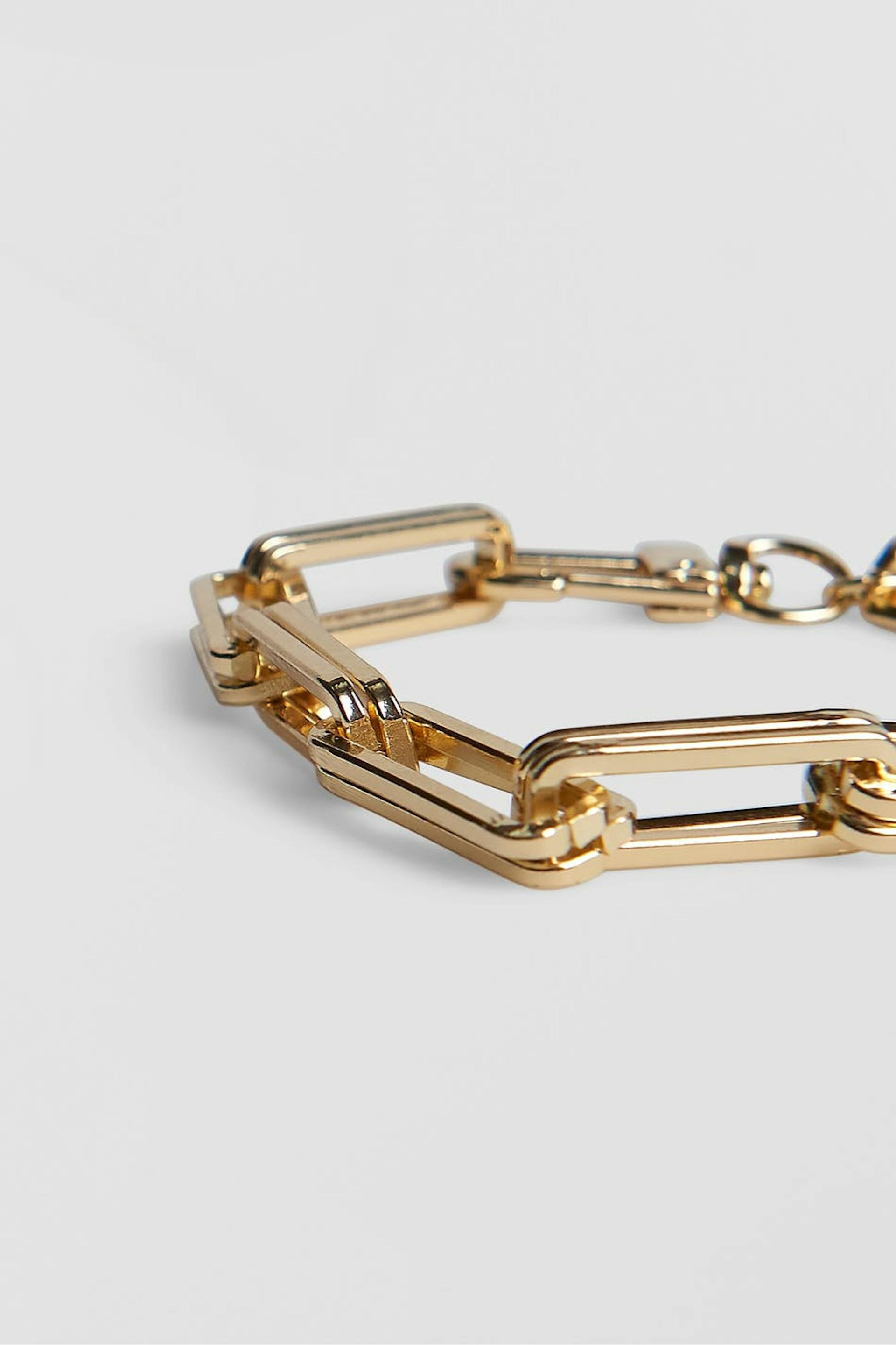 Armband med rektangulära, guldfärgade länkar.