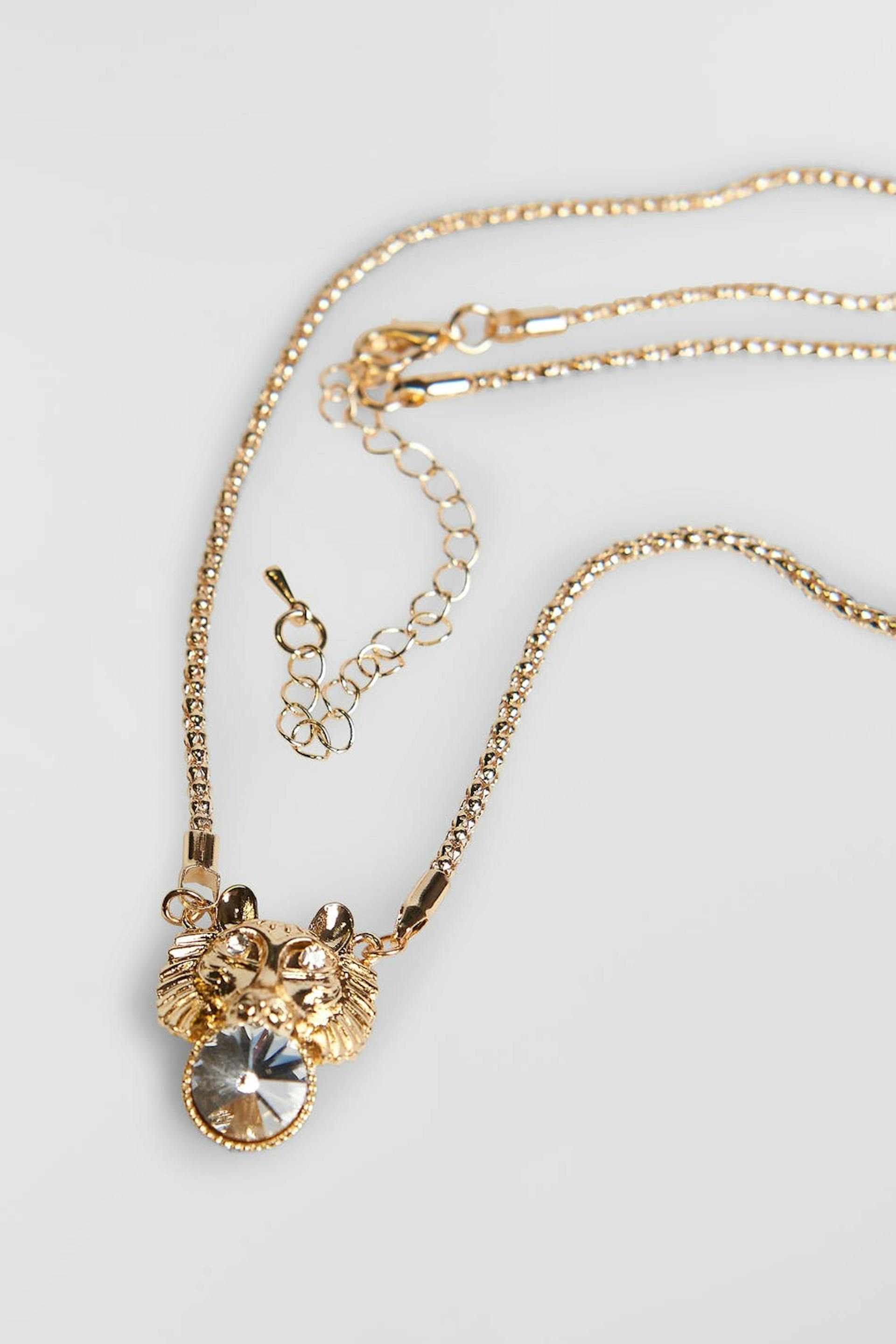 Halsband med en tunn kedja. Smycket är guldfärgat och har en berlock med ett lejon.