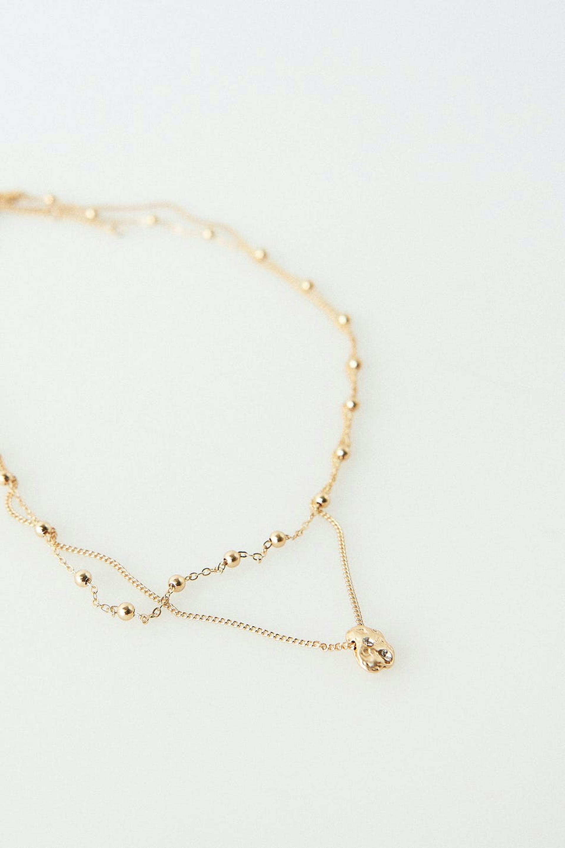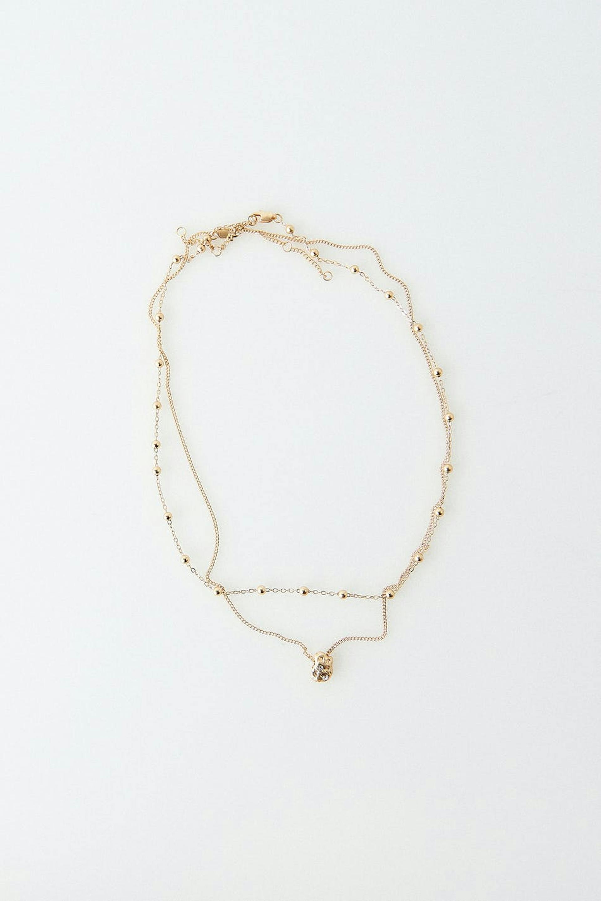 Halsband med pärlor. Smycket är guldfärgat och har två kedjor med en berlock.