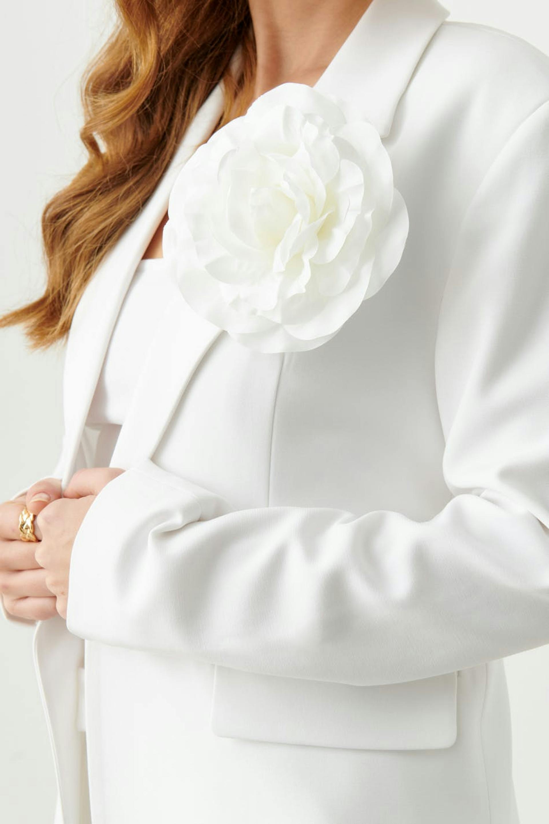 Stor brosch med form av en blomma. Broschen är vit.