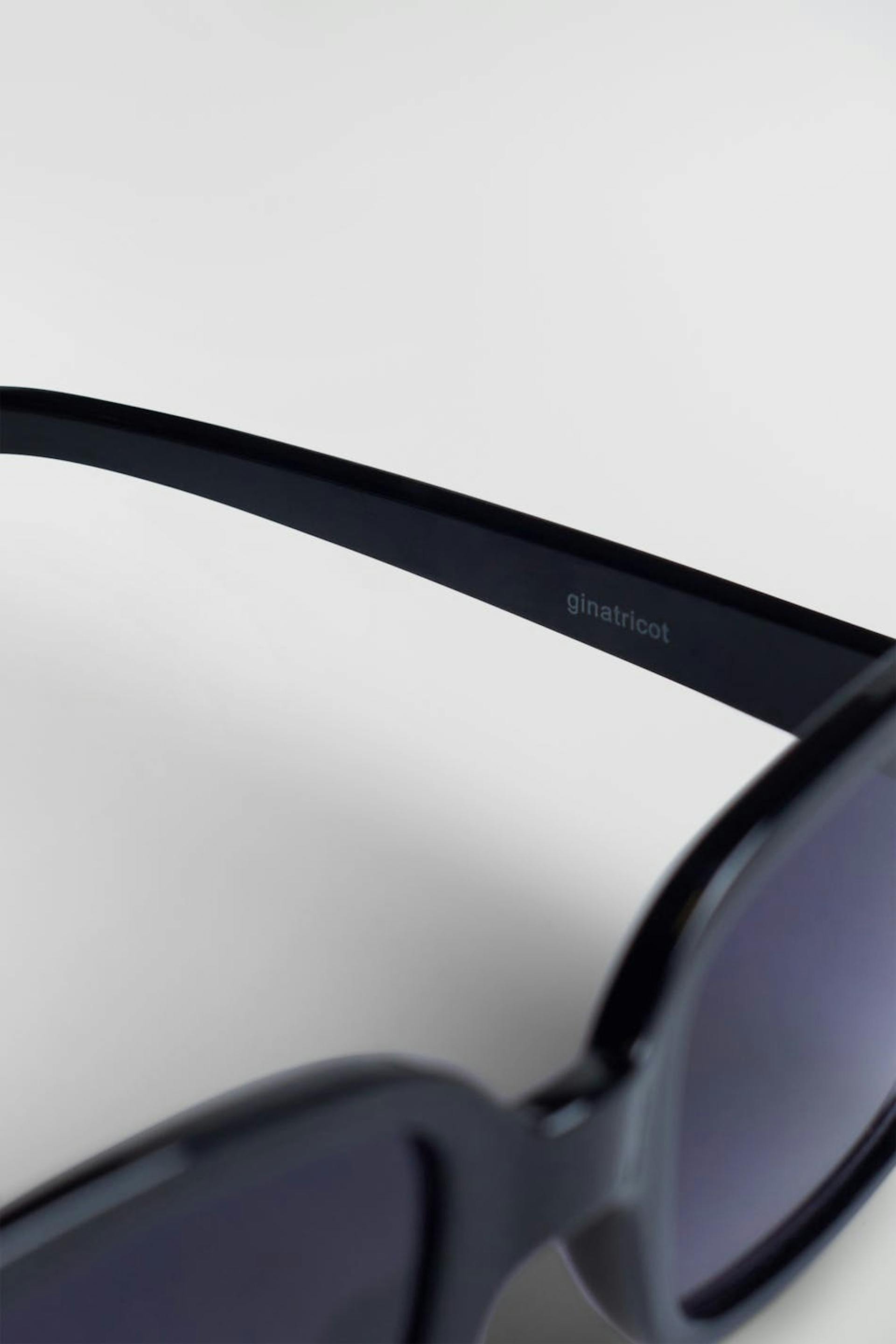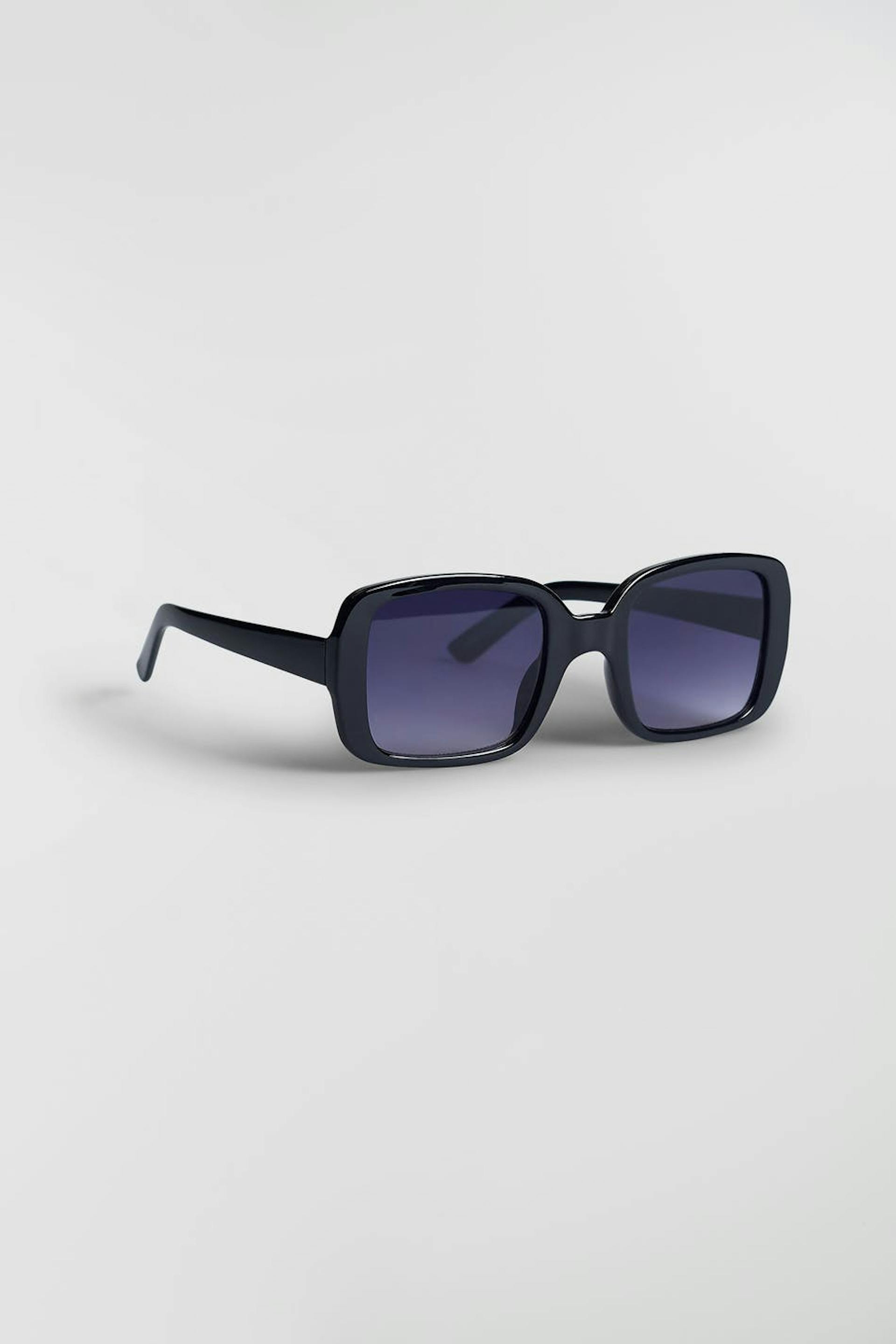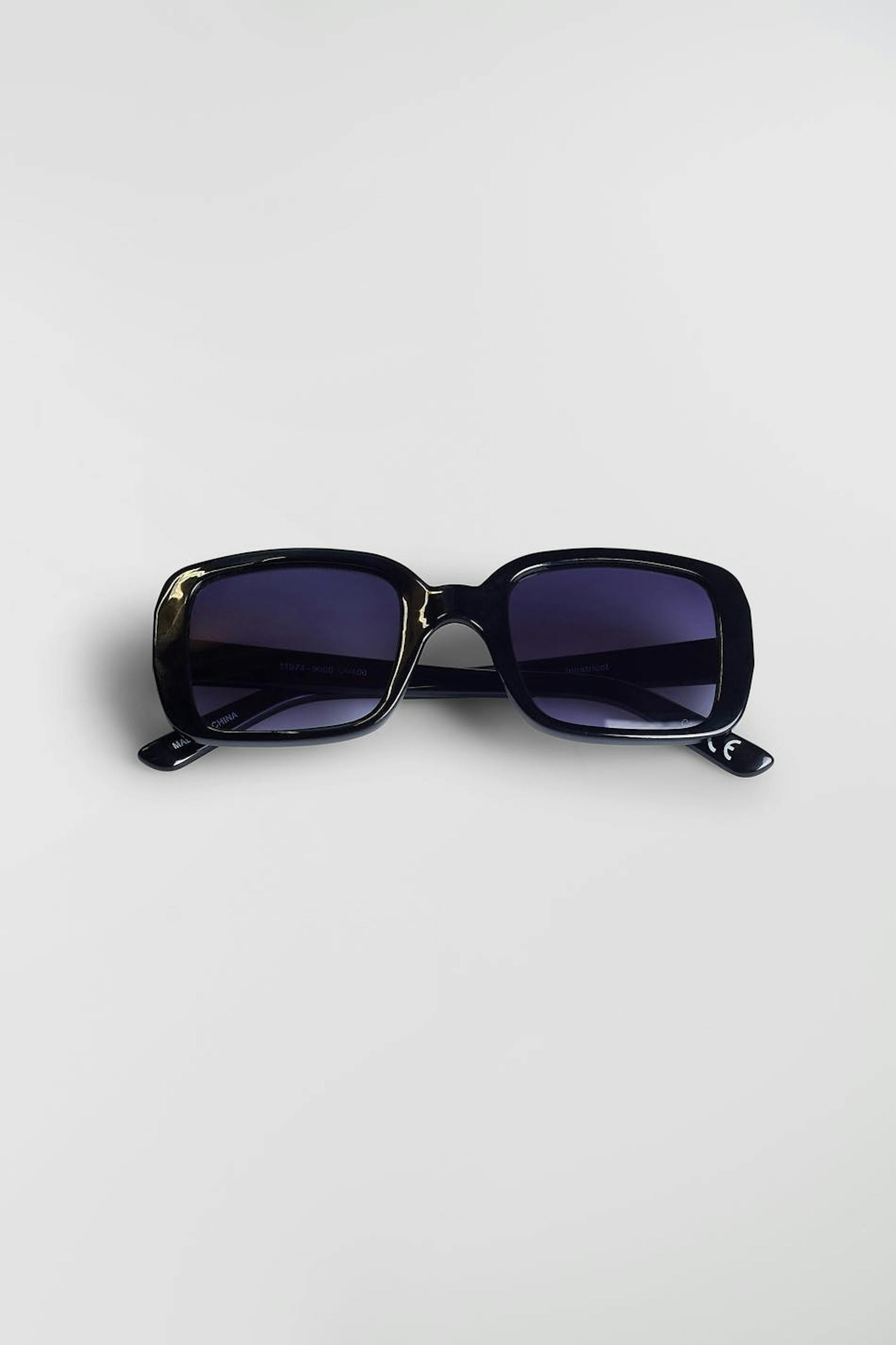 Rektangulära solglasögon. Solglasögonen är svarta. De är gjorda av plast.