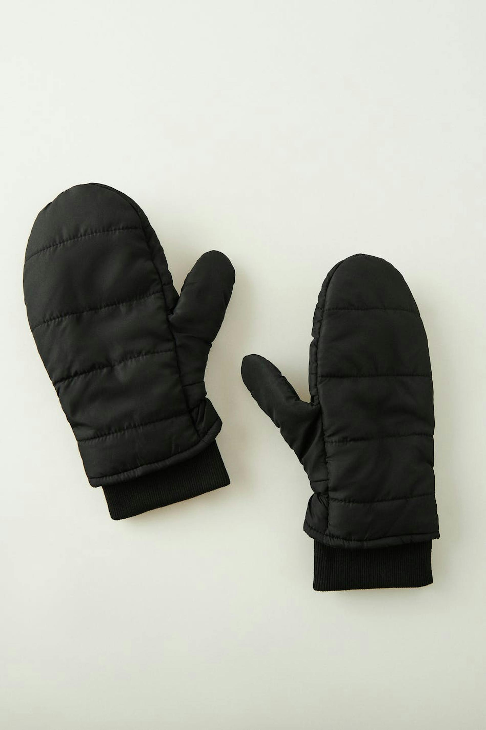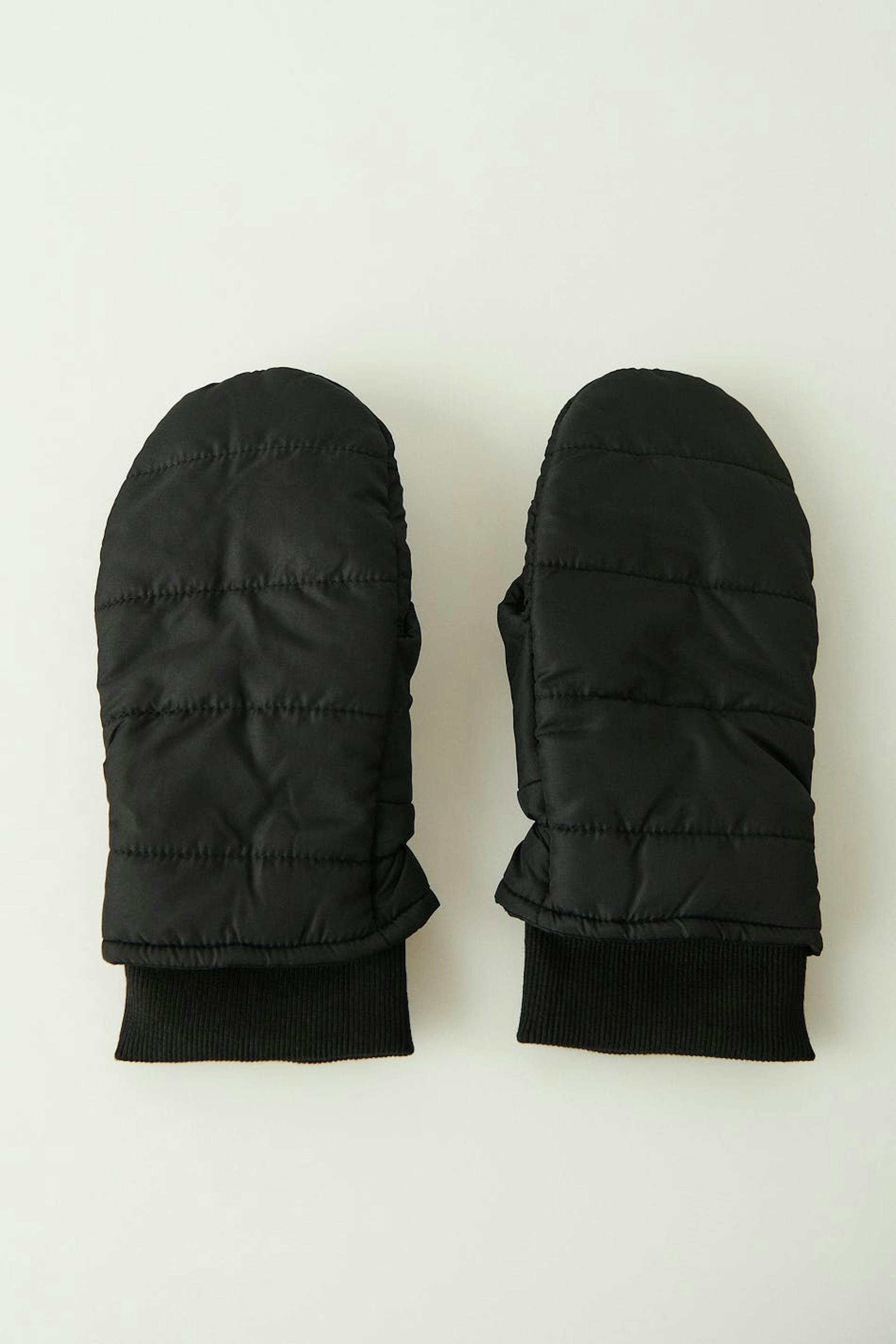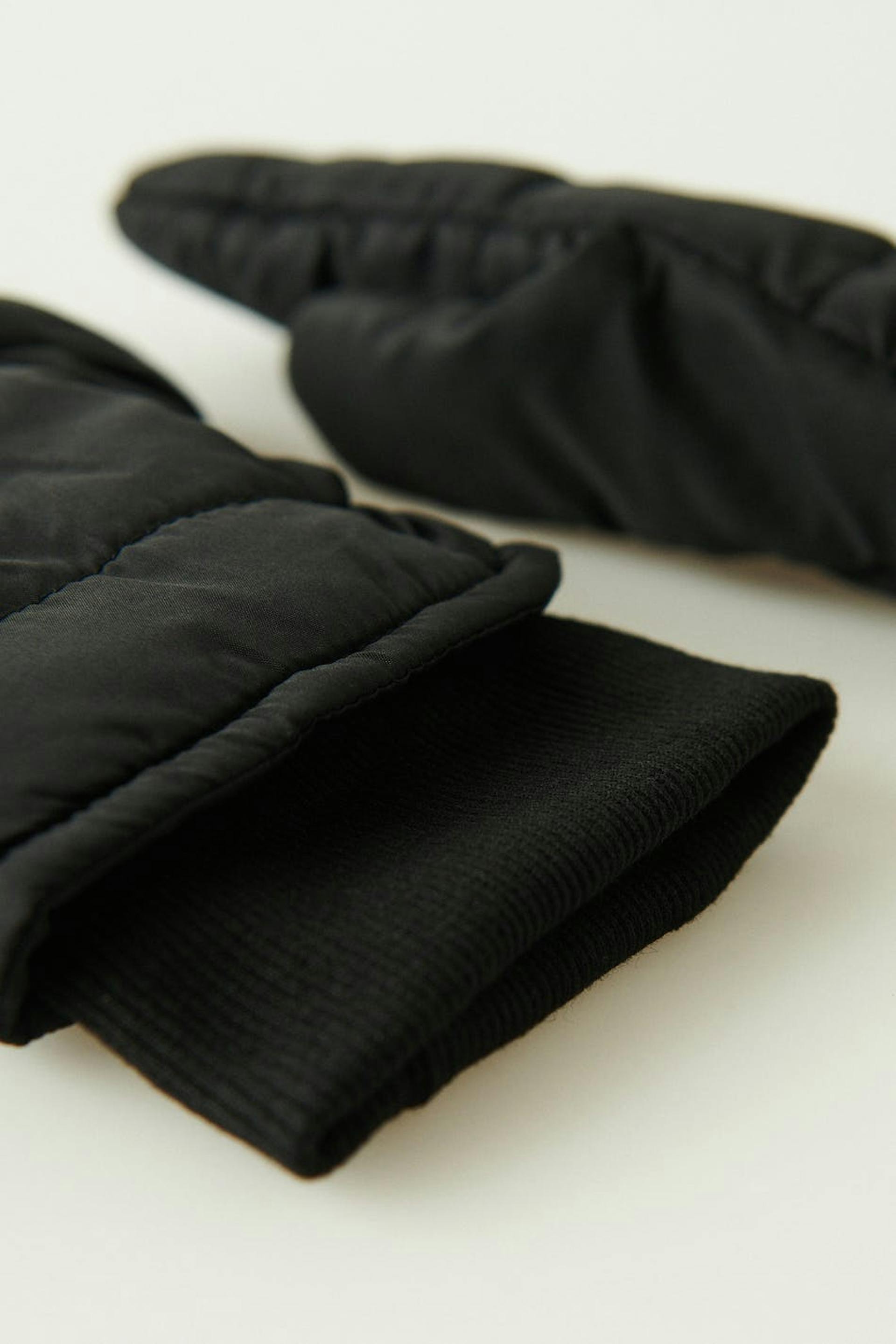 Vadderade tumvantar i polyester med ribbad mudd vid handleden. Vantarna är svarta.