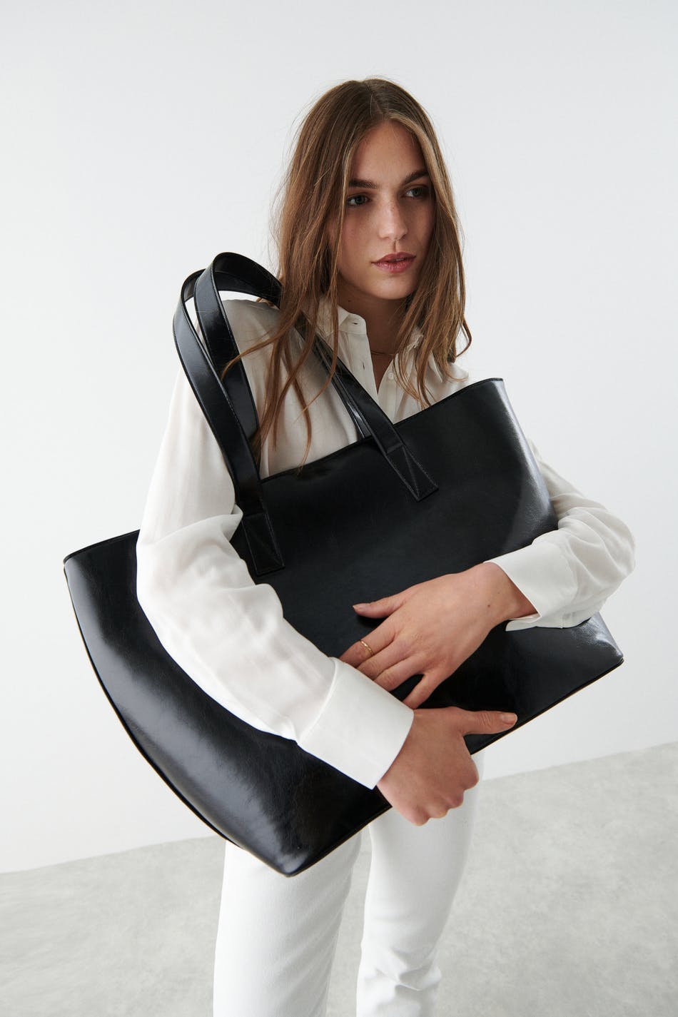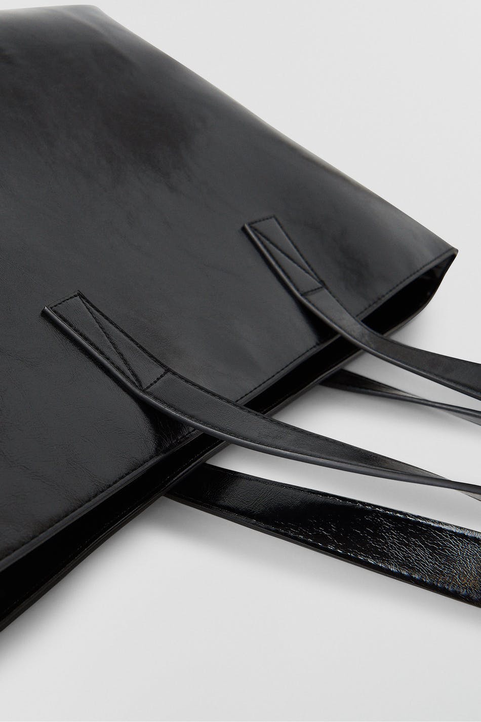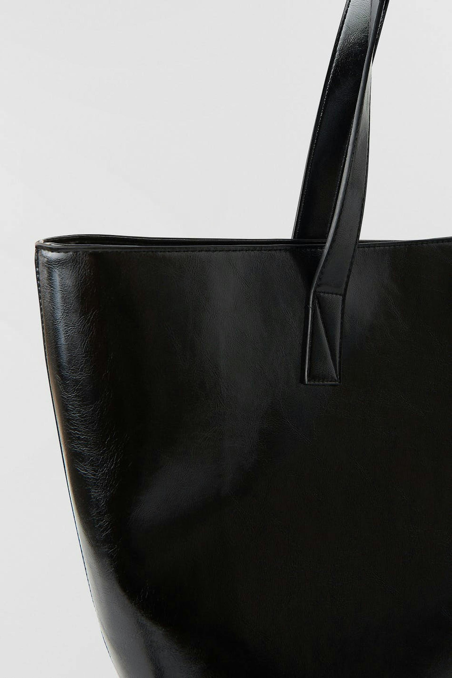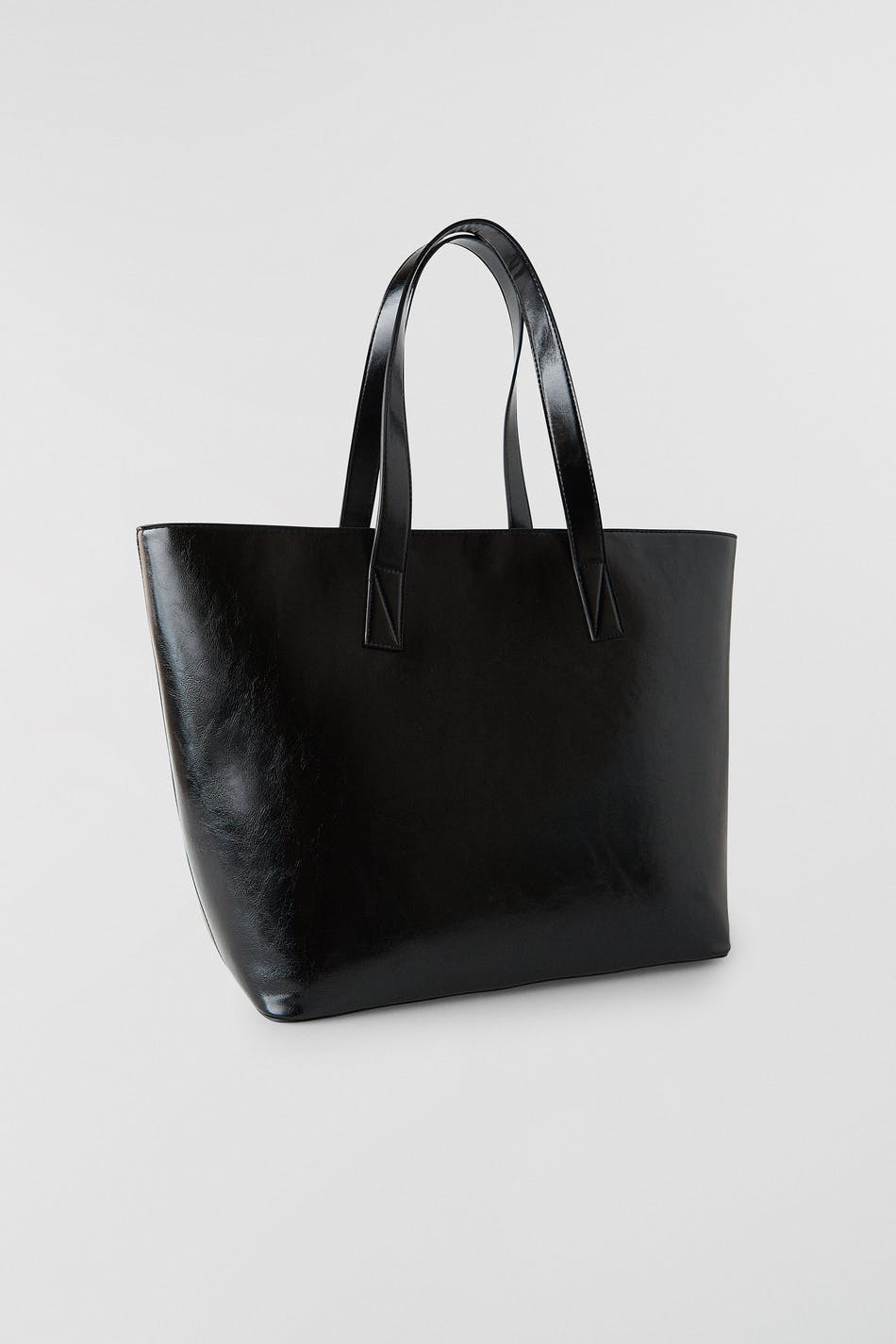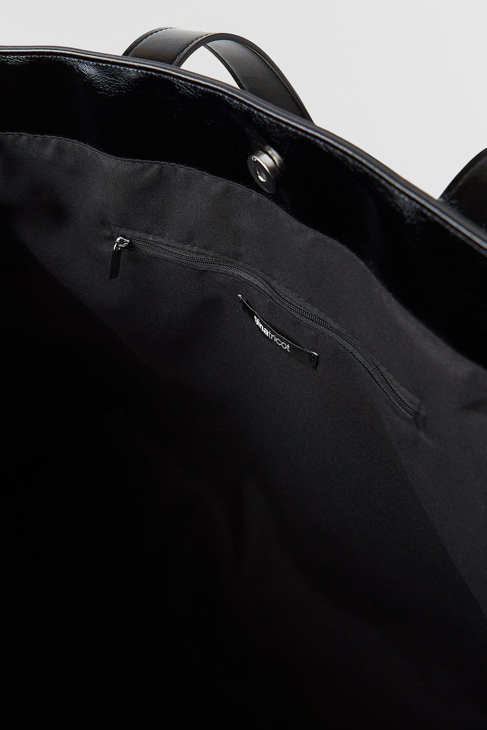Väska med en rymlig shopper-design. Väskan är svart och har ett glansigt fusklädermaterial. Den har två handtag upptill, ett magnetspänne vid öppningen och ett dragkedjat innerfack.