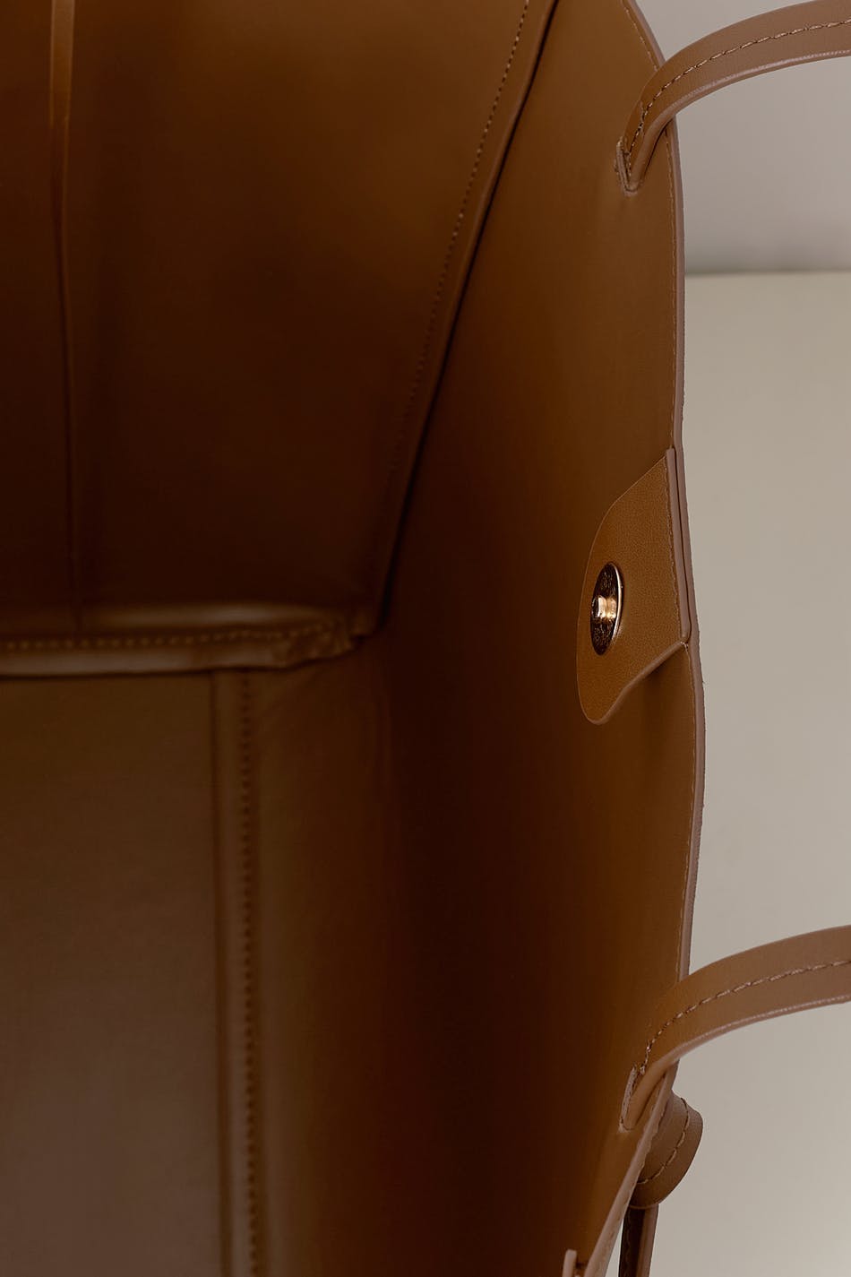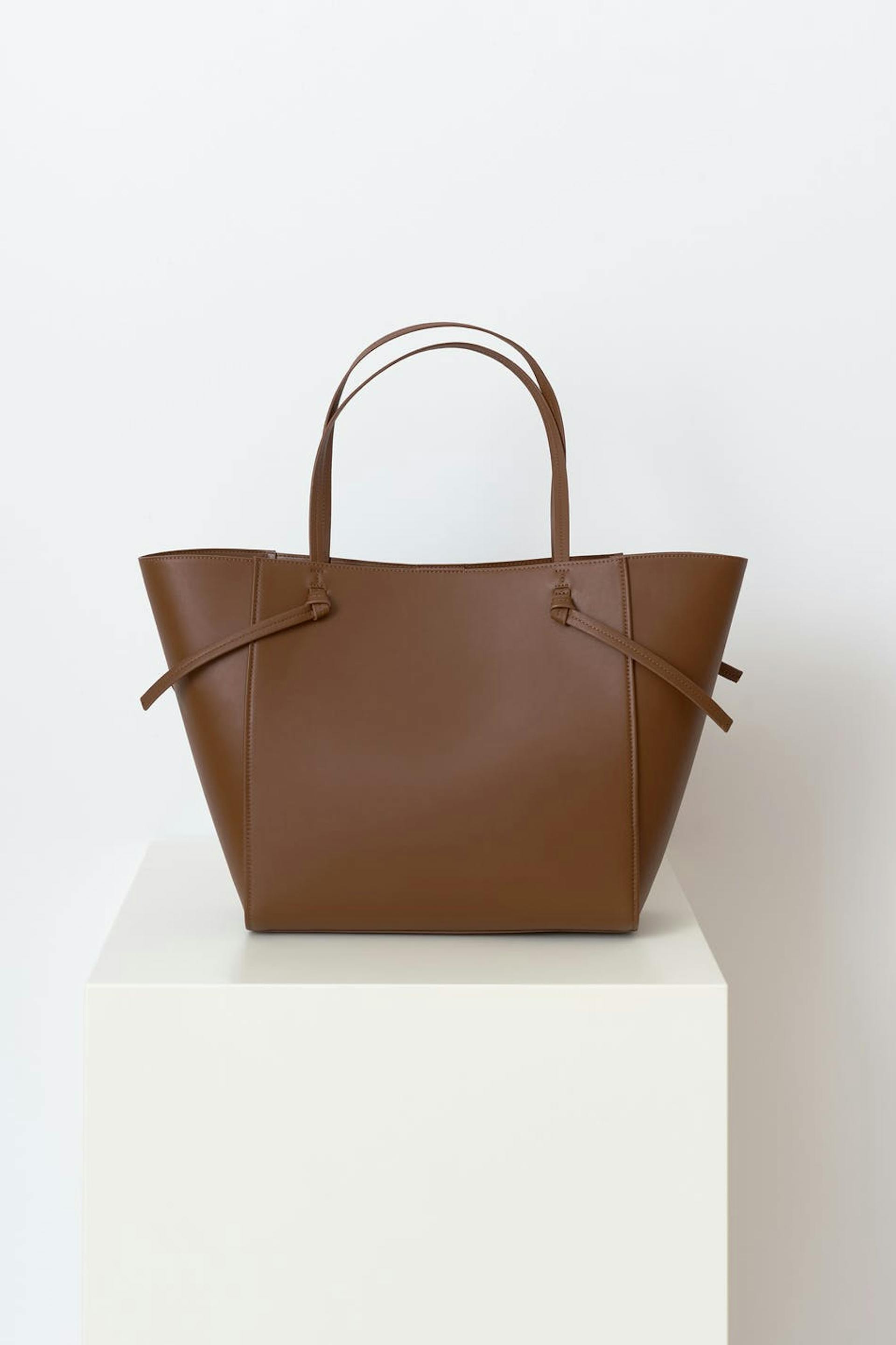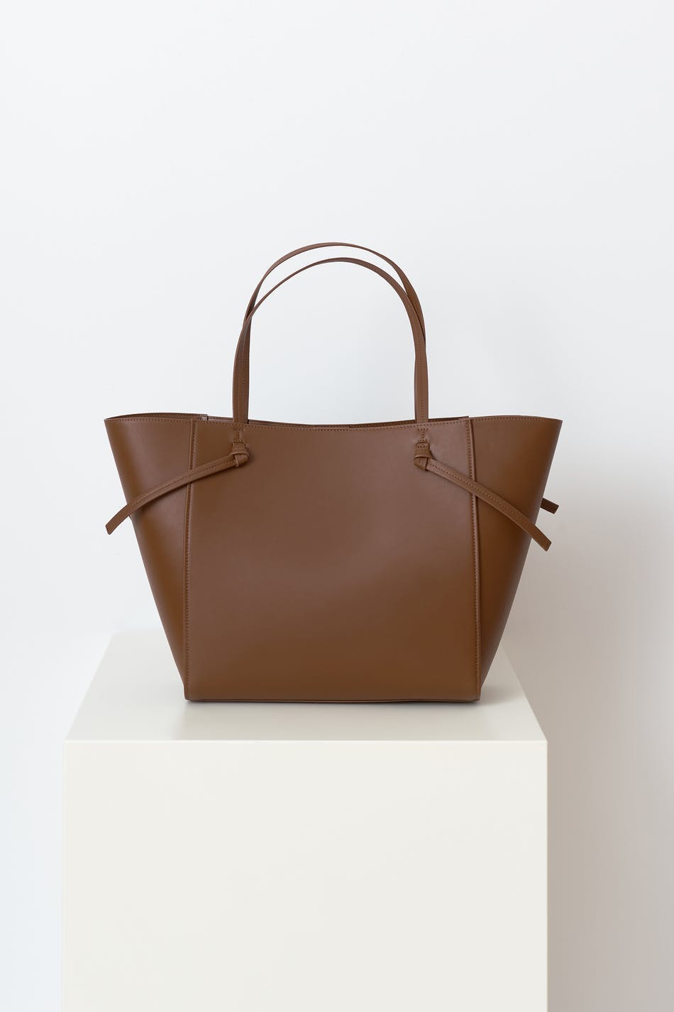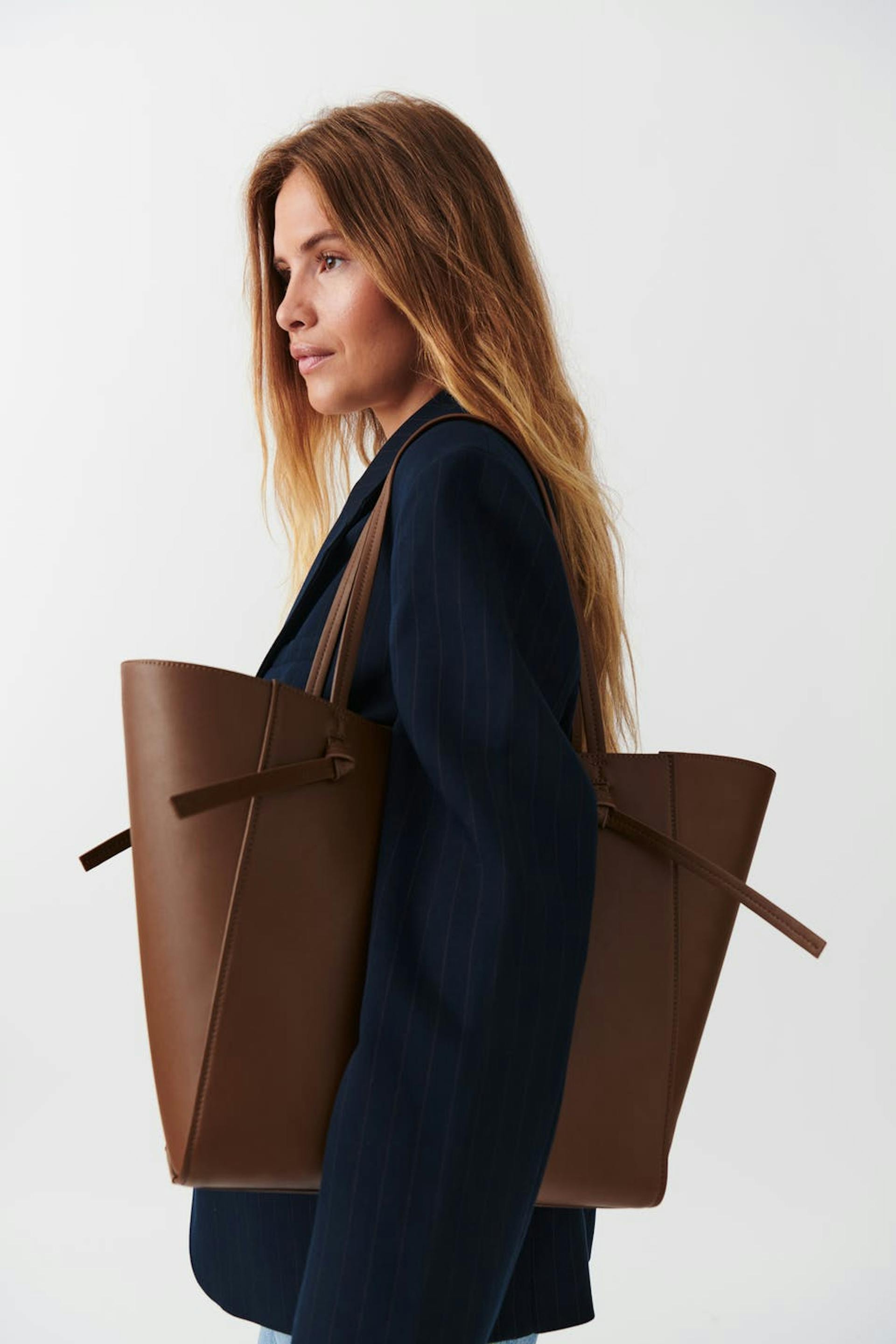 Stor väska i läderimitation med rymligt huvudfack. Väskan är brun och har reglerbara handtag med knutar. Den har magnetknäppning.