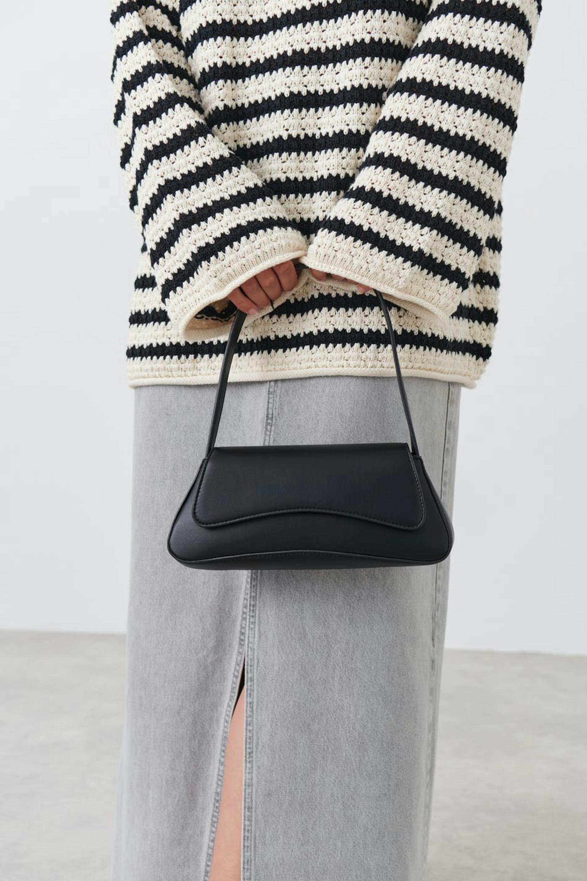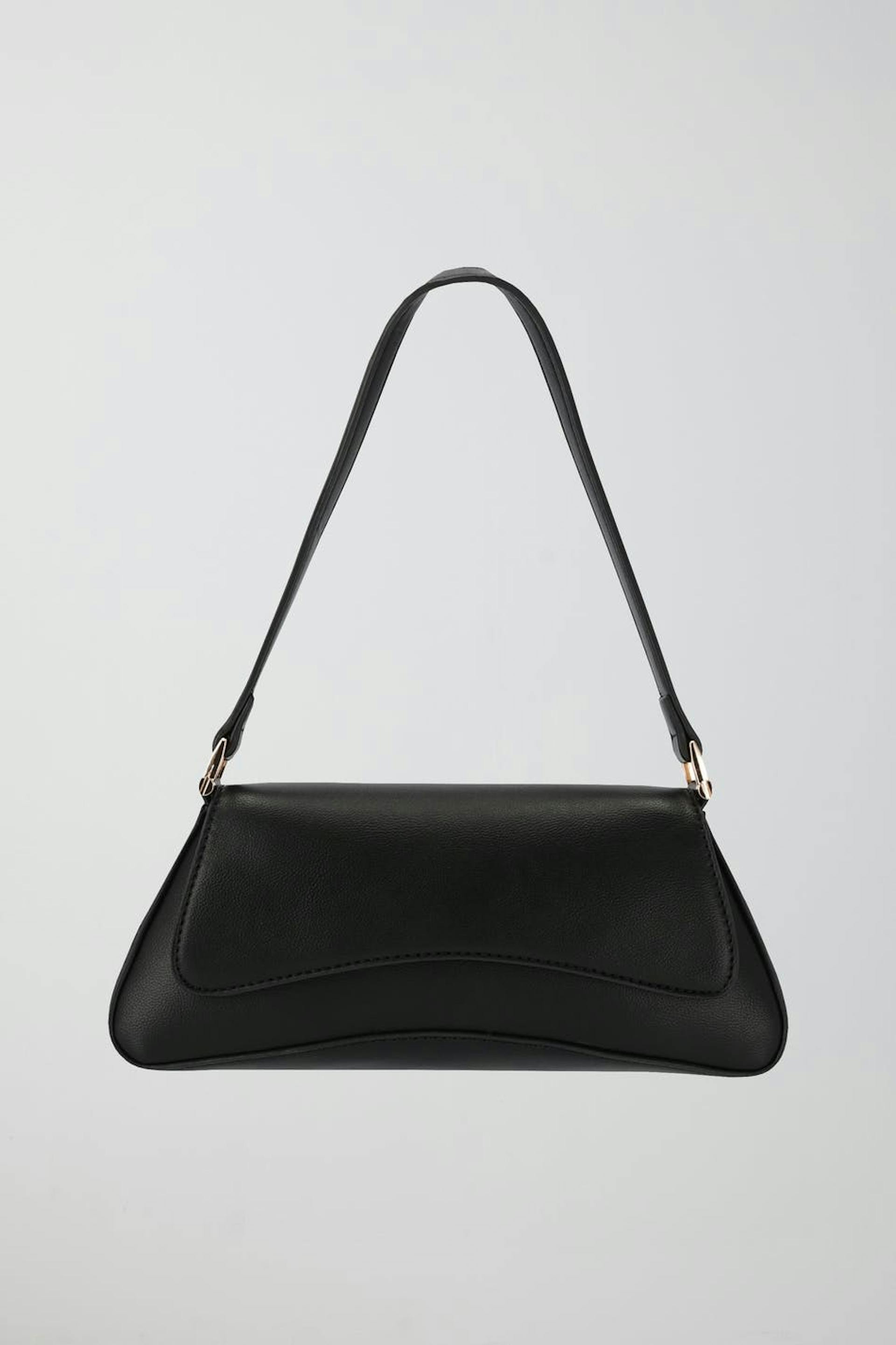 Väska i läderimitation med lock. Väskan är svart och har sportig design. Den har kort axelrem och stängning med magnetspänne.