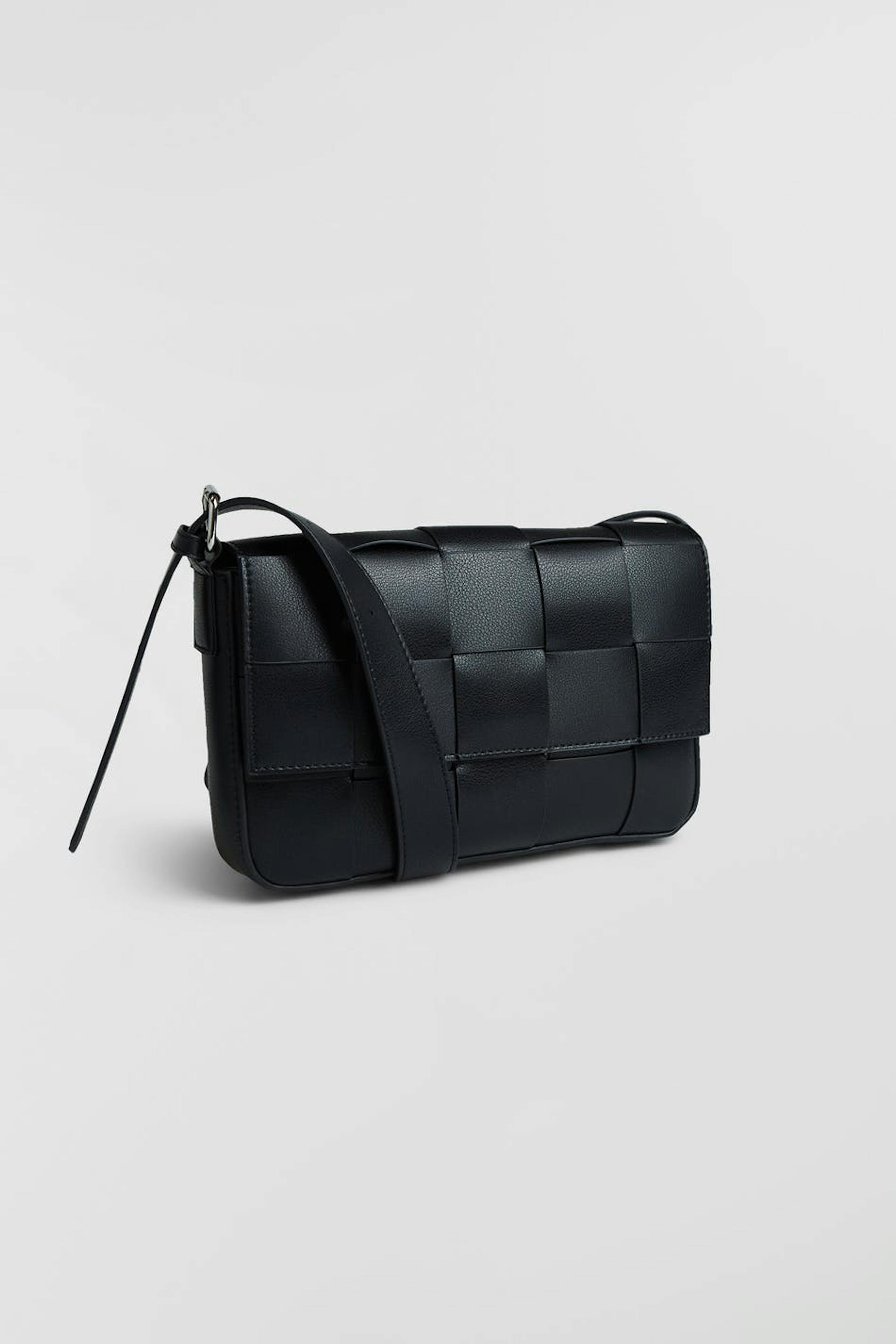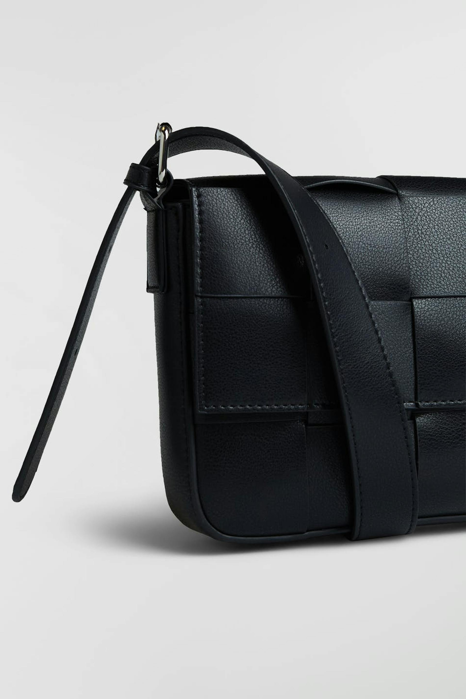 Flätad väska med en justerbar axelrem. Väskan är svart. Den är gjord av PU.