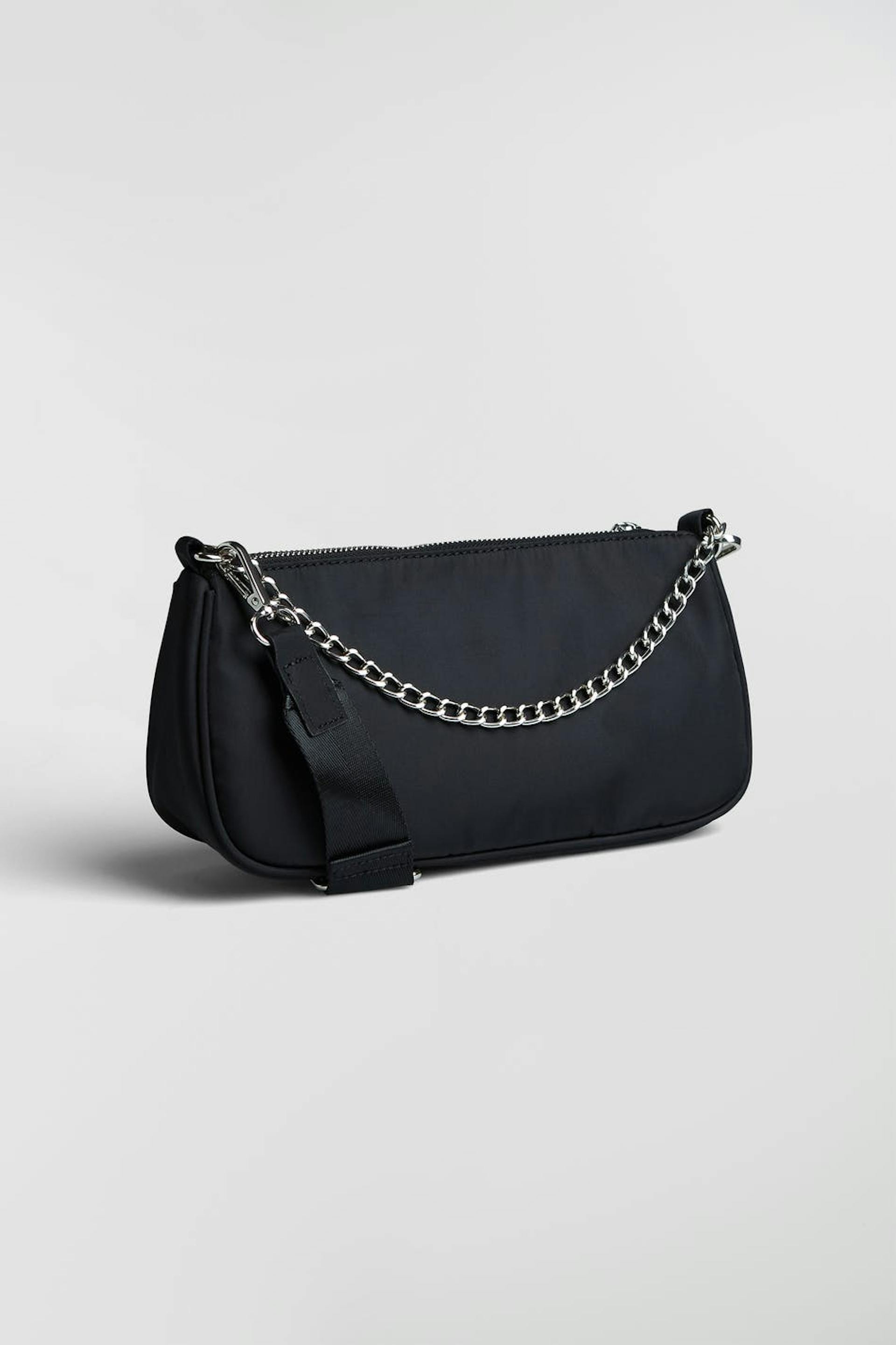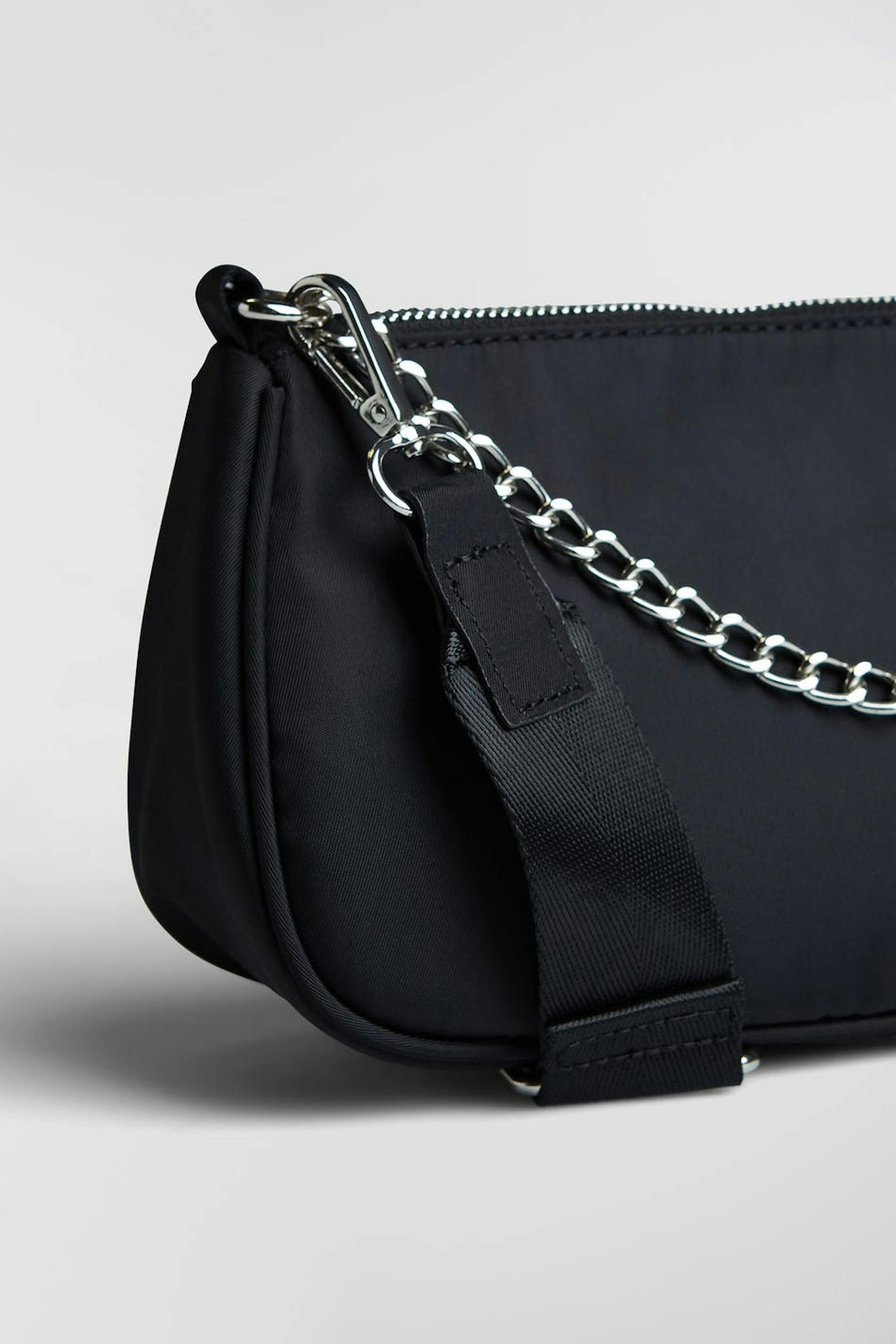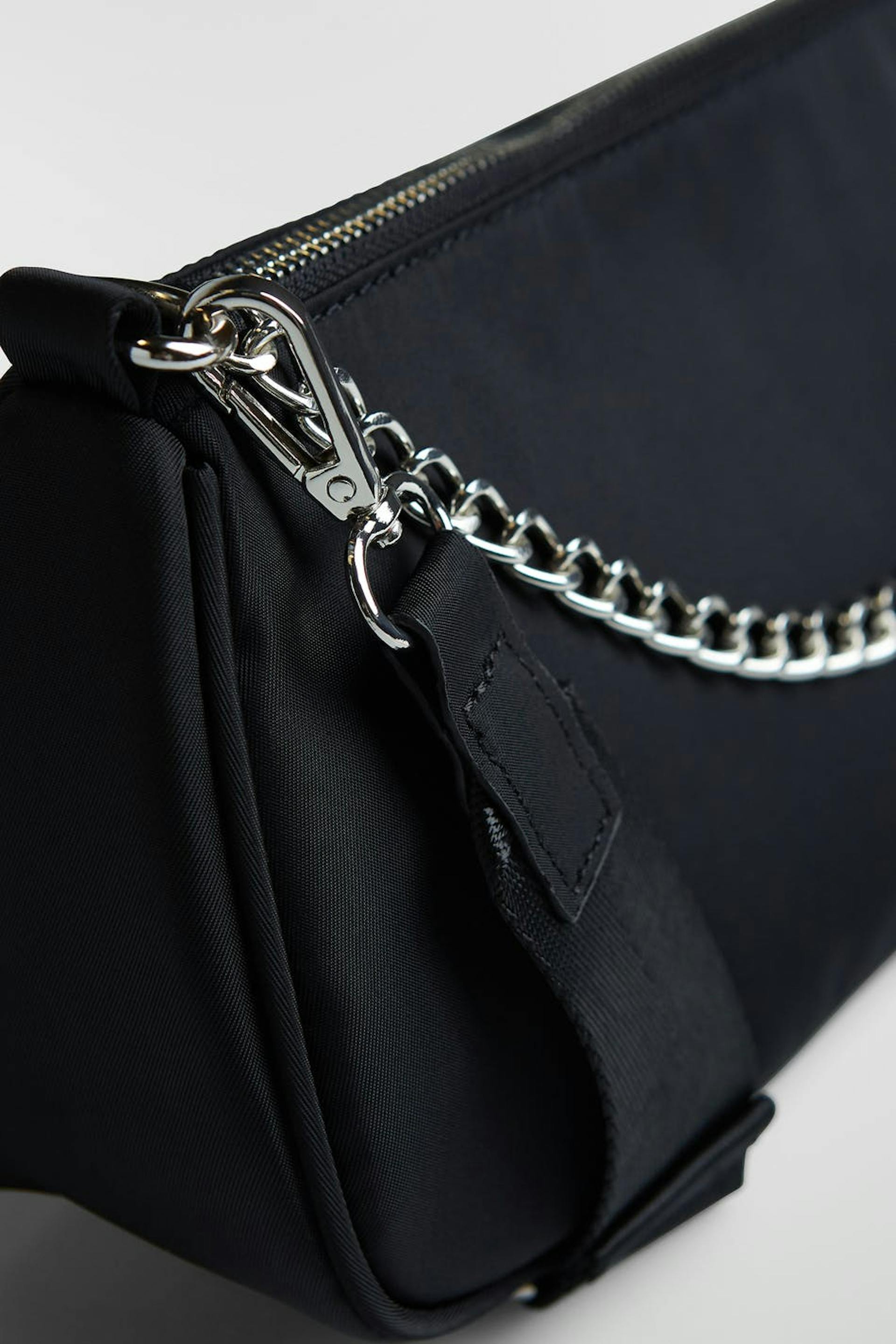 90-talsinspirerad väska med en kedja. Väskan är svart och liten och har en axelrem.