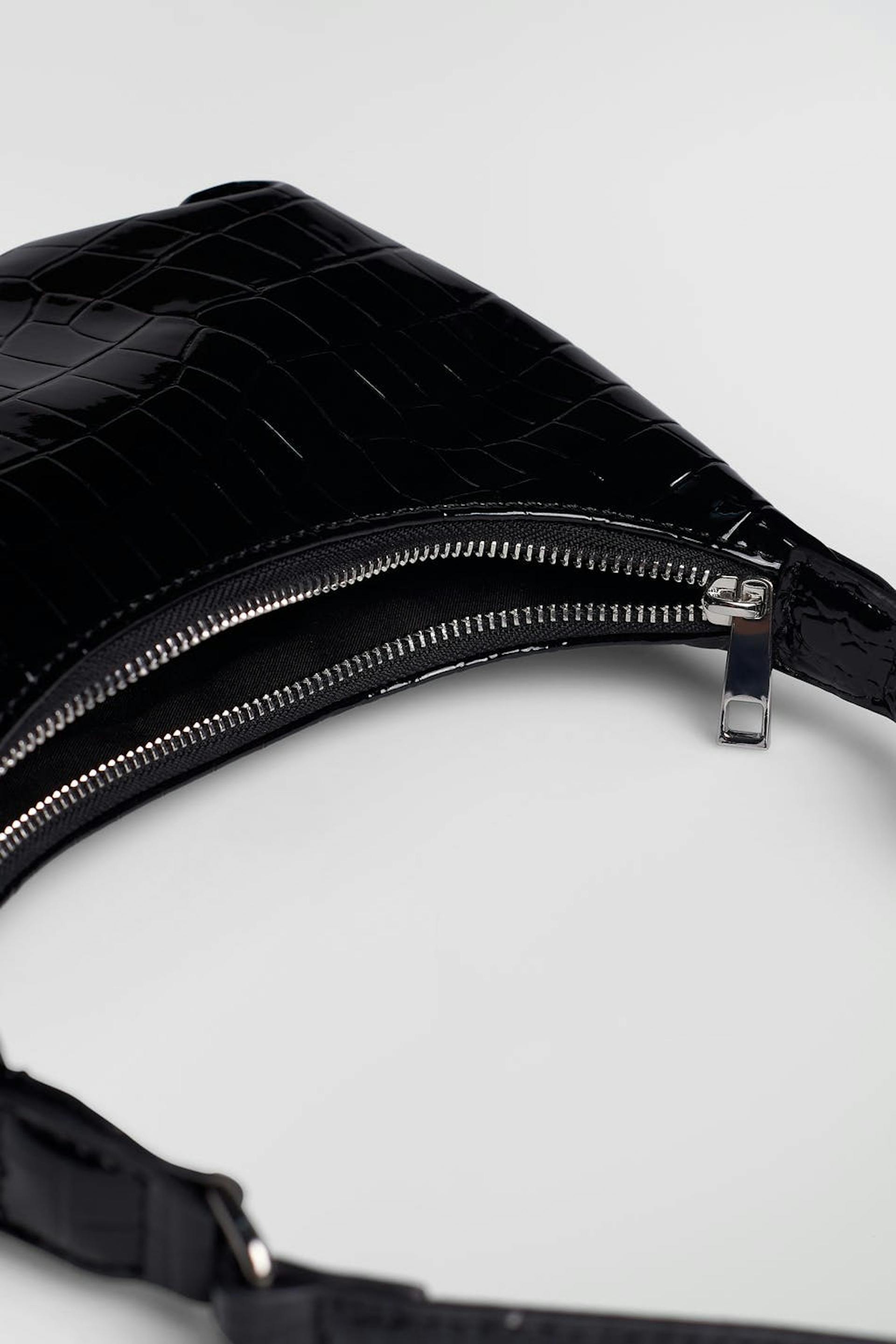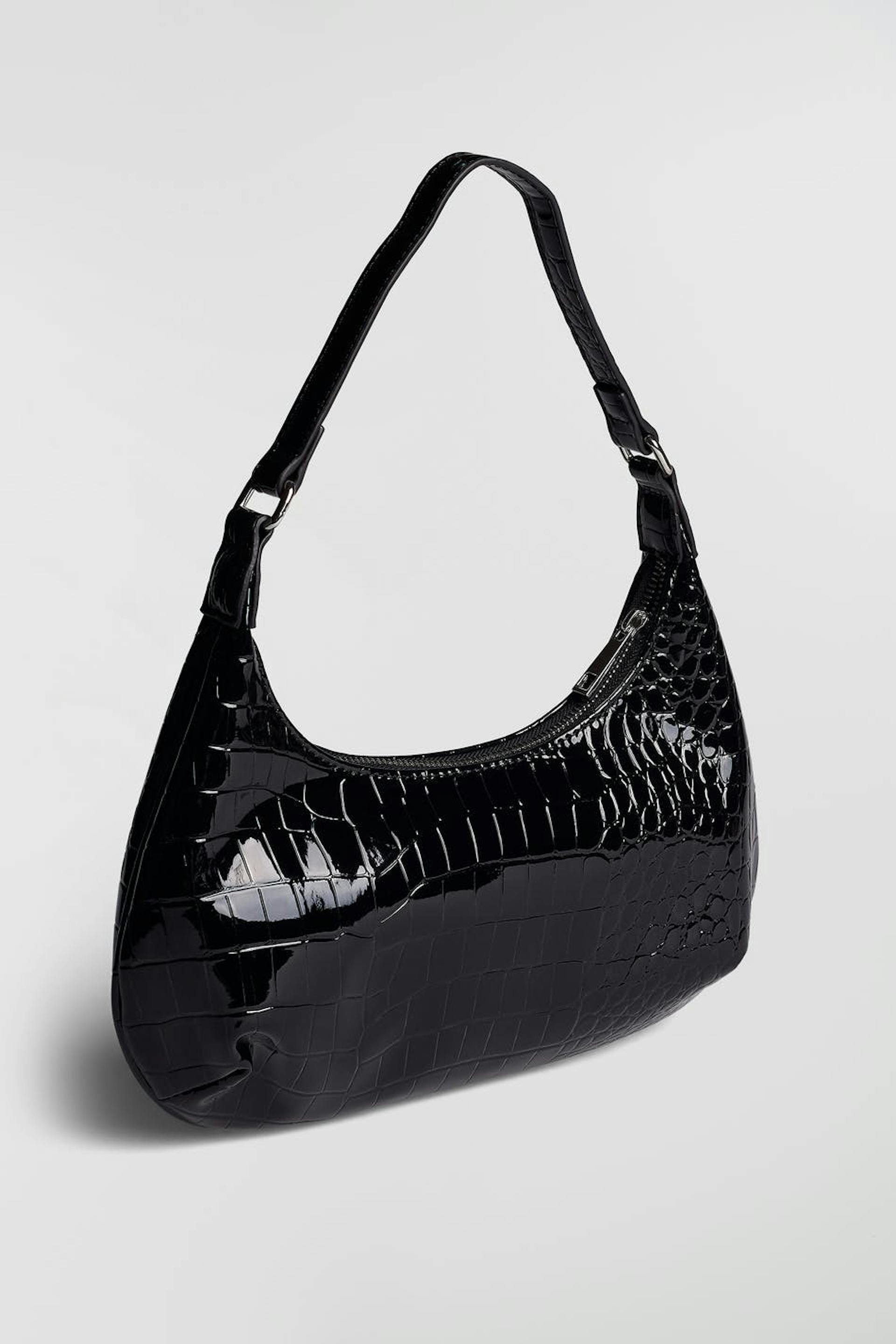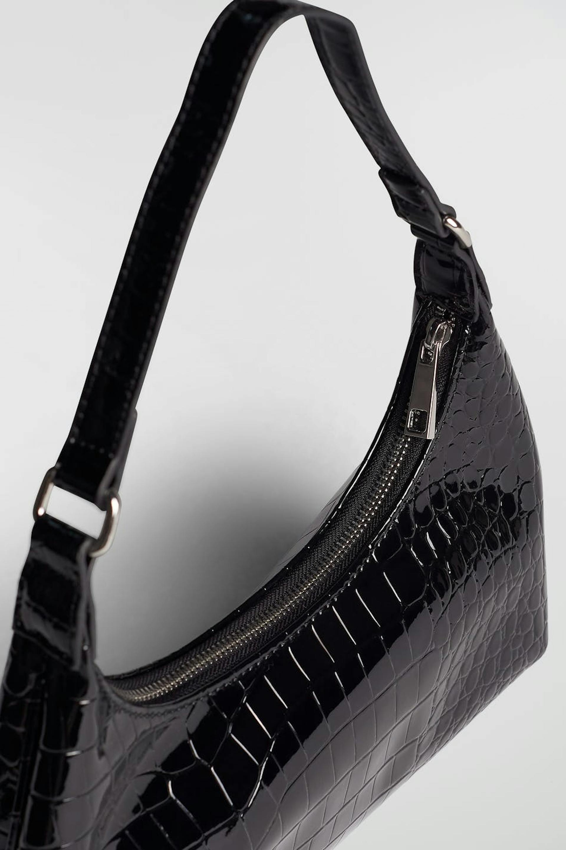 Krokodilmönstrad väska med en kort axelrem. Väskan är svart och har en dragkedja på ovansidan.