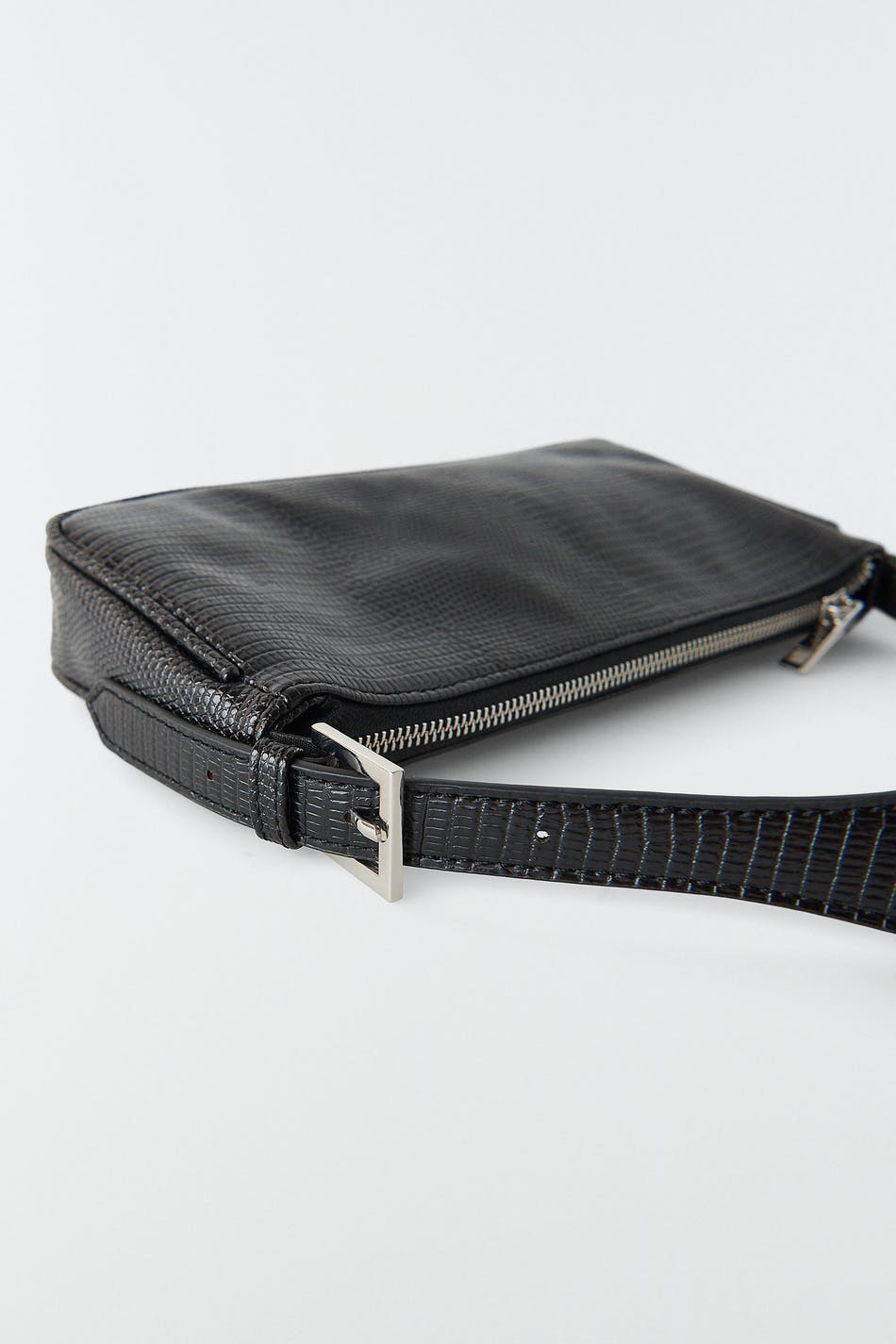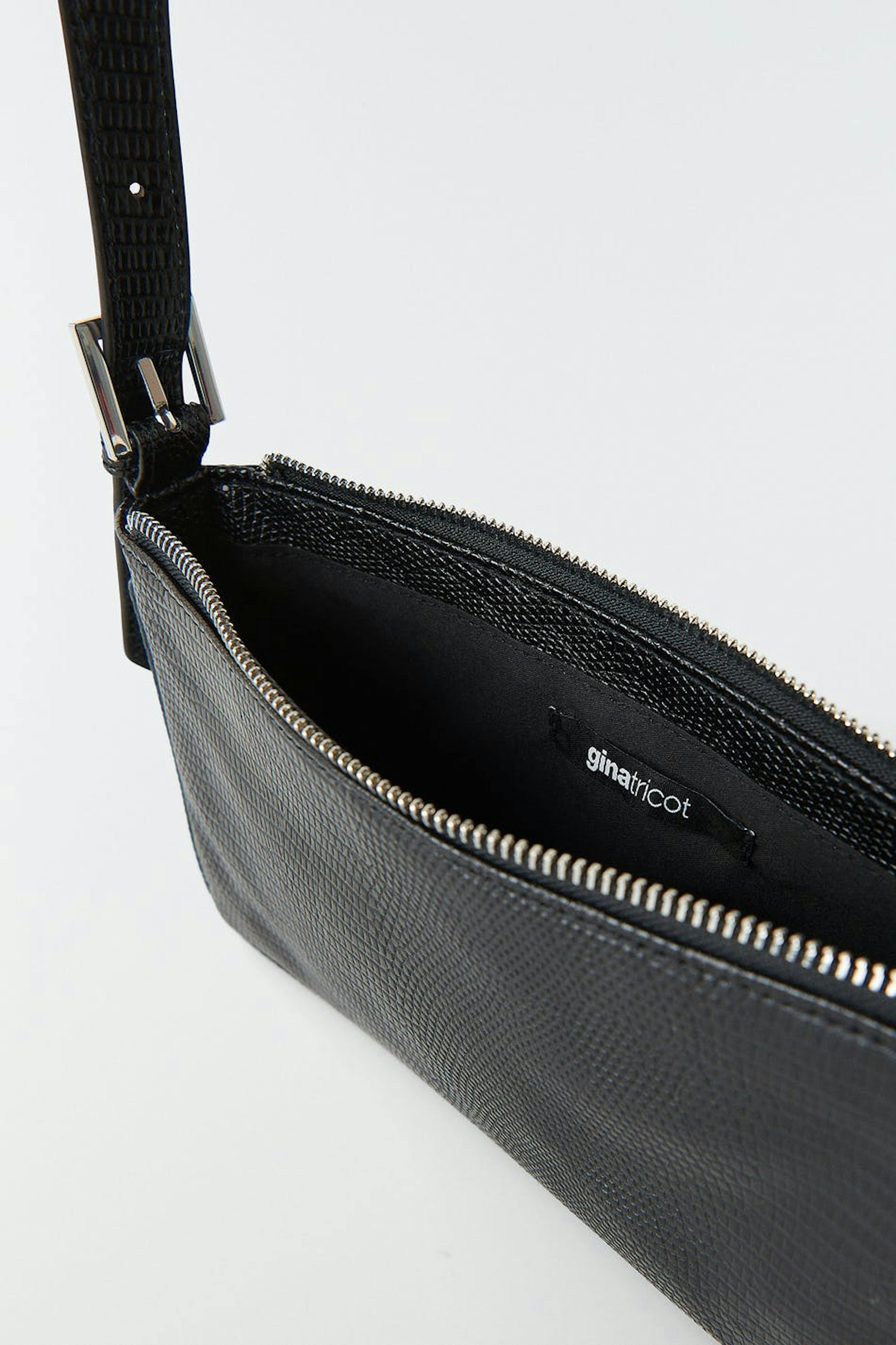 Baguetteväska med en kort, justerbar axelrem. Väskan är svart och har en dragkedja upptill.