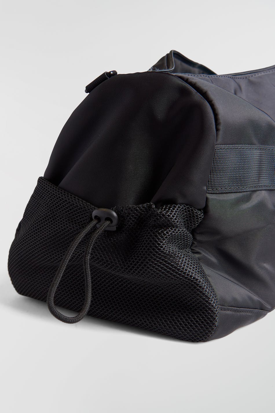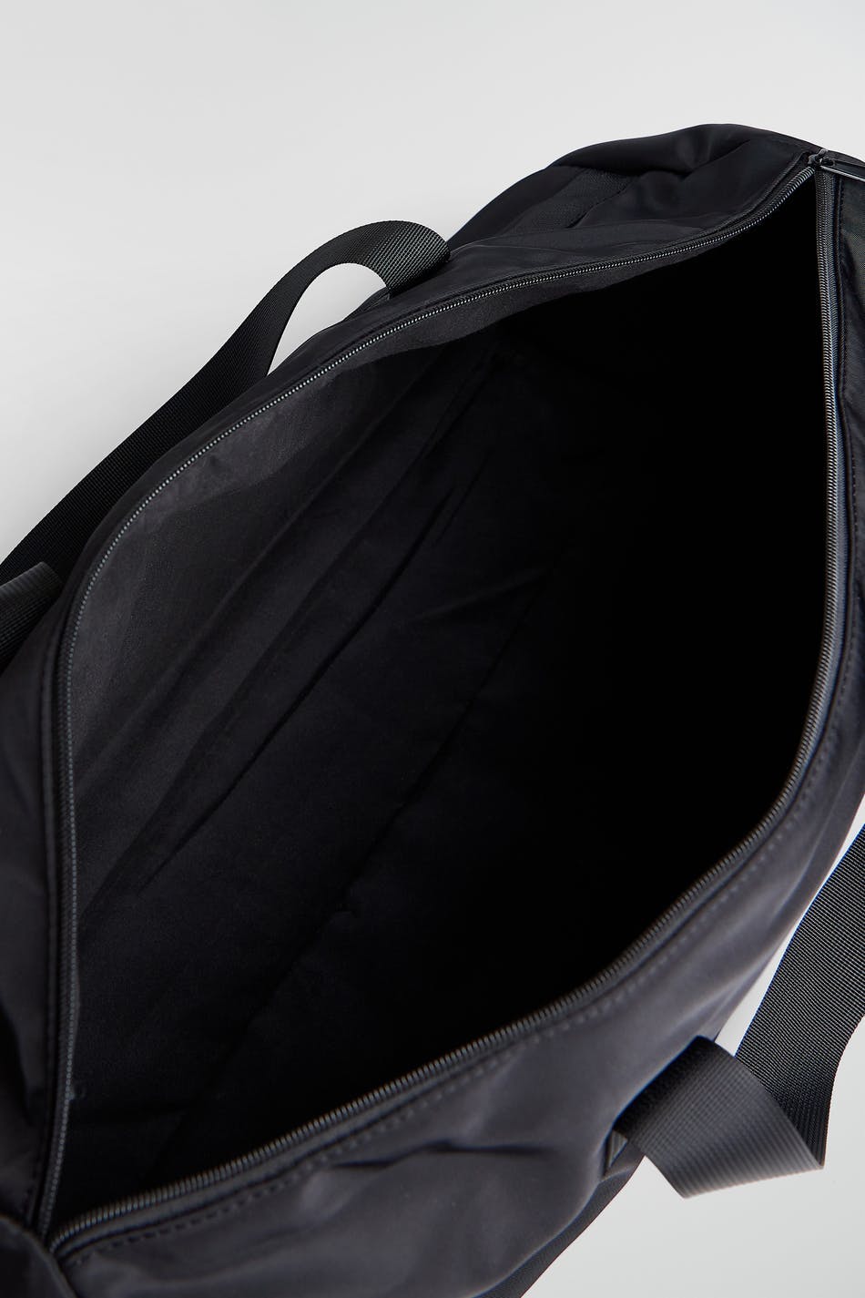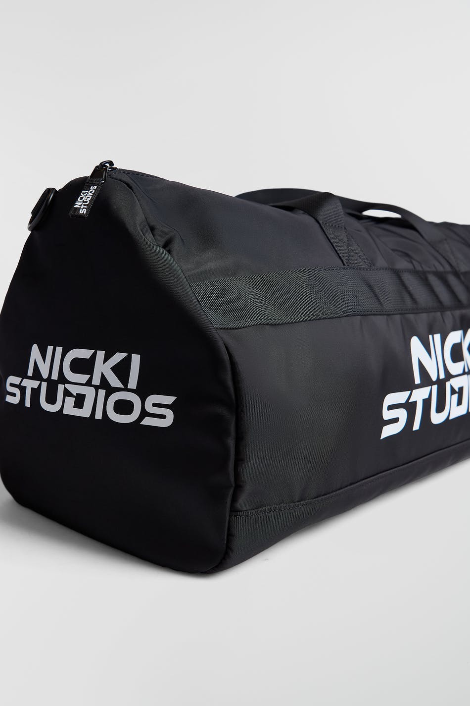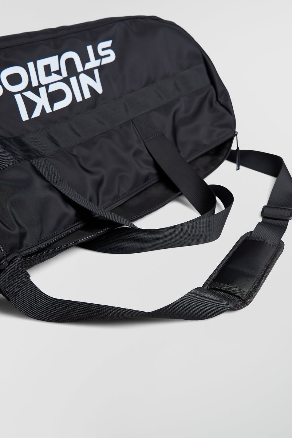 Nicki Studios X Gina Tricot. Vadderad sportväska med stort huvudfack med dragkedja och avtagbar axelrem. Väskan är svart och har en stor logotyp framtill. Den har handtag upptill och innerfack.