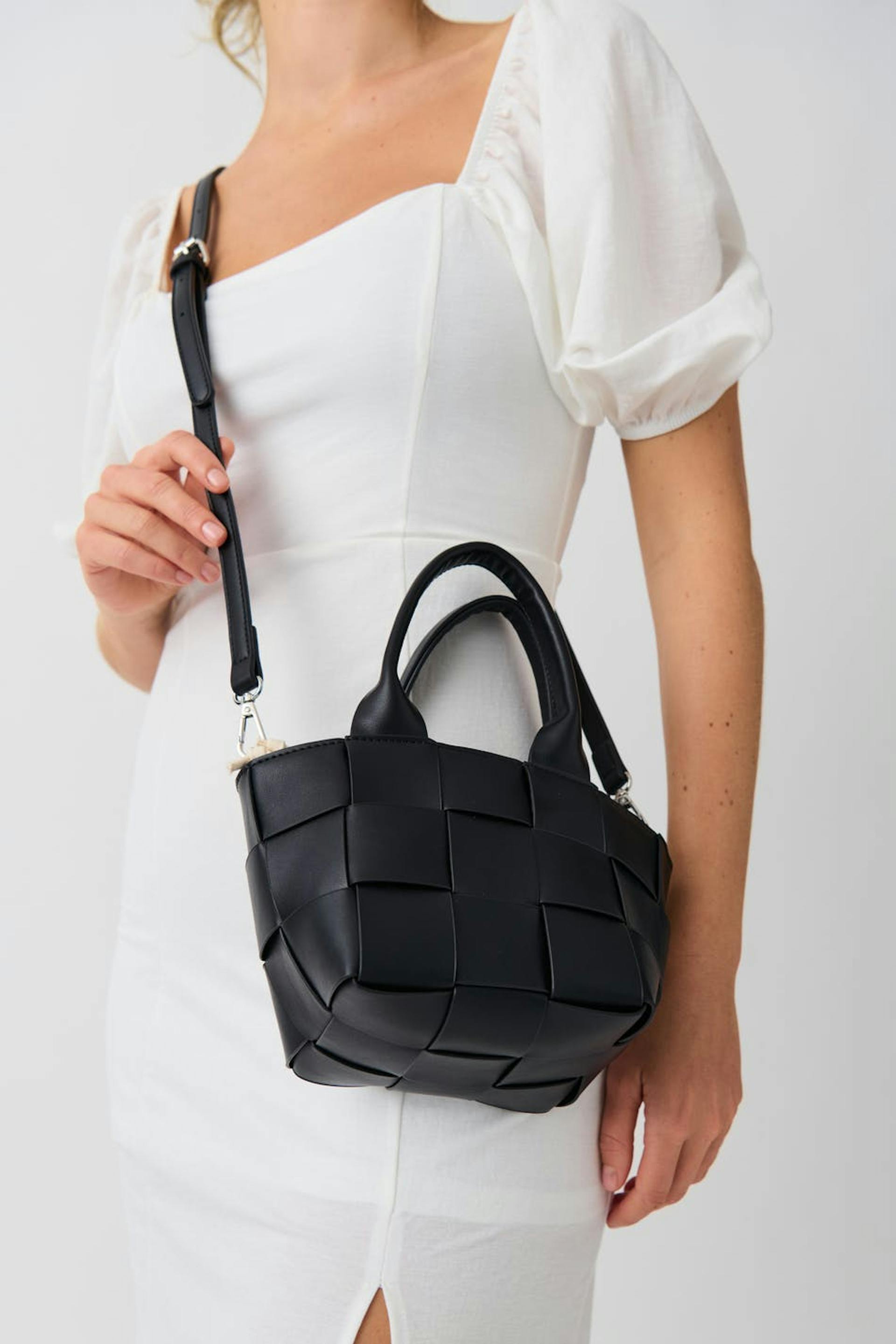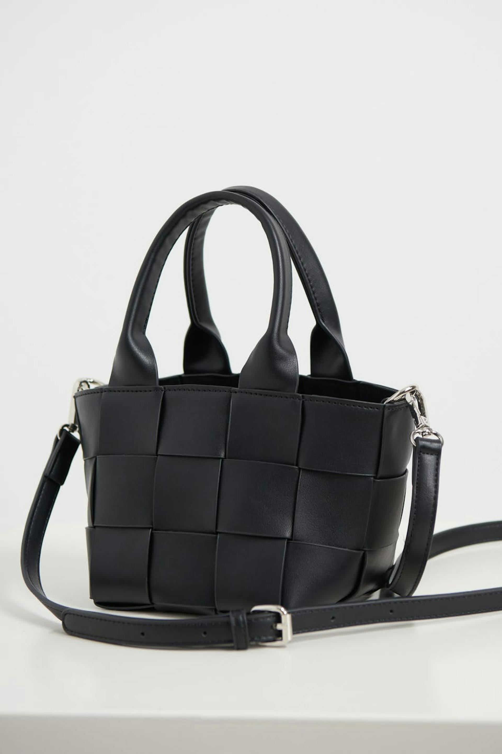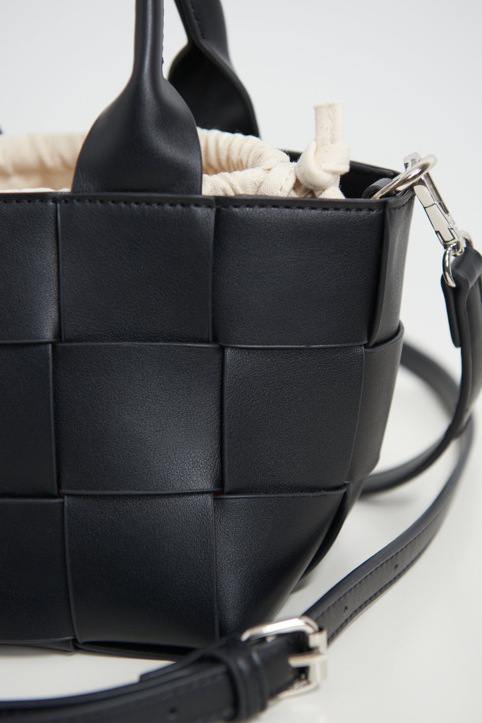 Flätad väska i läderimitation med dubbla handtag upptill. Väskan är svart och har silverdetaljer. Den har lång, avtagbar axelrem och påsväska i linne inuti.