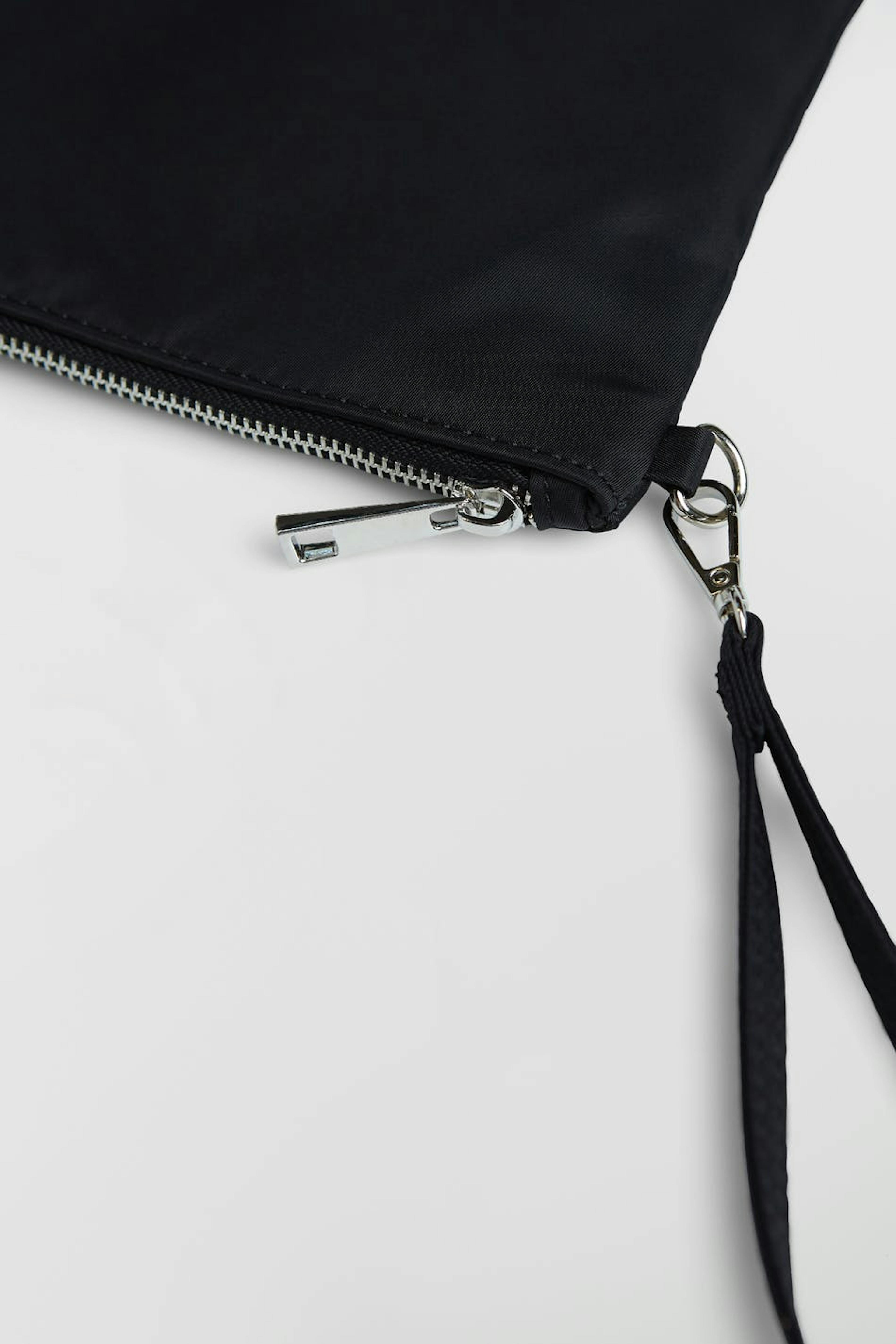 Kuvertväska med en rem på kanten. Kuvertväskan är svart och har en stängning med en dragkedja. Den är gjord av nylon.
