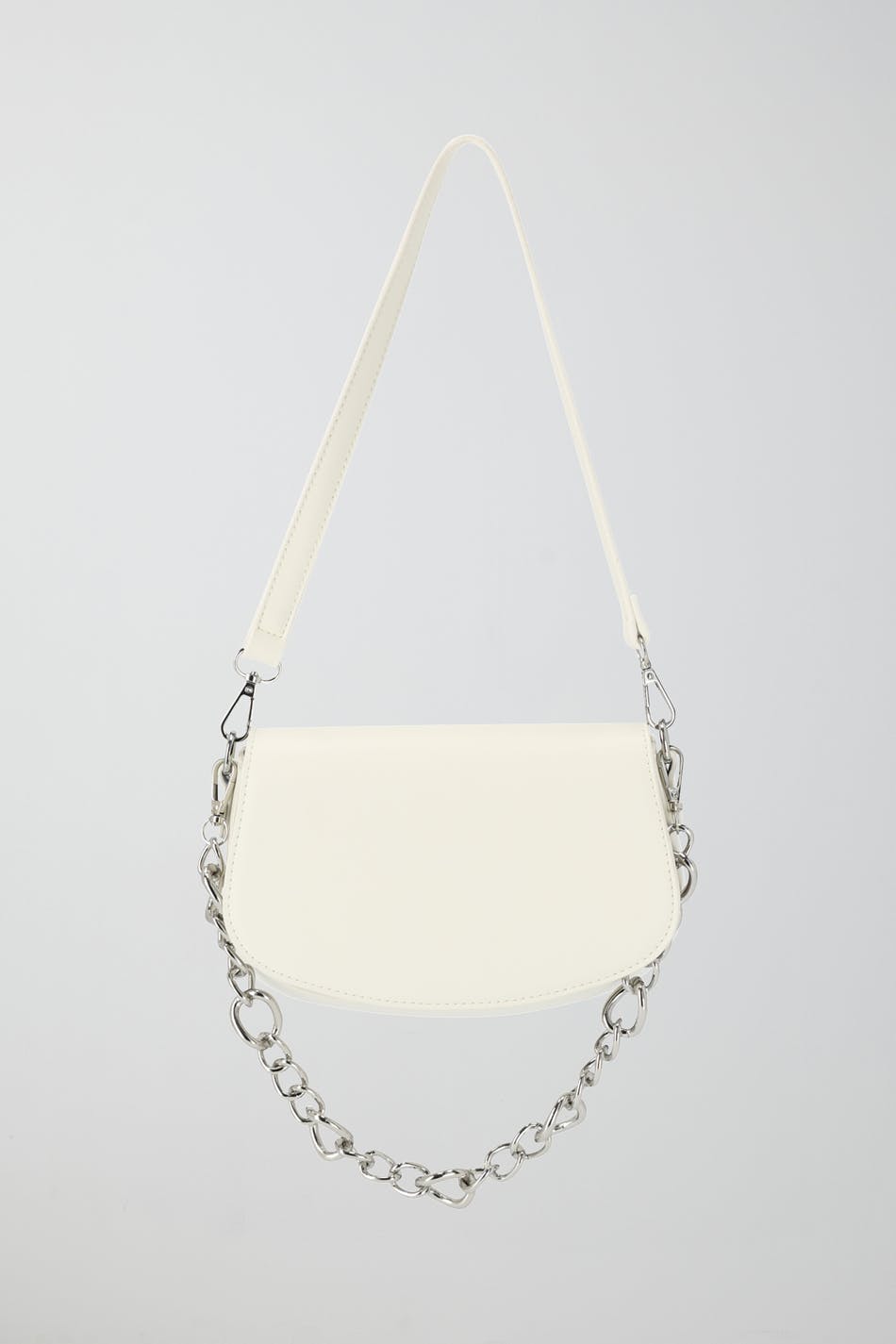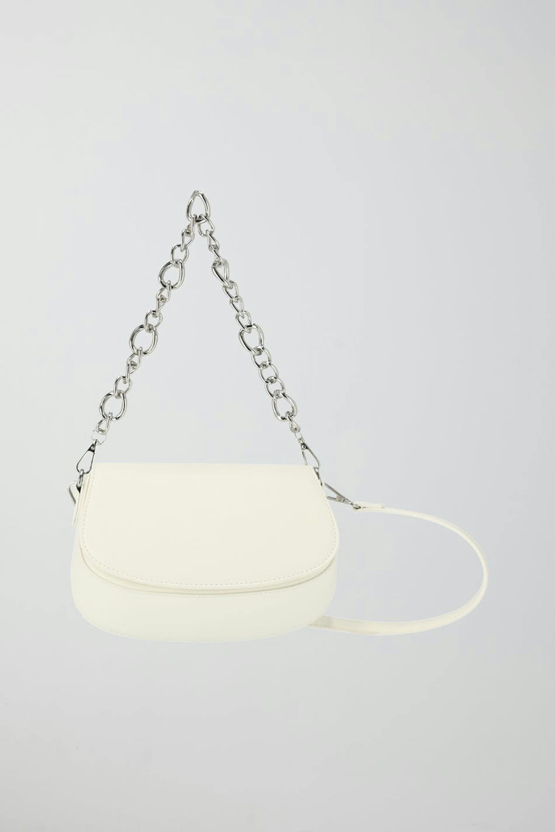 Axelremsväska i läderimitation med avtagbar metallkedja. Väskan är vit och har lock. Den har avtagbar axelrem och stängning med magnetfäste.