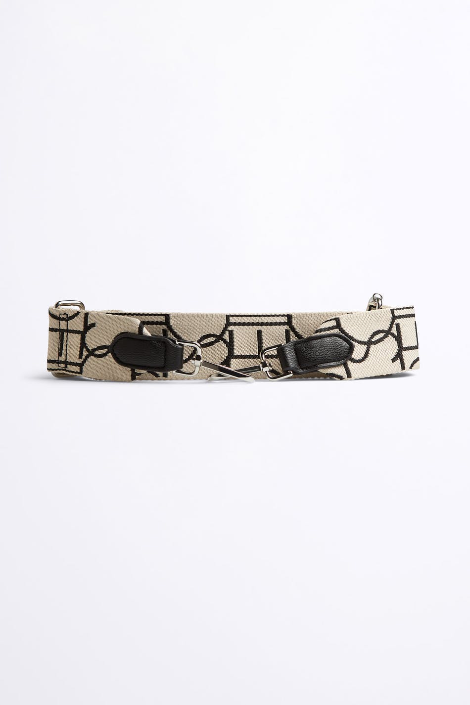 Rem med en justerbar längd. Remmen är beige och har en hake på varje sida.