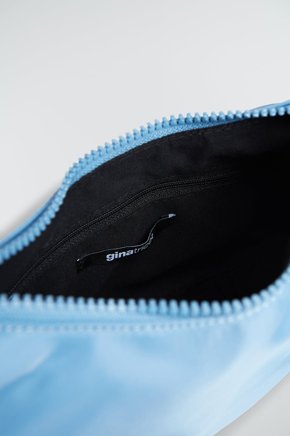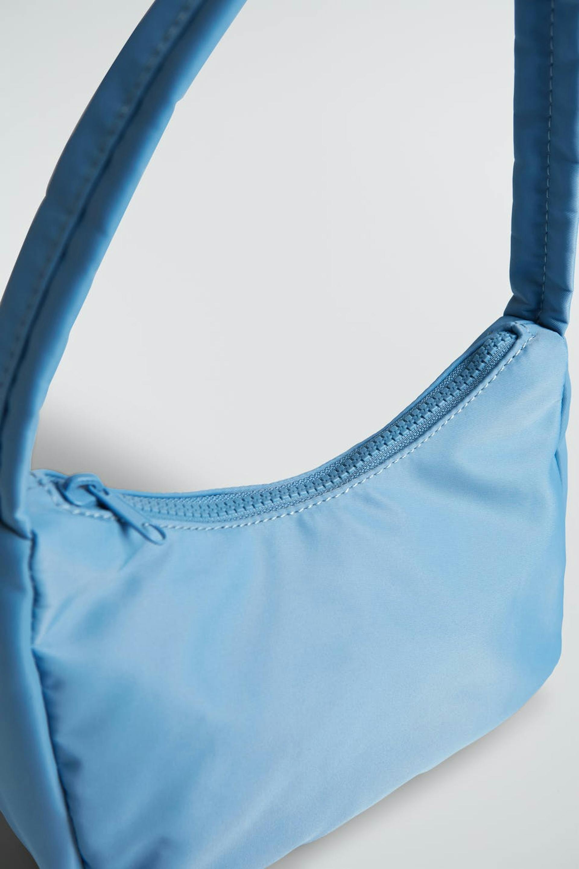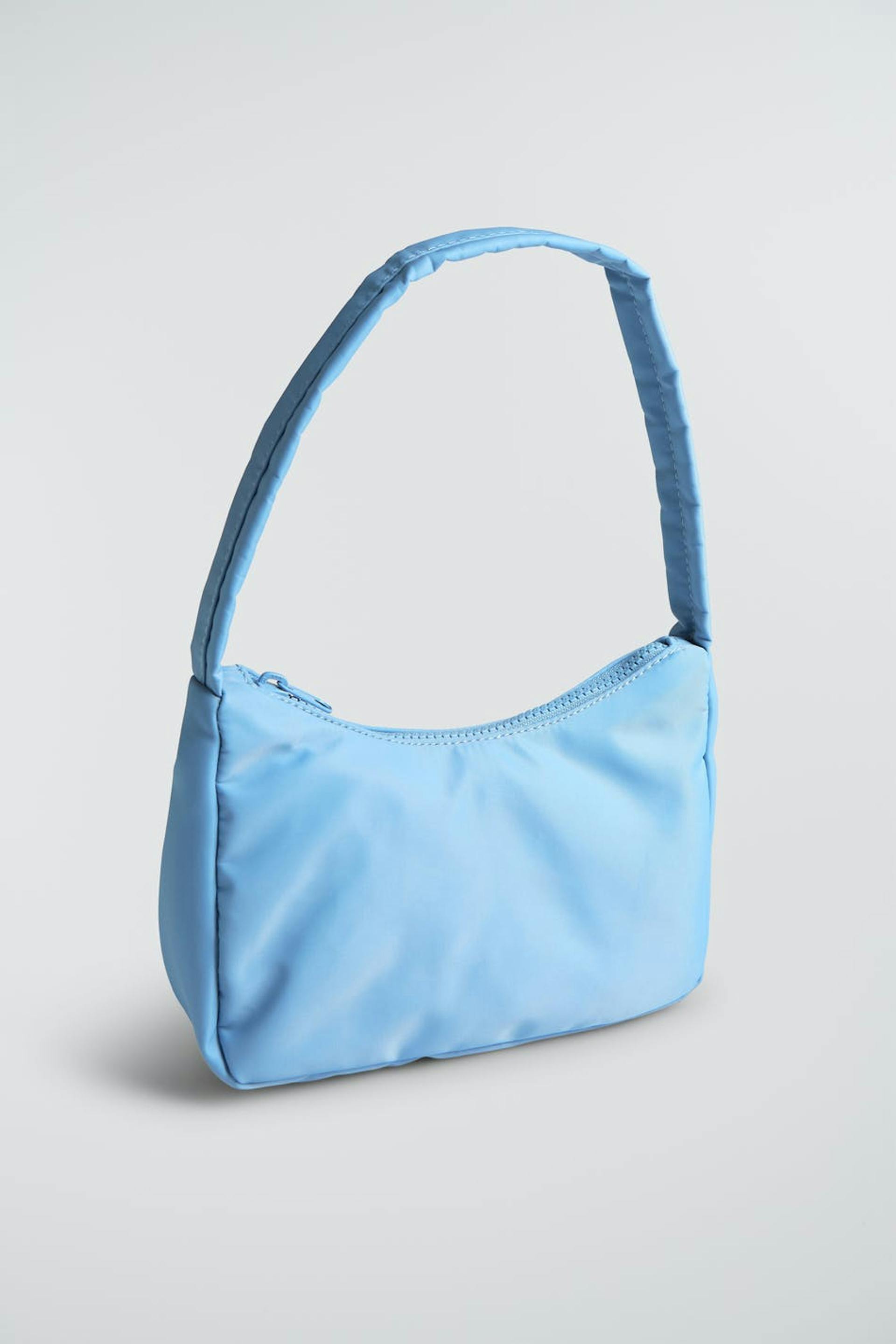 Baguetteväska med en kort axelrem. Väskan är blå. Den är gjord av nylon.