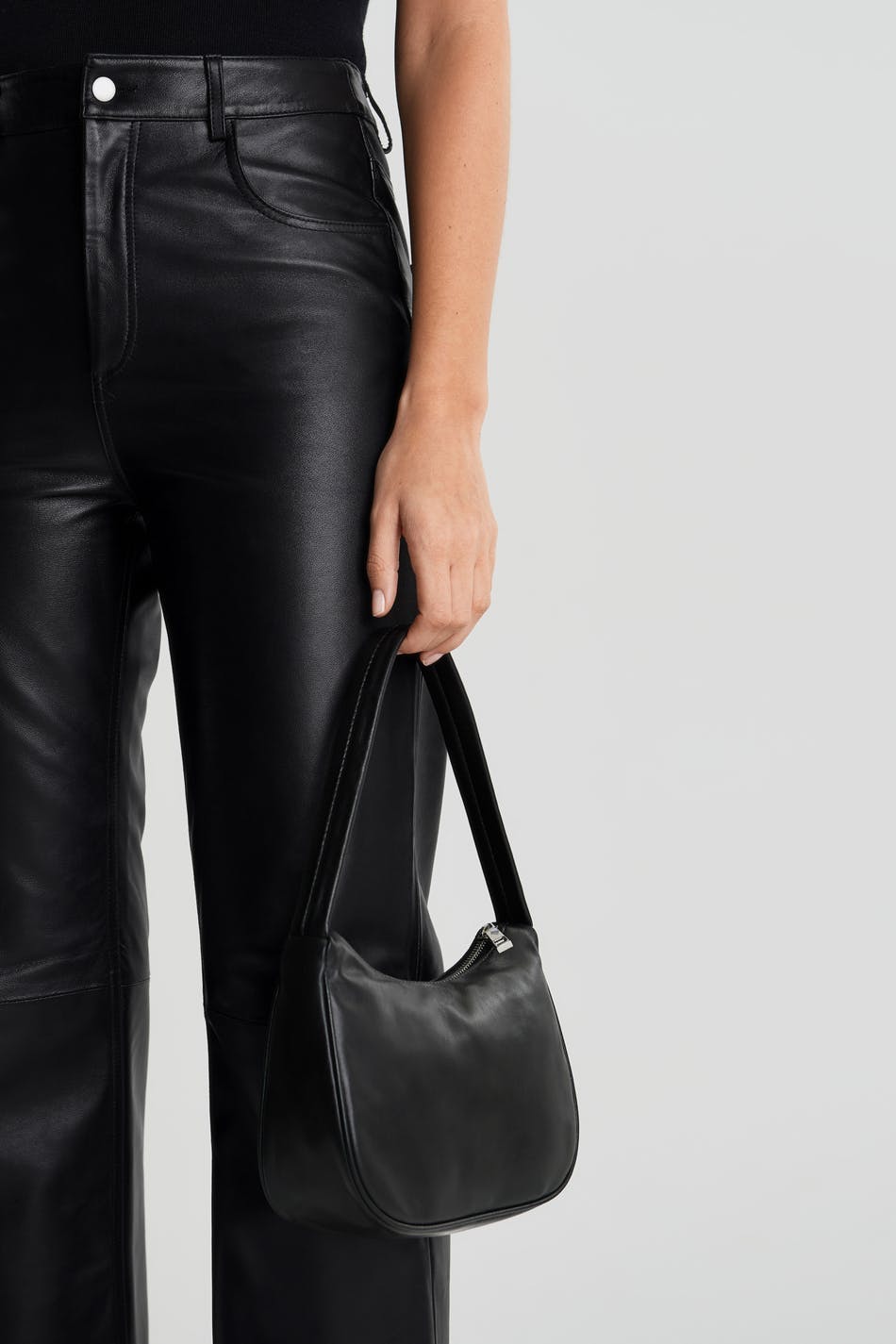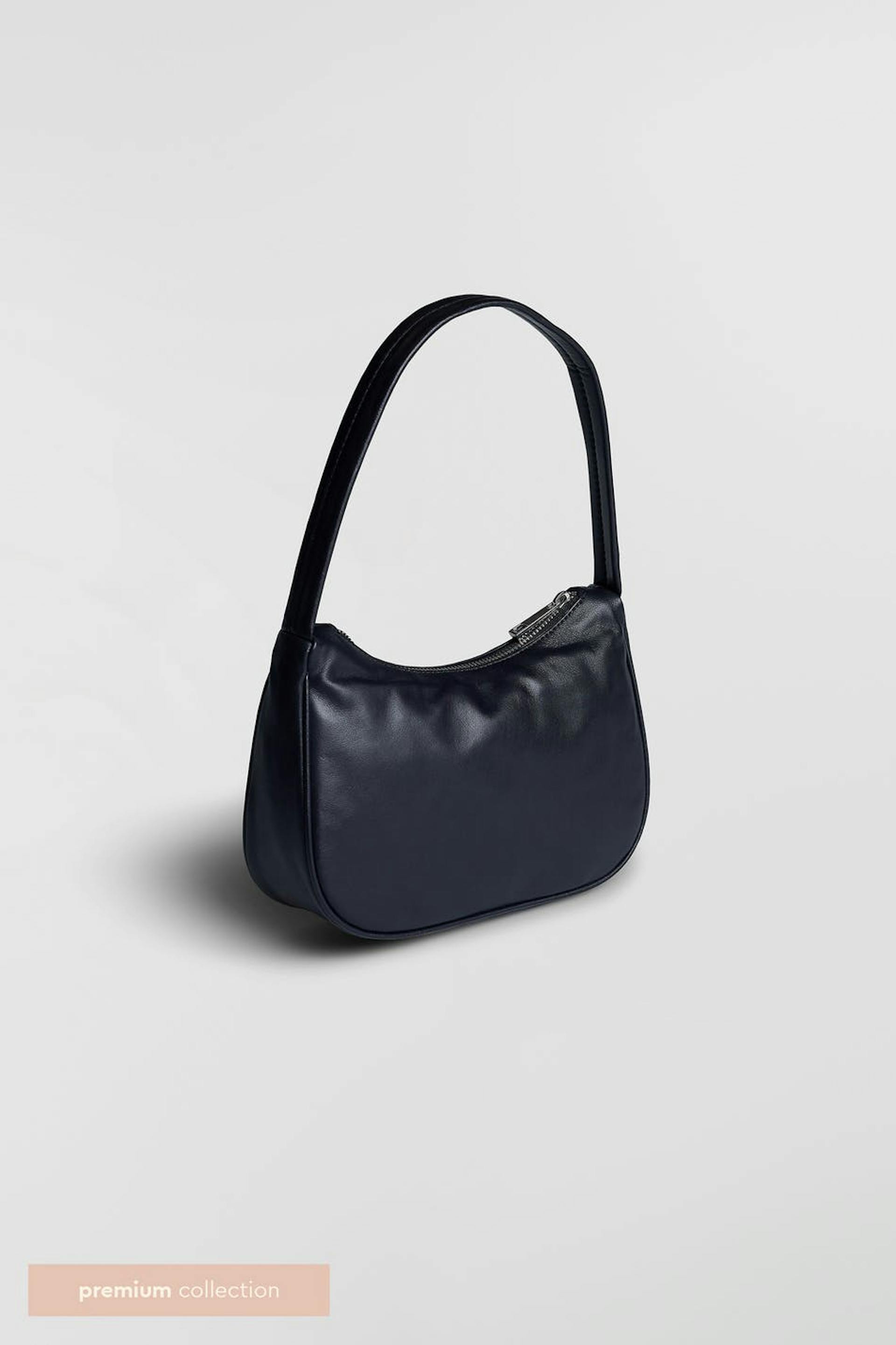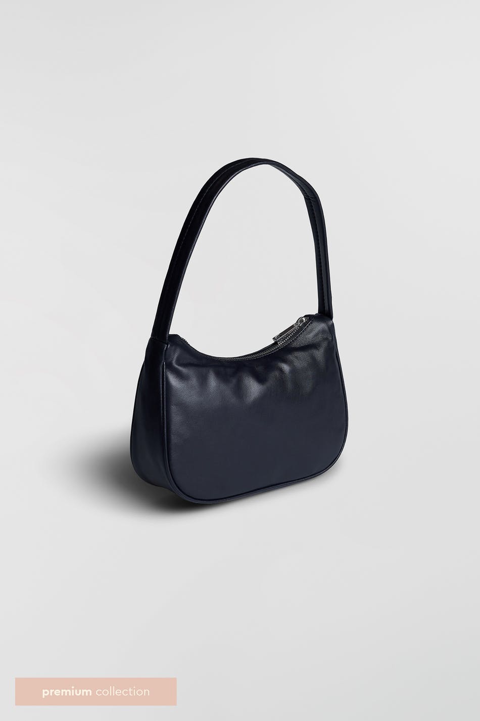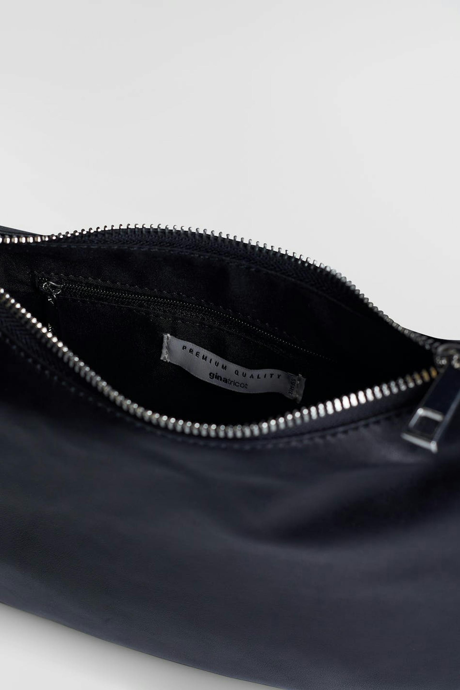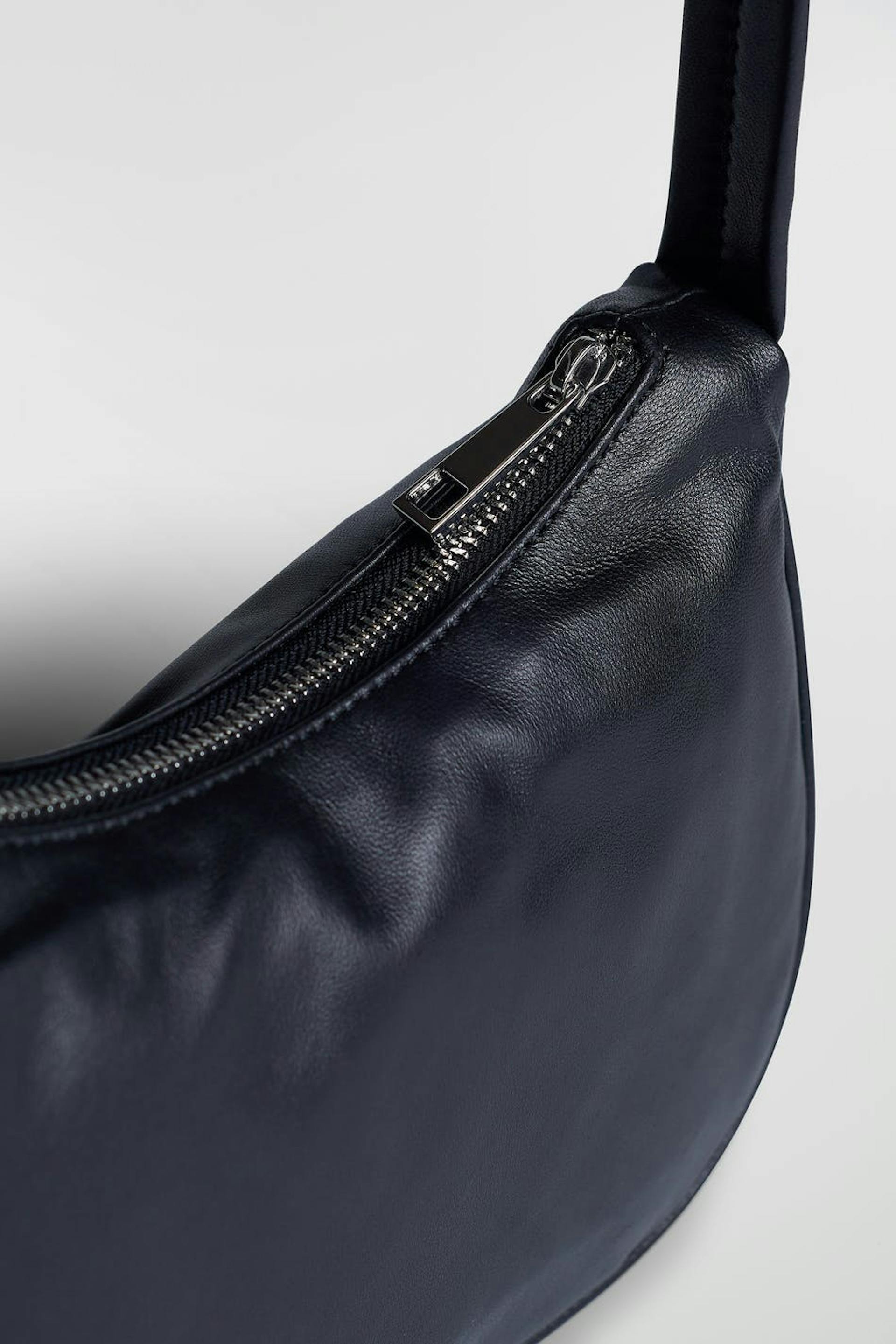 Klassisk baguetteväska med en kort axelrem. Väskan är svart och har en silverfärgad dragkedja på ovansidan. Den har en skinande finish och ett material i premiumläder.