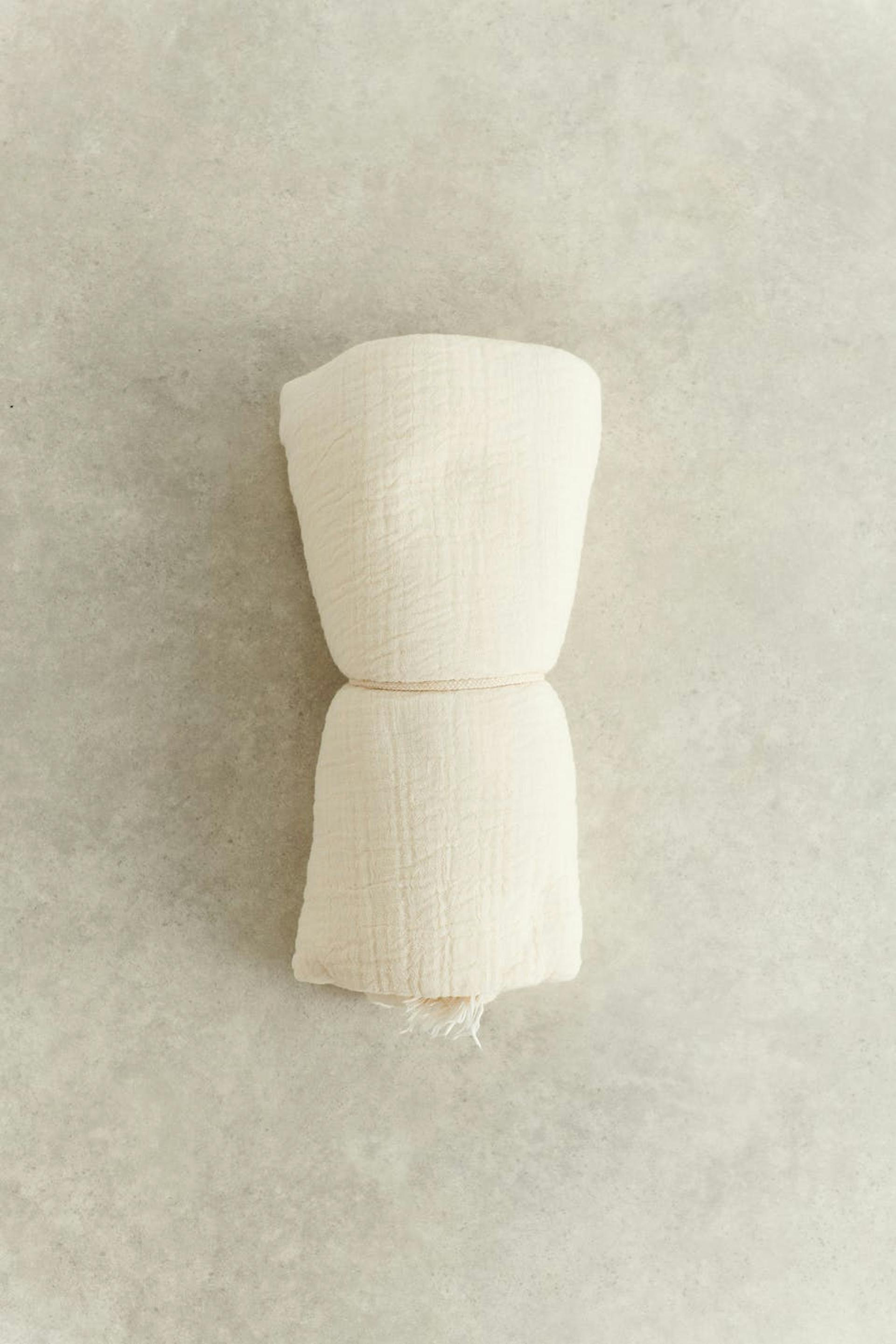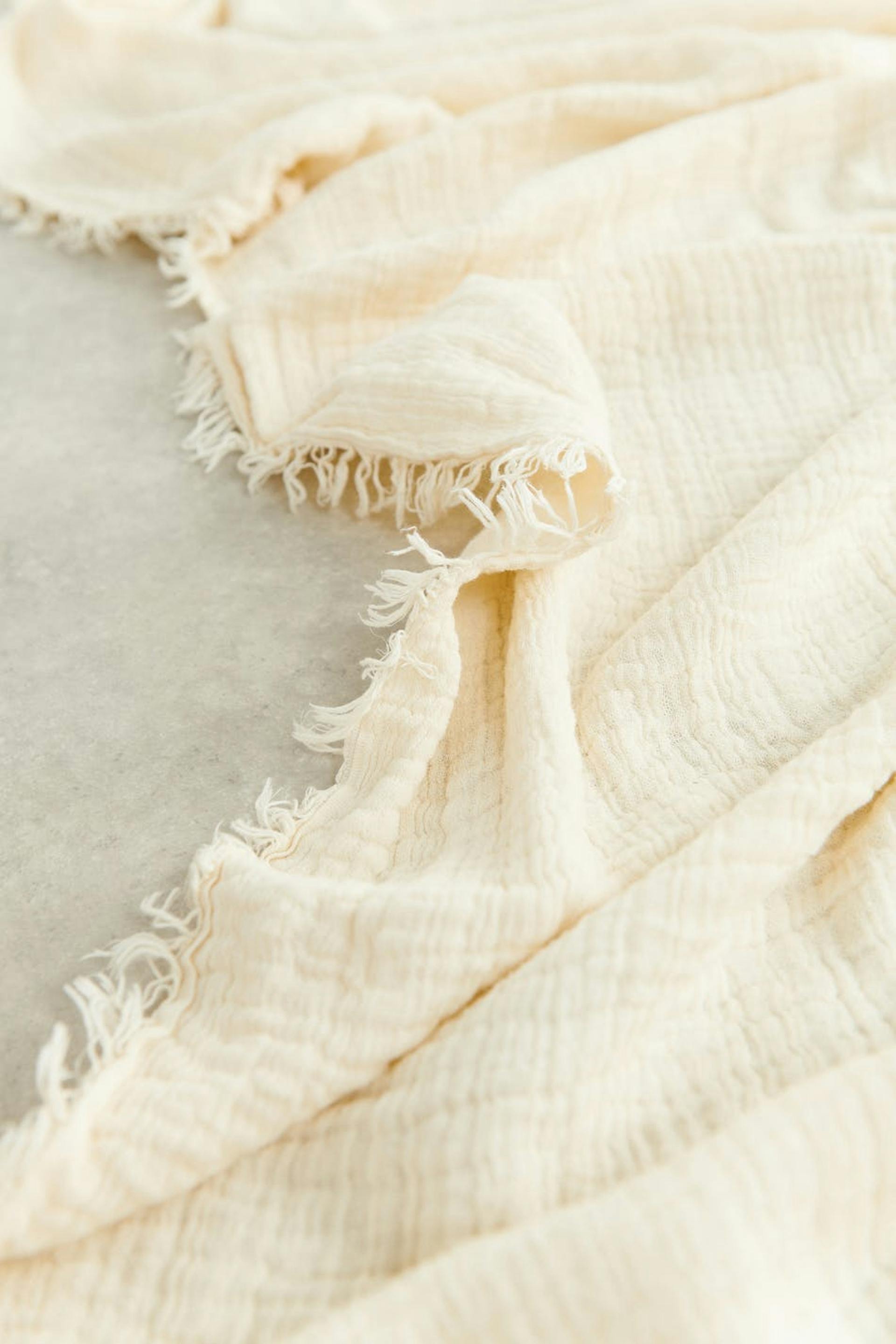 Krinklad filt från Gina Home med fransar vid kanterna. Filten är vit och har ett mjukt material i bomull.