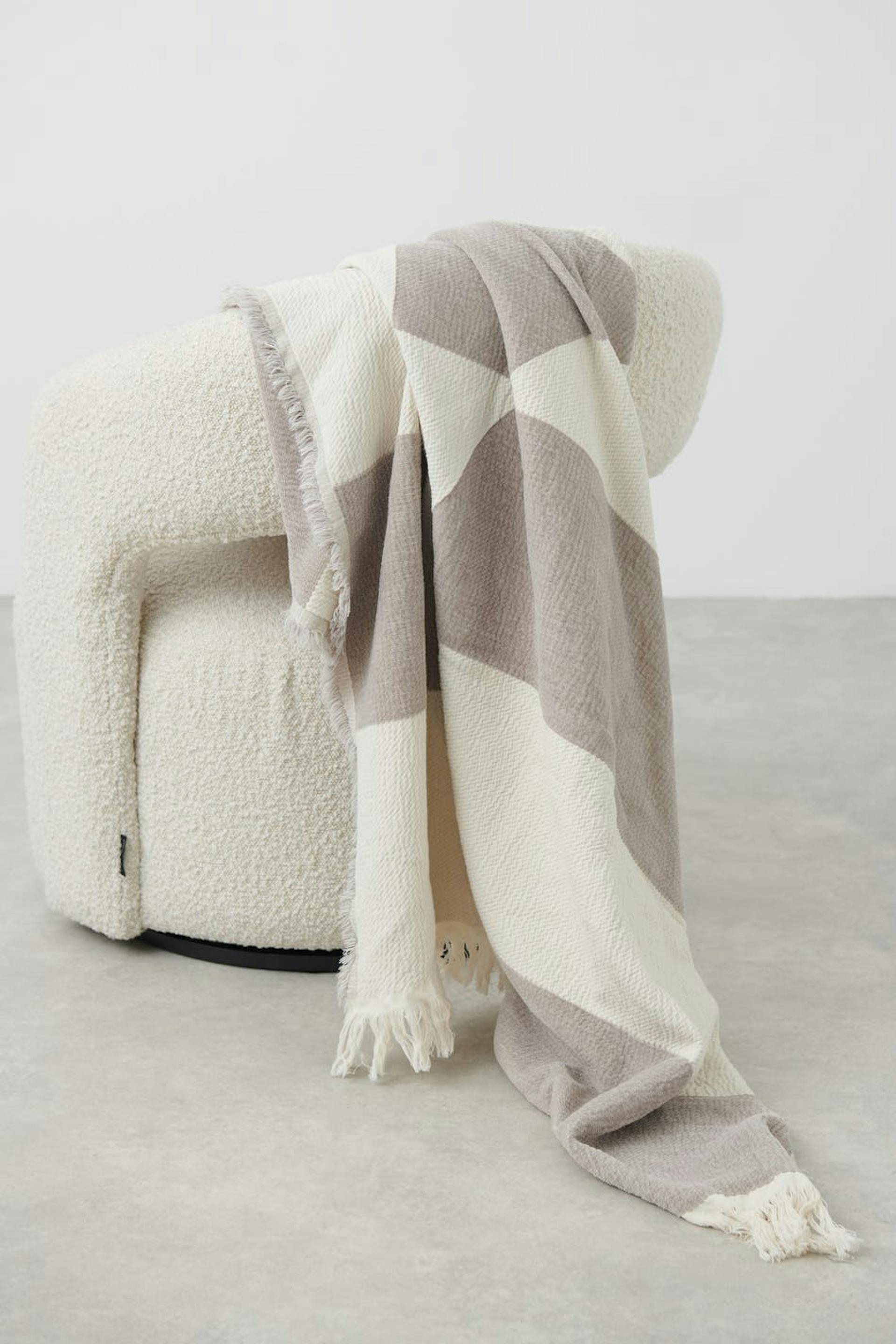 Jacquardvävd filt med fransar utmed kanterna. Filten är beige och mönstrad.