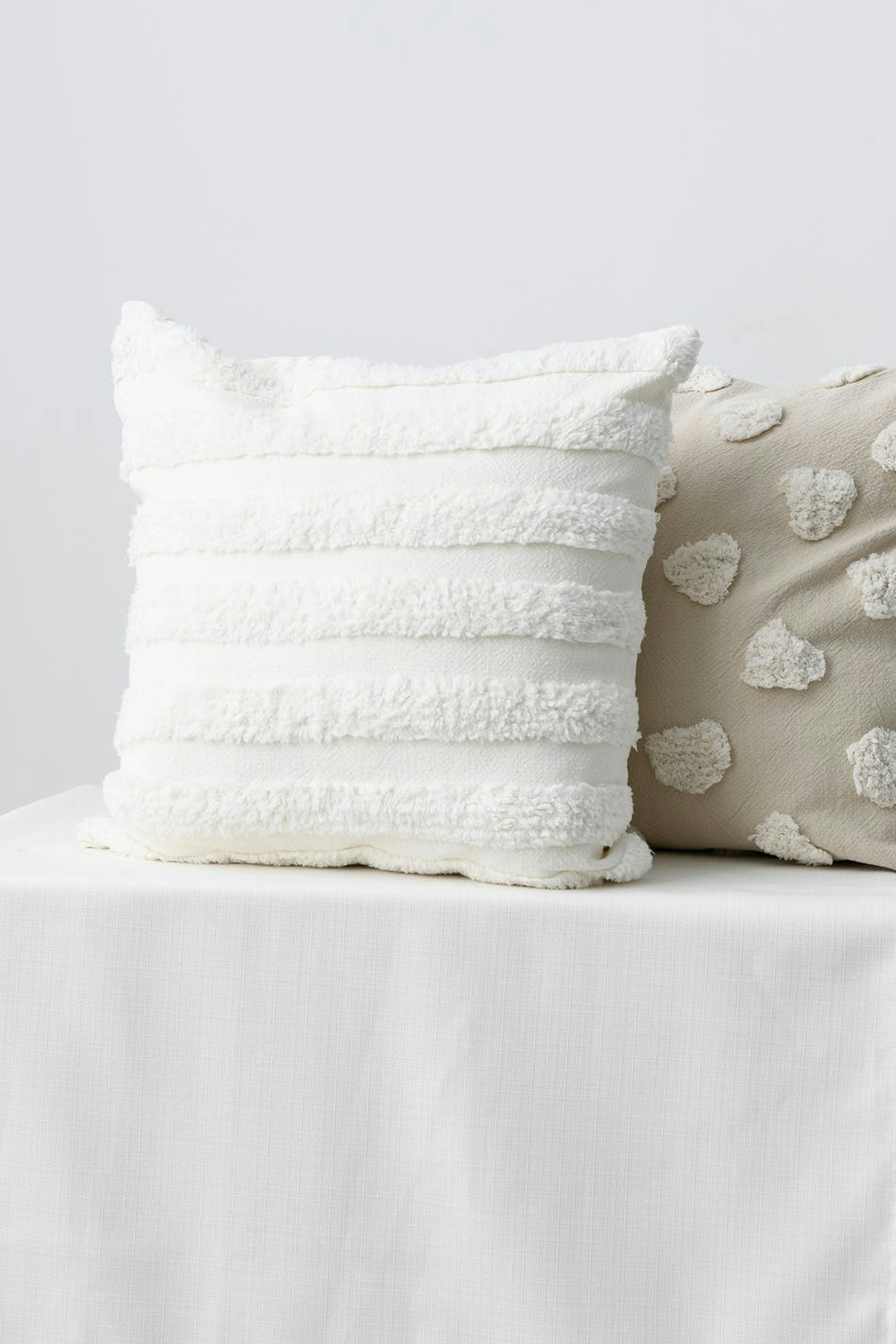 Kuddfodral från Gina Home med tuftat motiv. Fodralet är vitt och har ett mjukt material i bomull. Det har en dold dragkedja baktill.