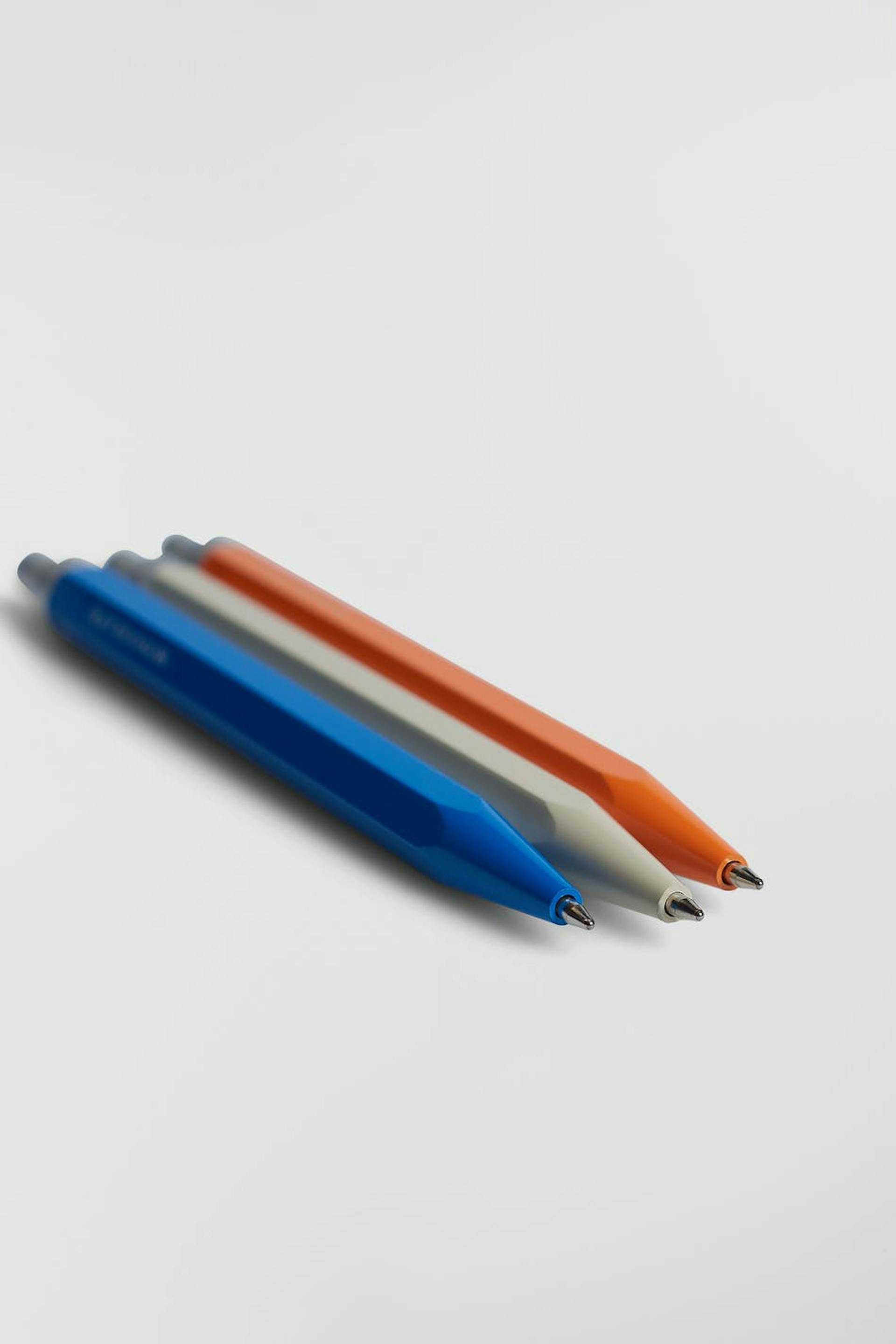 Bläckpennor från Monograph med graverad logga. Bläckpennorna är blåa, beigea och orangea.