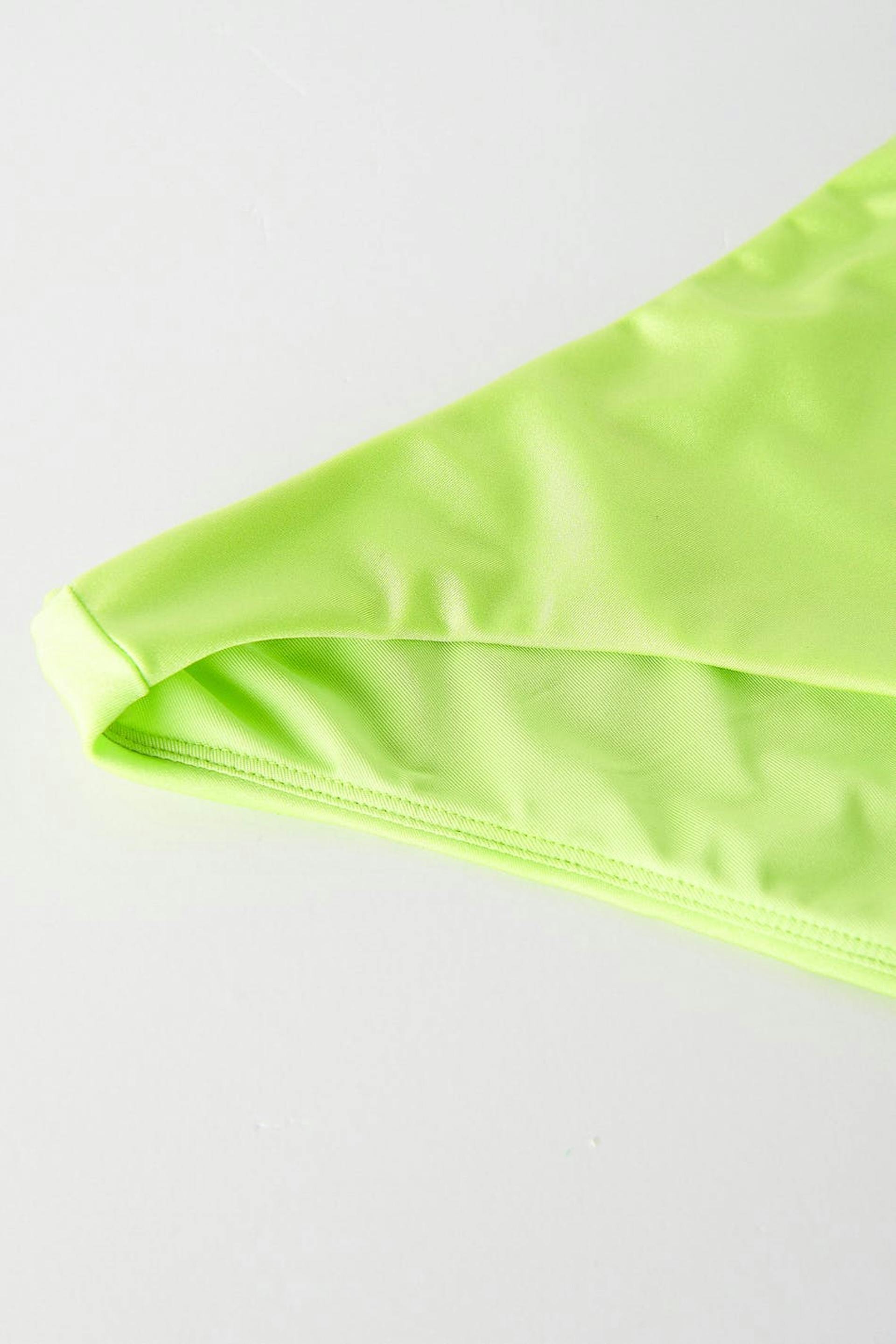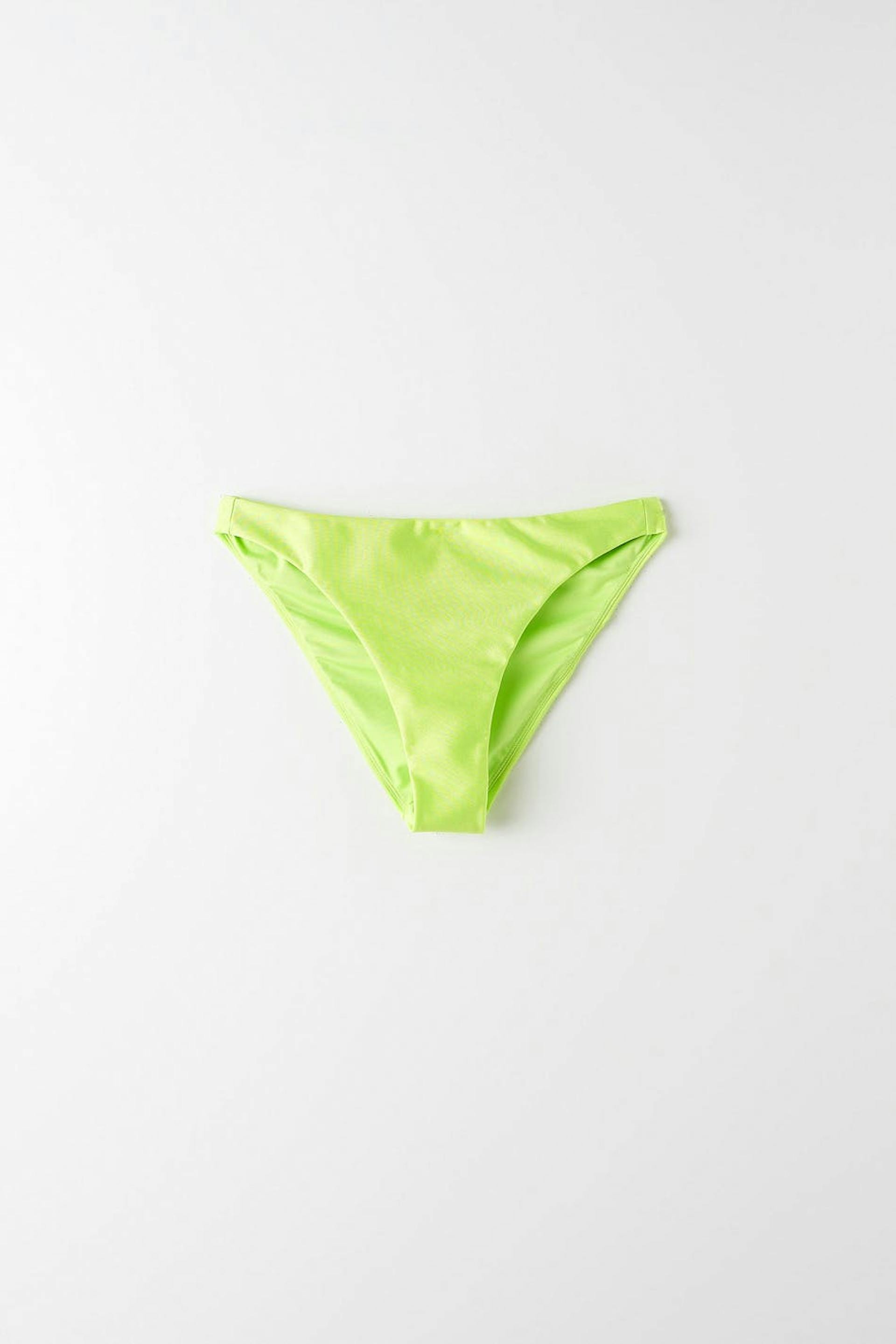Bikinitrosor med ett halvglansigt baddräktsmaterial. Bikinitrosorna är gröna och har en resår i midjan och vid benöppningarna.