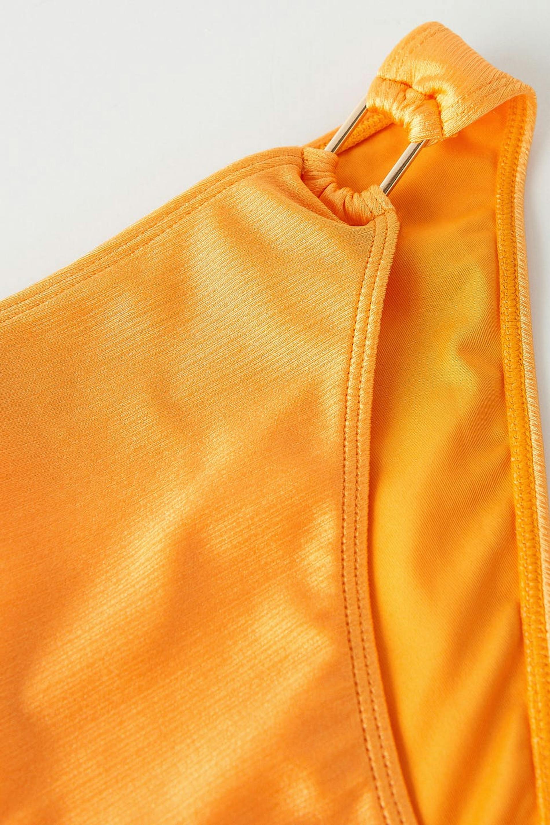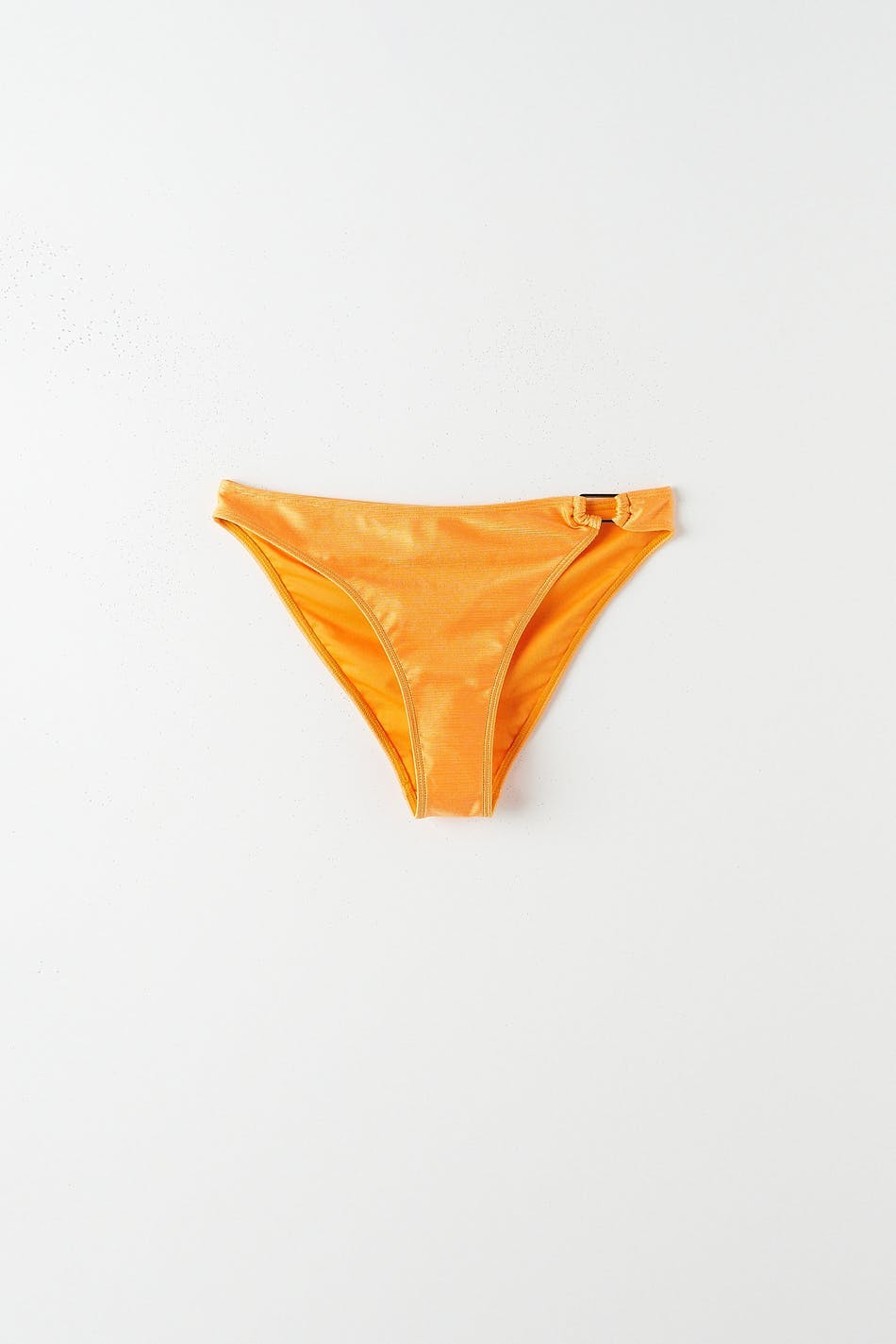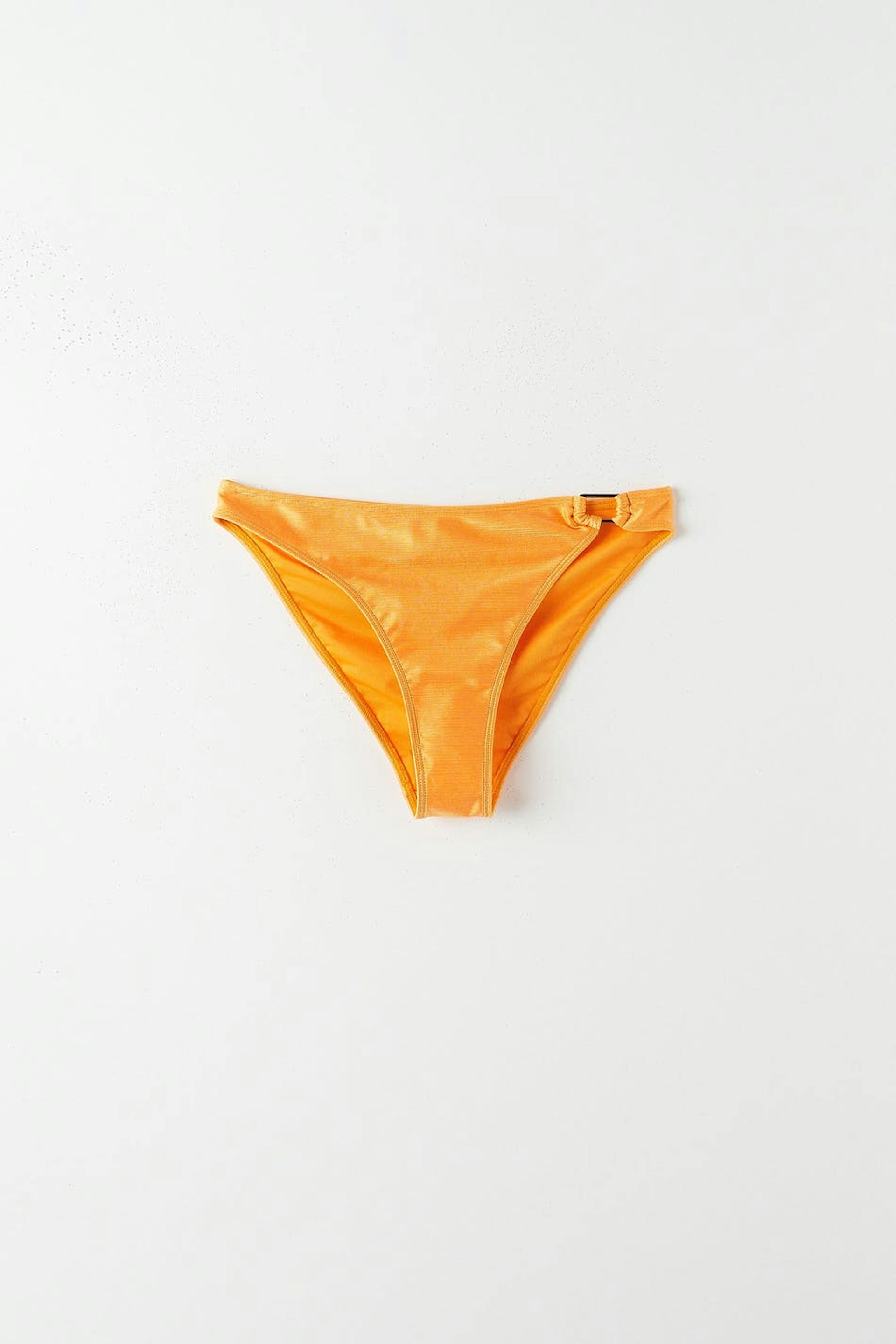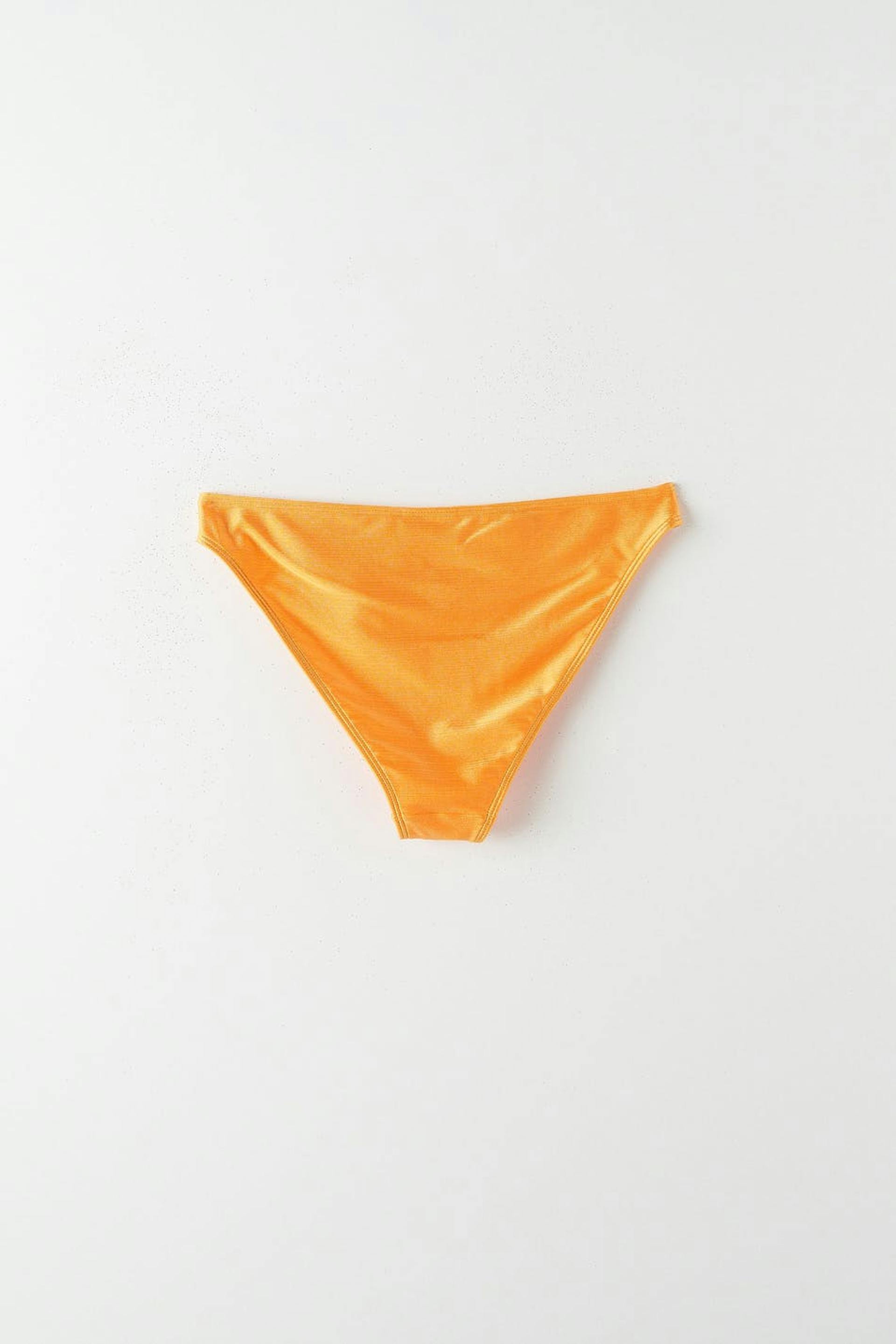 Fodrade bikinitrosor med ett glansigt baddräktsmaterial. Trosorna är orangea och har en metalldetalj i sidorna. De har en mjuk resår i midjan och vid benöppningarna.