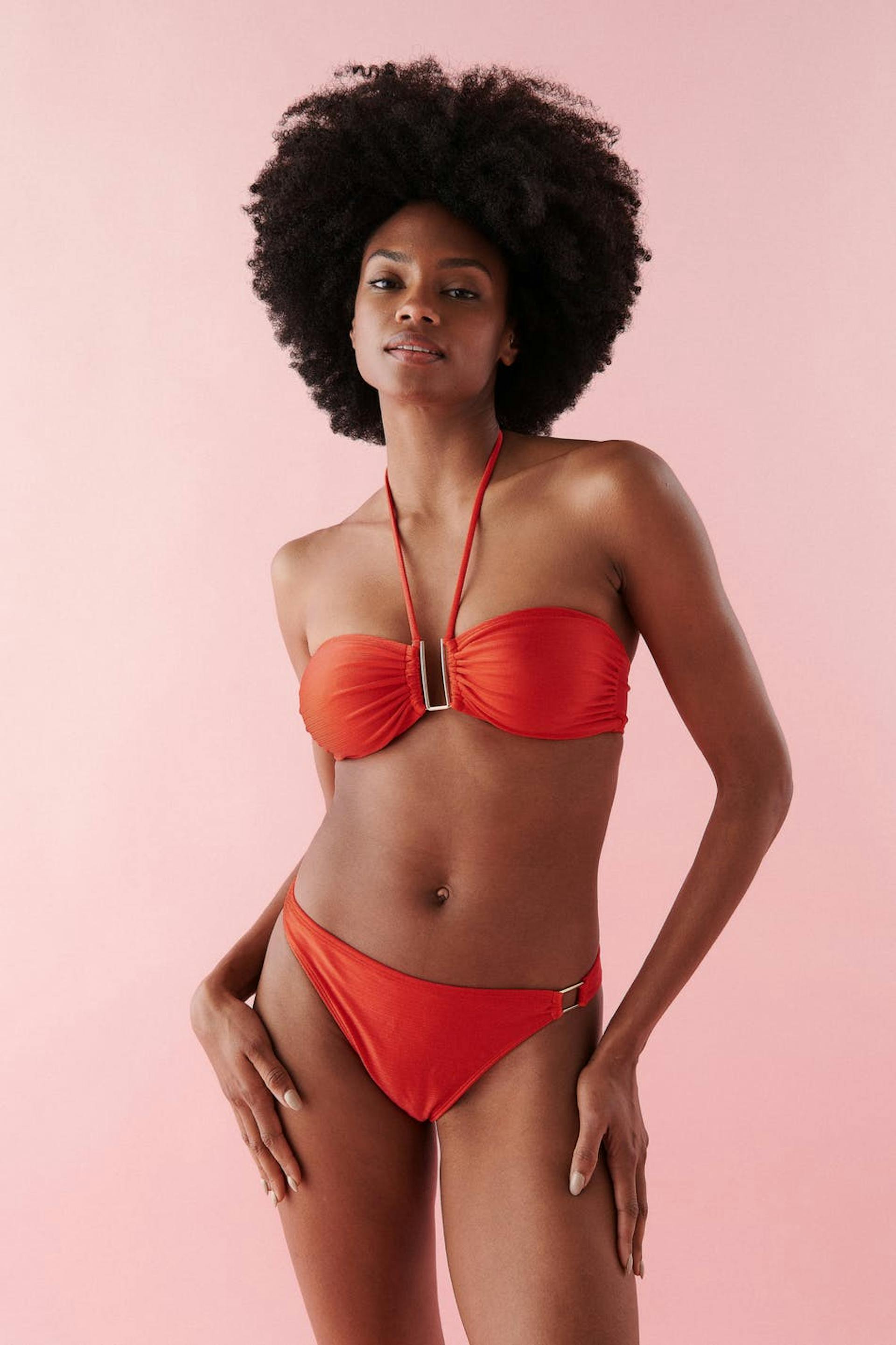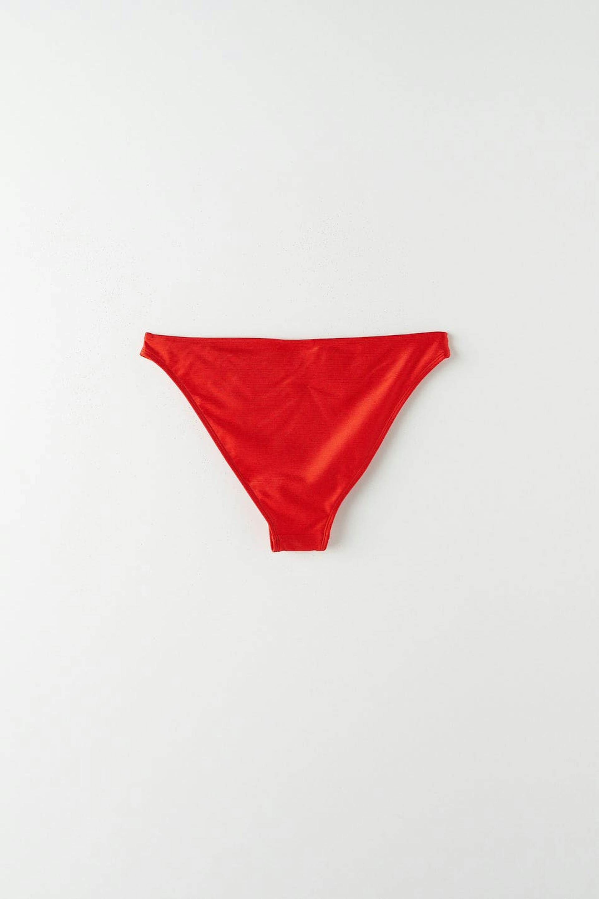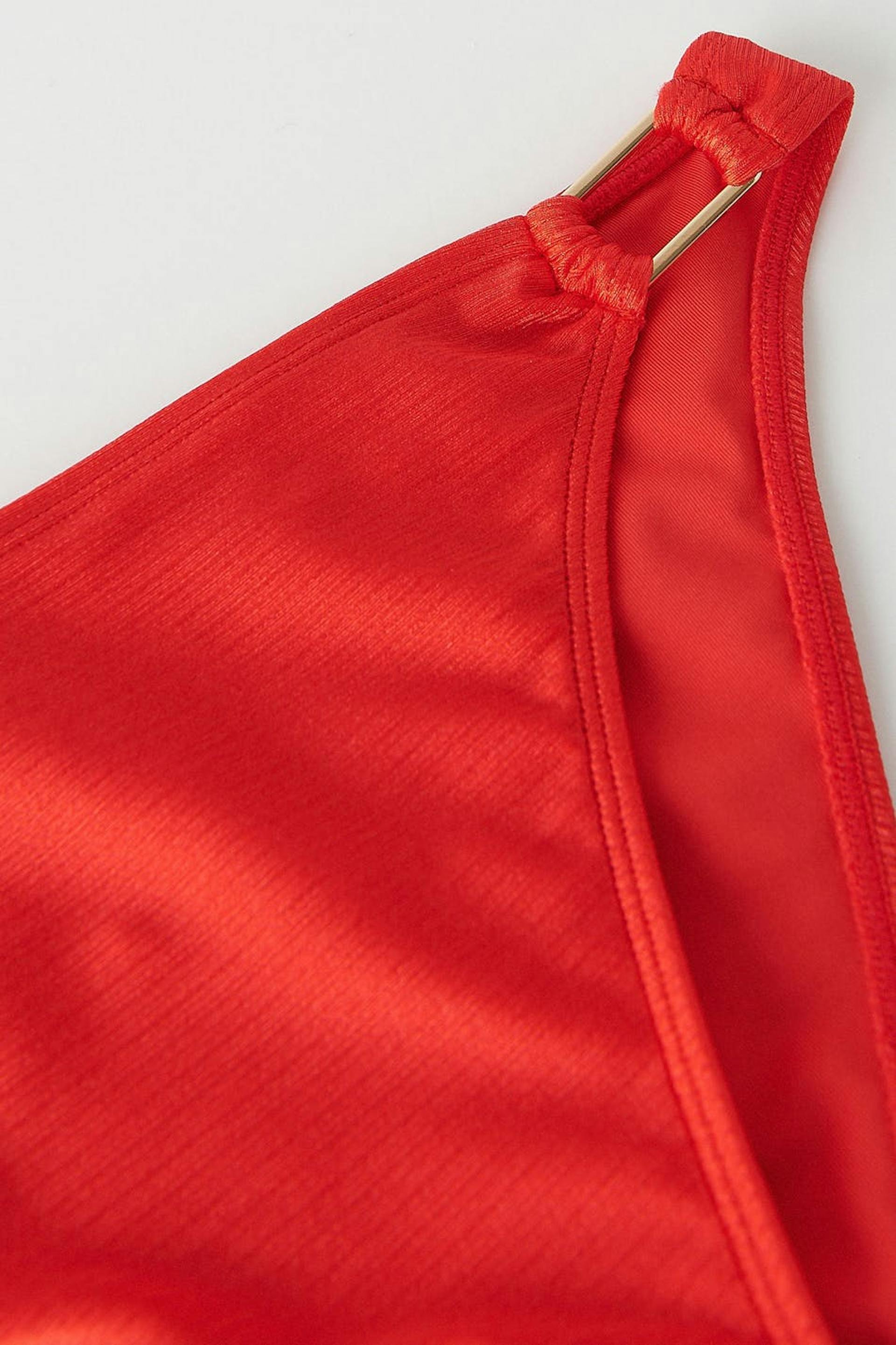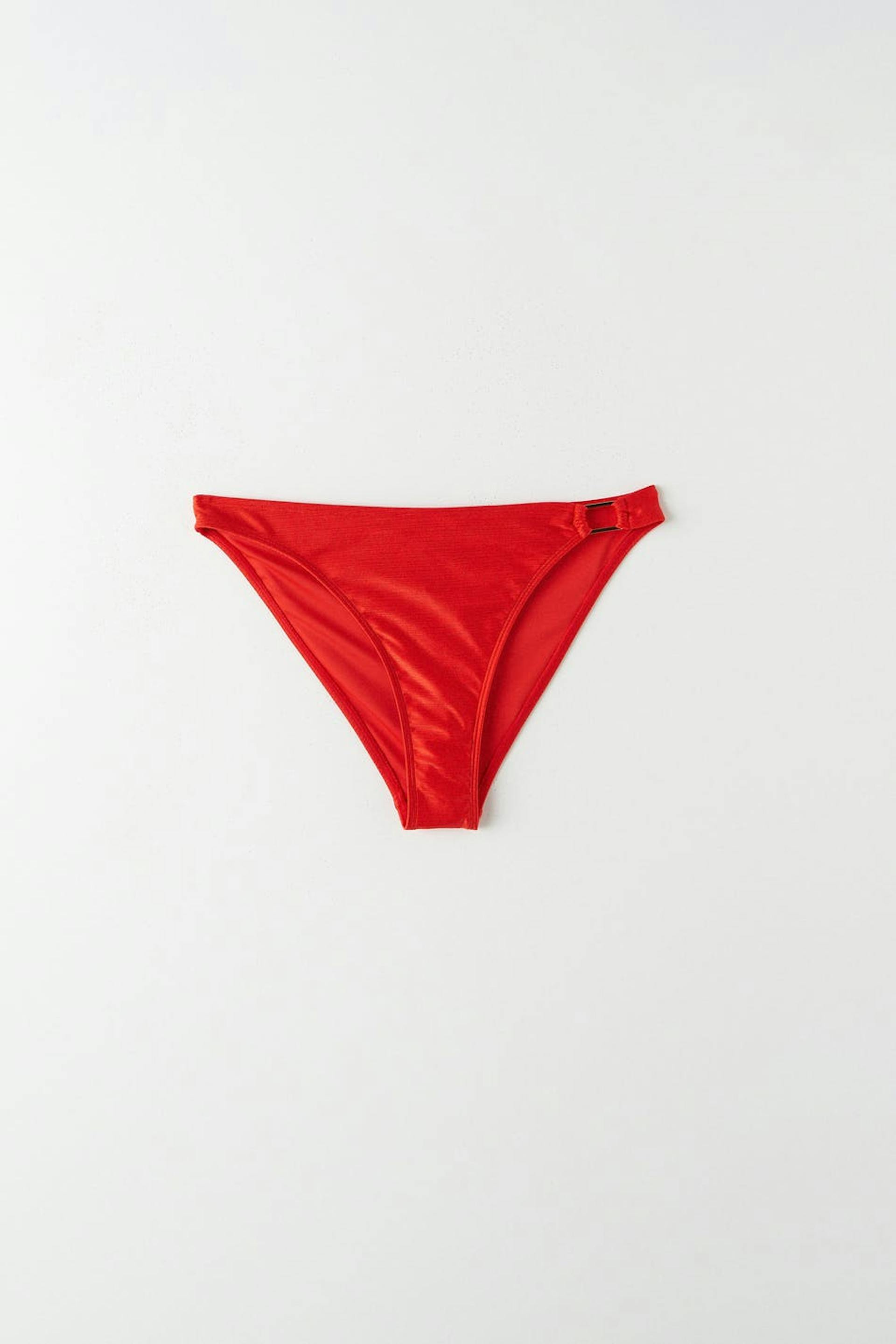 Fodrade bikinitrosor med ett glansigt baddräktsmaterial. Trosorna är röda och har en metalldetalj i sidorna. De har en mjuk resår i midjan och vid benöppningarna.