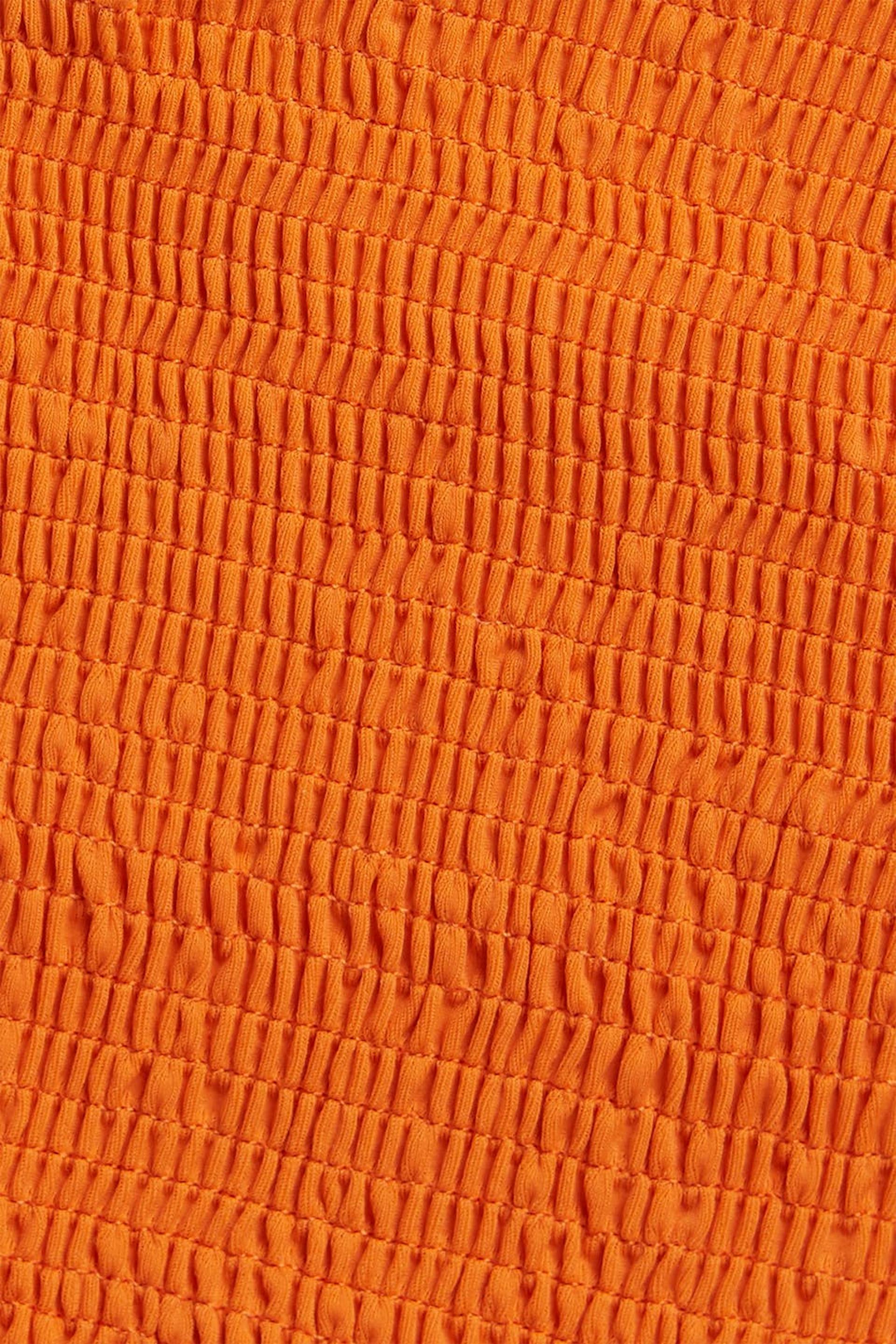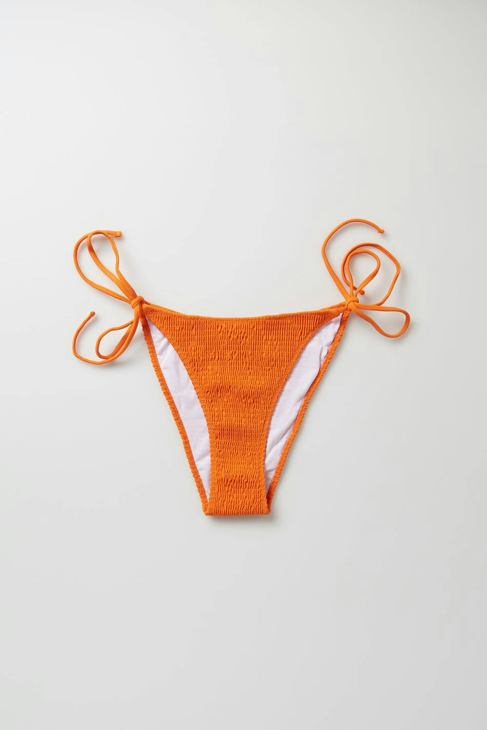 Strukturerad bikinitrosa med en knytning på sidorna. Trosan är orange och har en tanga modell. Den har en foder och en resår i midjan och vid benöppningarna.