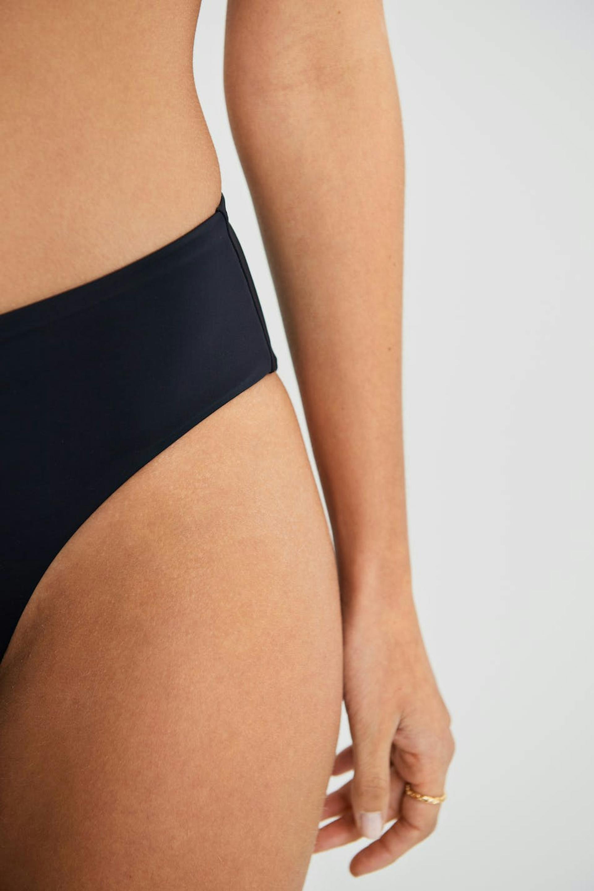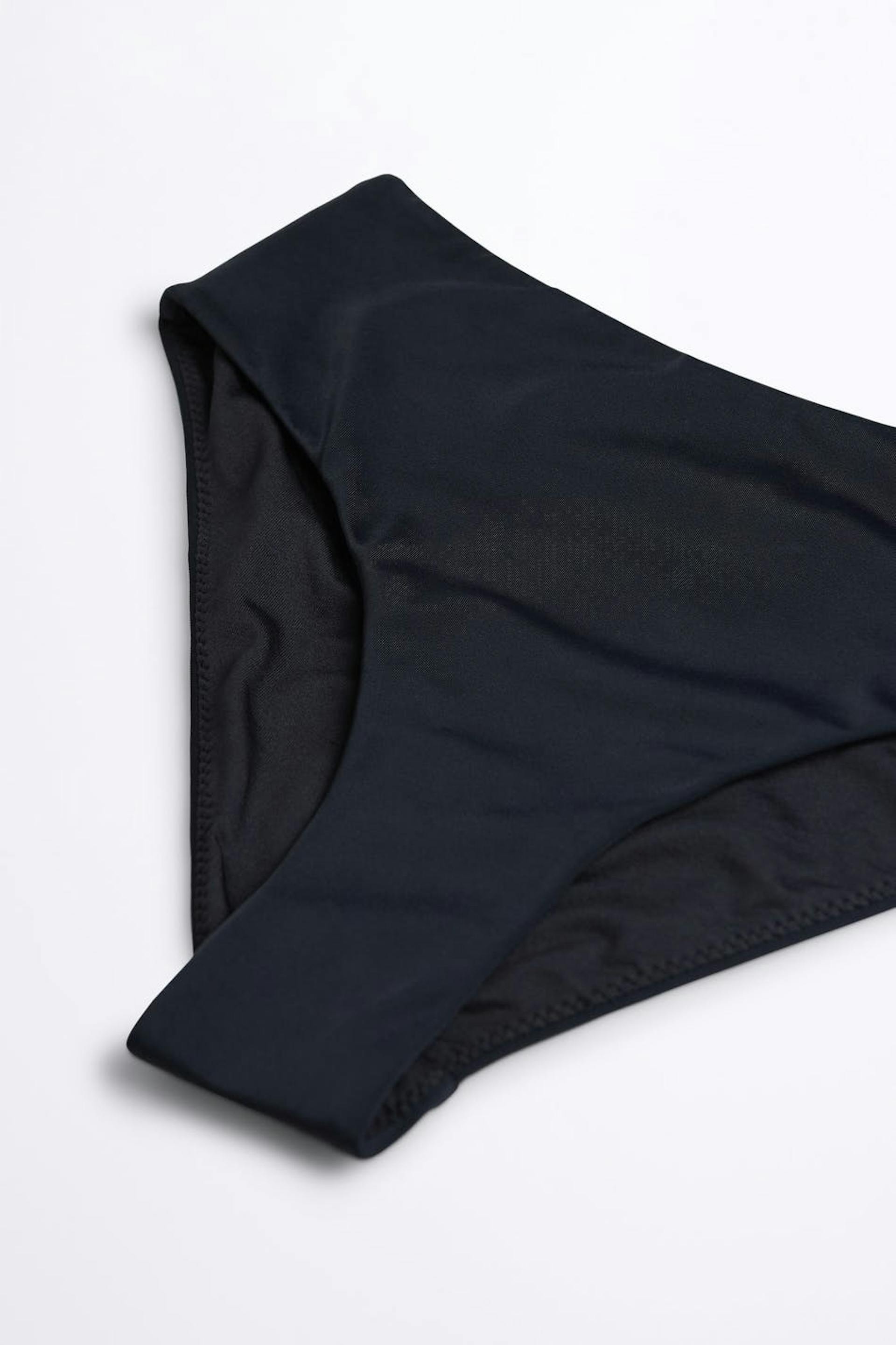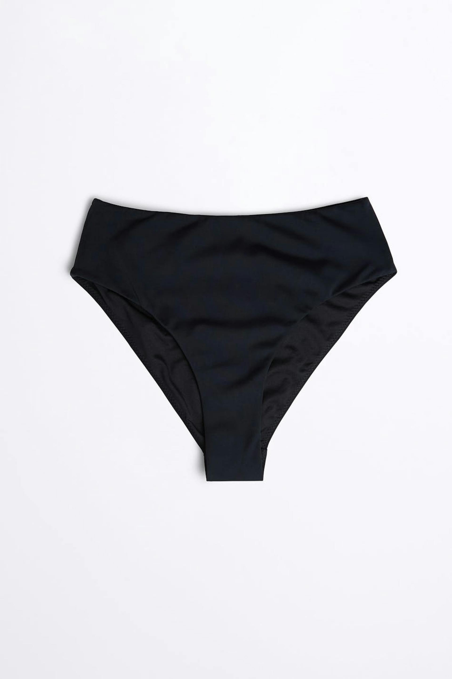 Helt fodrad bikinitrosa med en hög midja. Trosan är svart och har ett baddräktsmaterial. Den har en mjuk resår vid benöppningarna och i midjan.