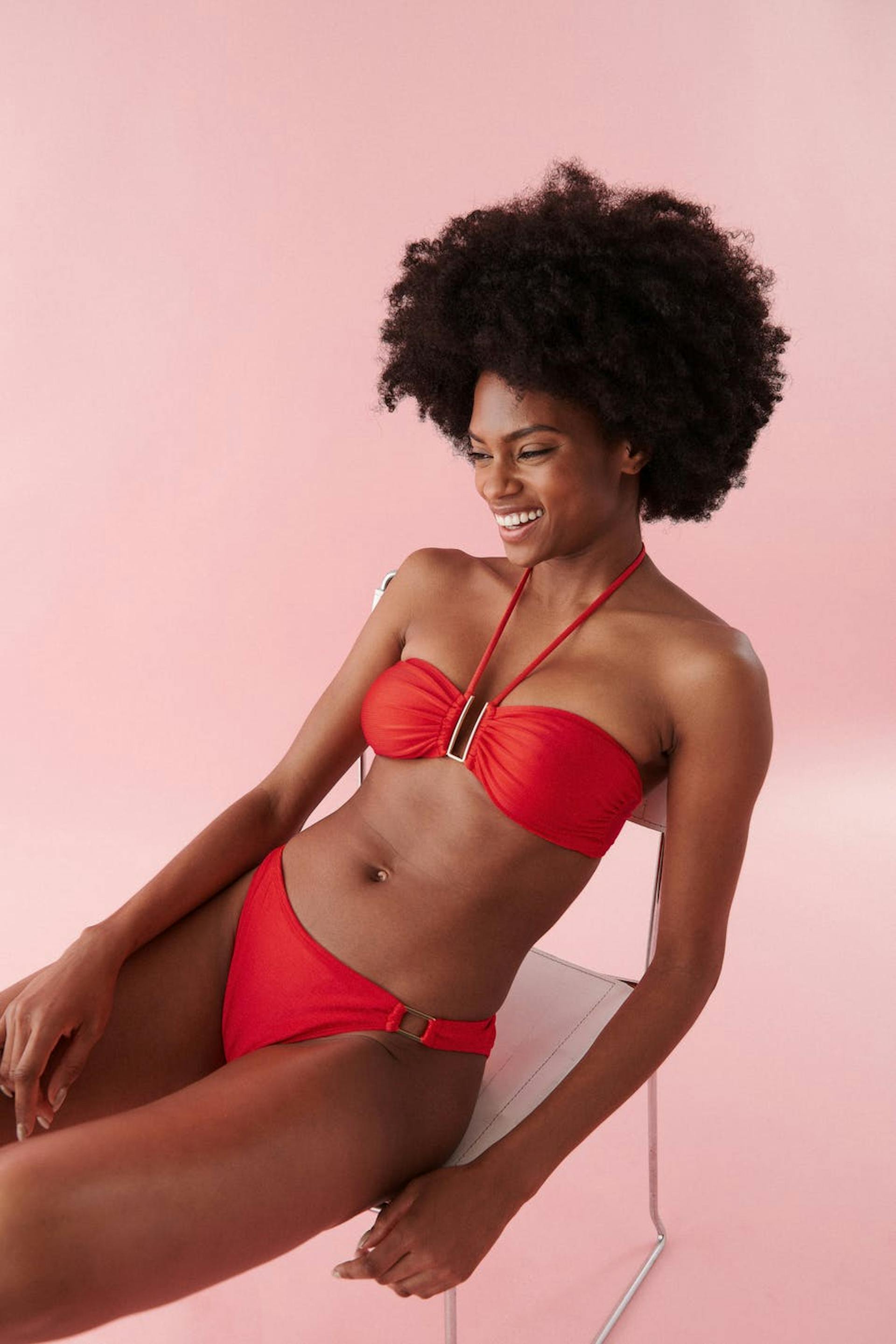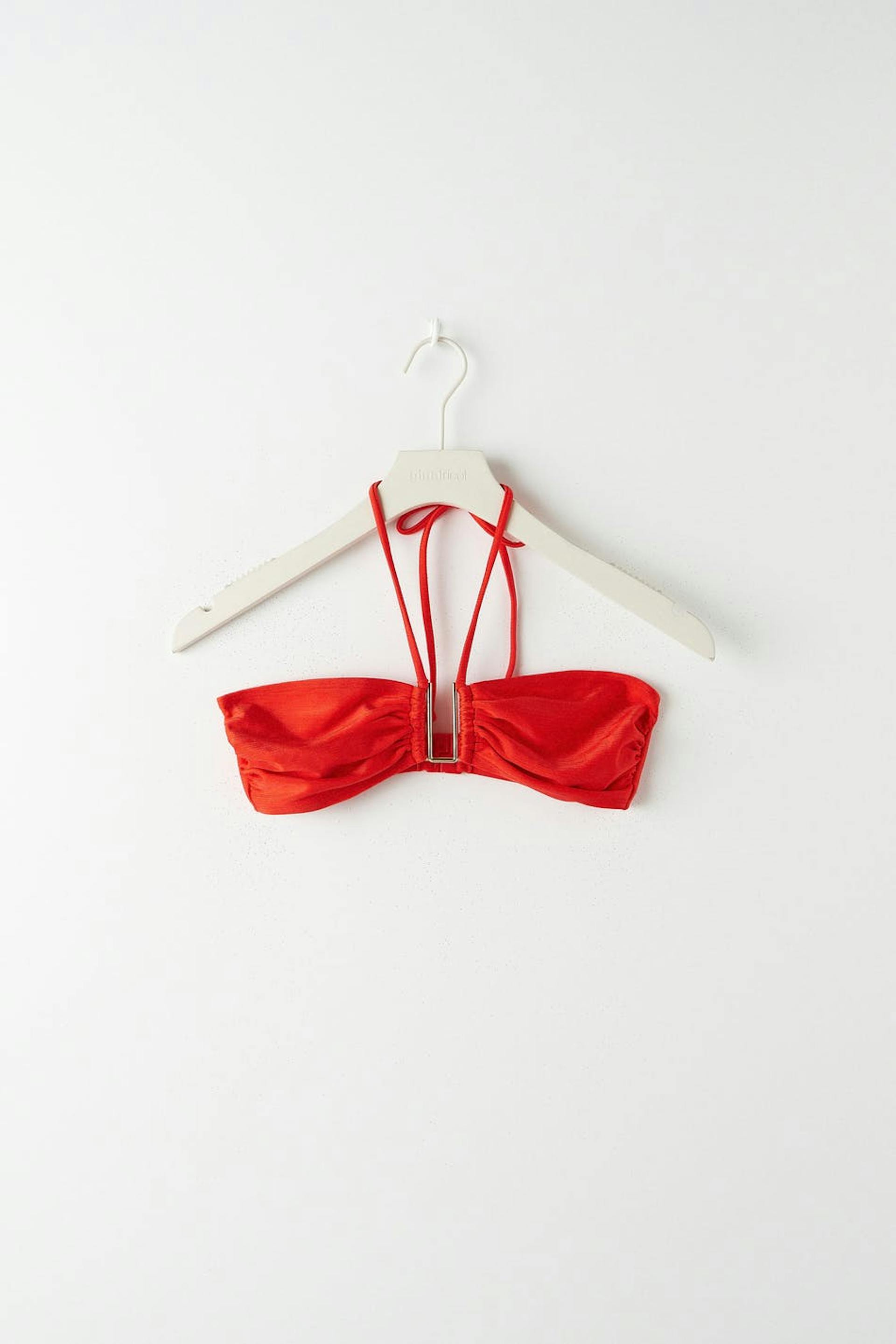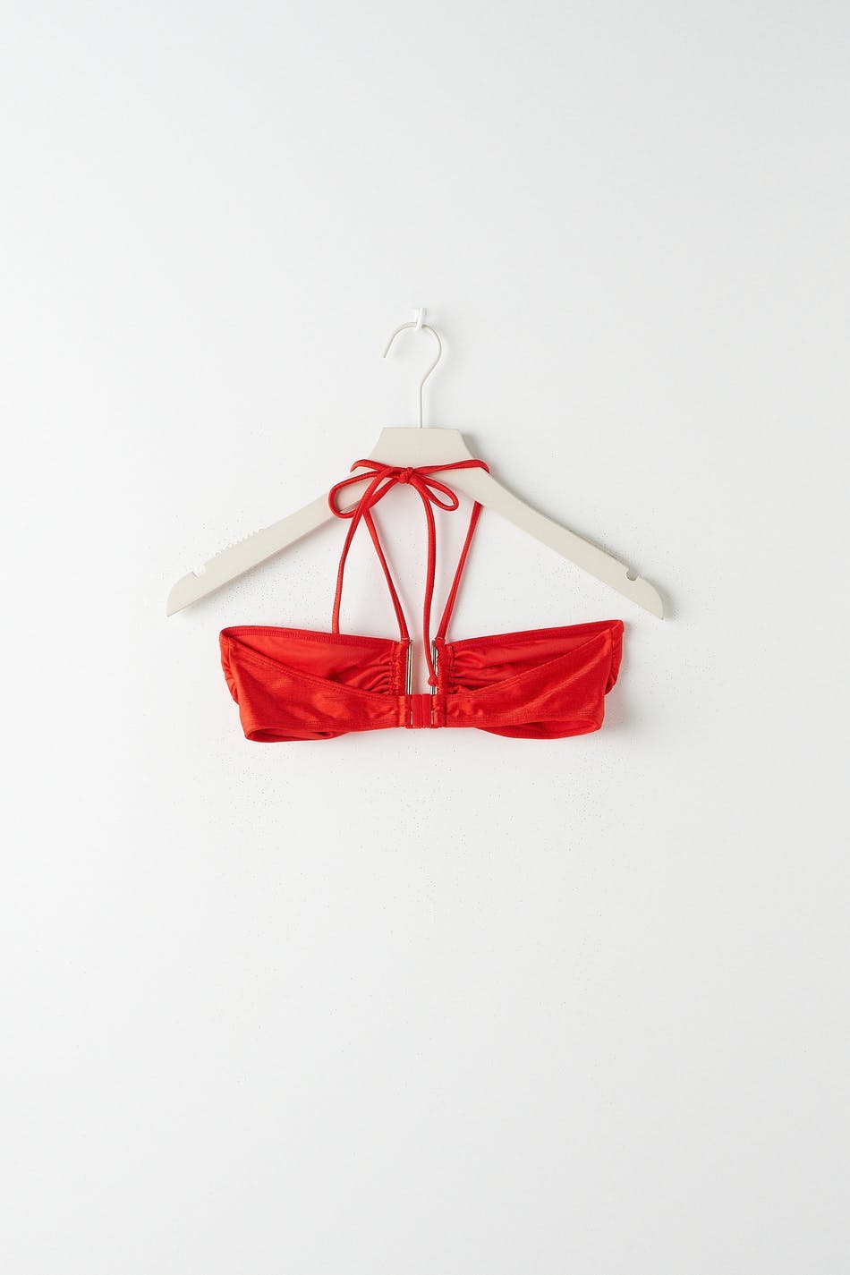 Fodrad bandeaubikini-topp med ett glansigt baddräktsmaterial. Bikinitoppen är röd och har halterneckband med knytning i nacken. Den har en metalldetalj framtill och knäppning i ryggen.
