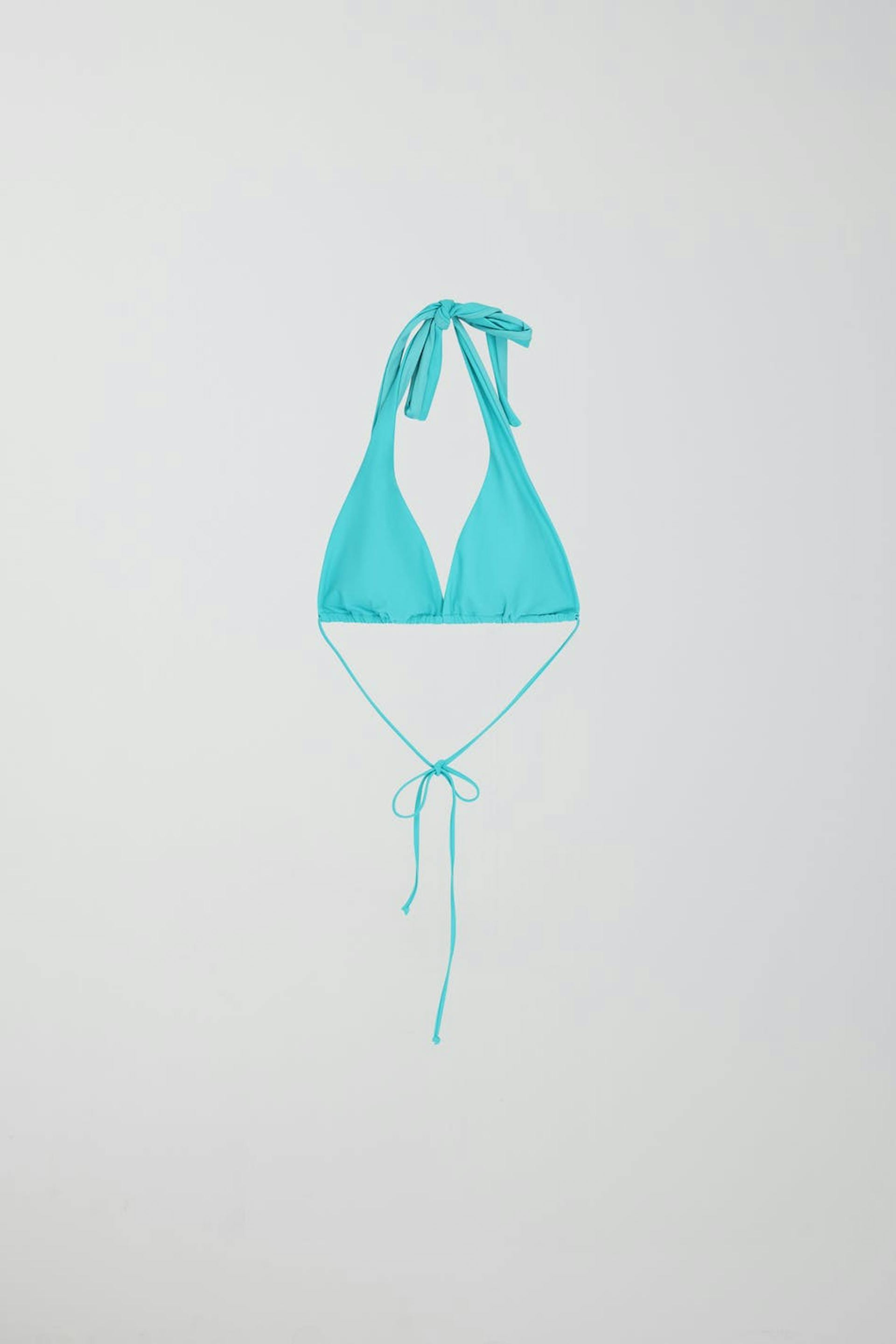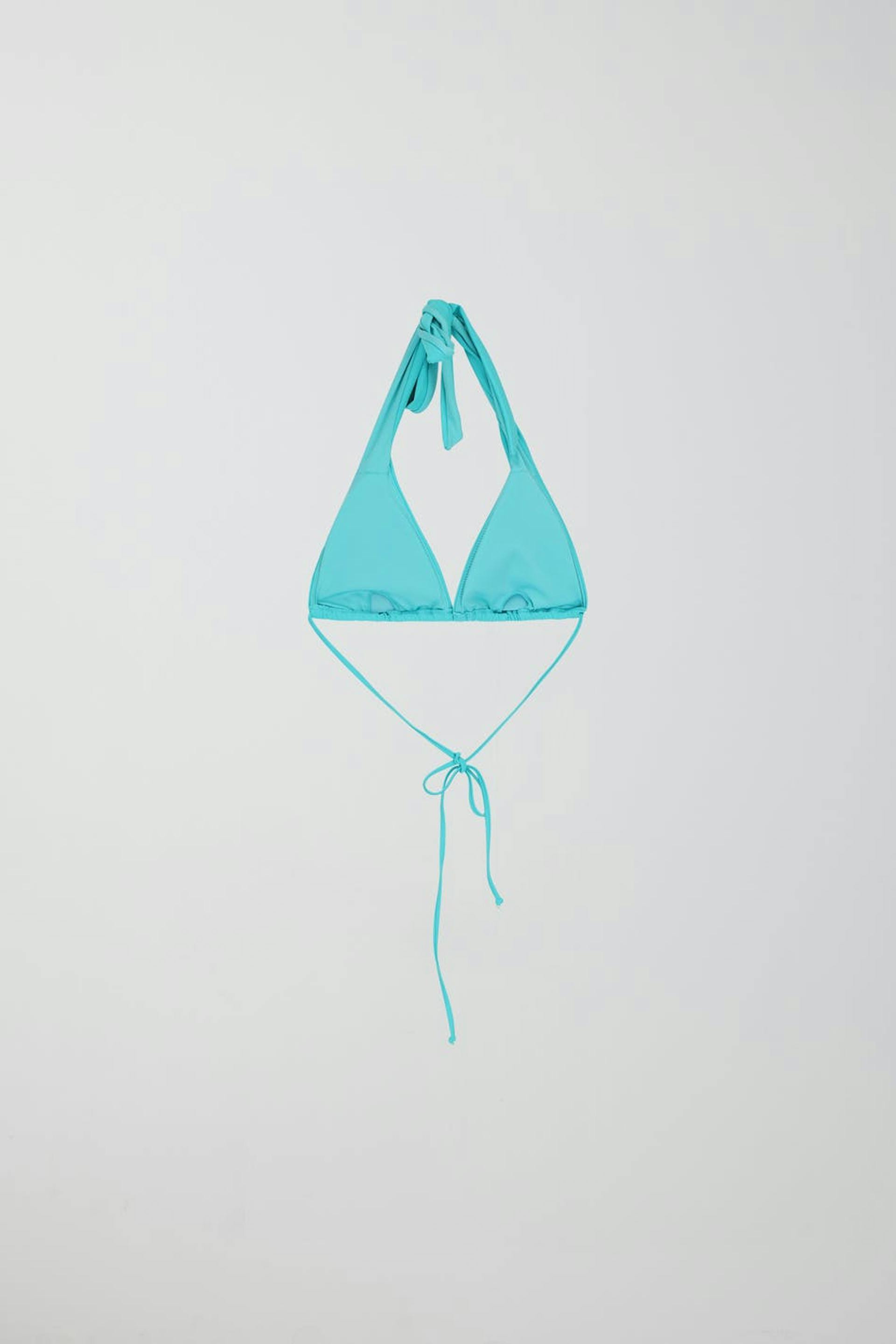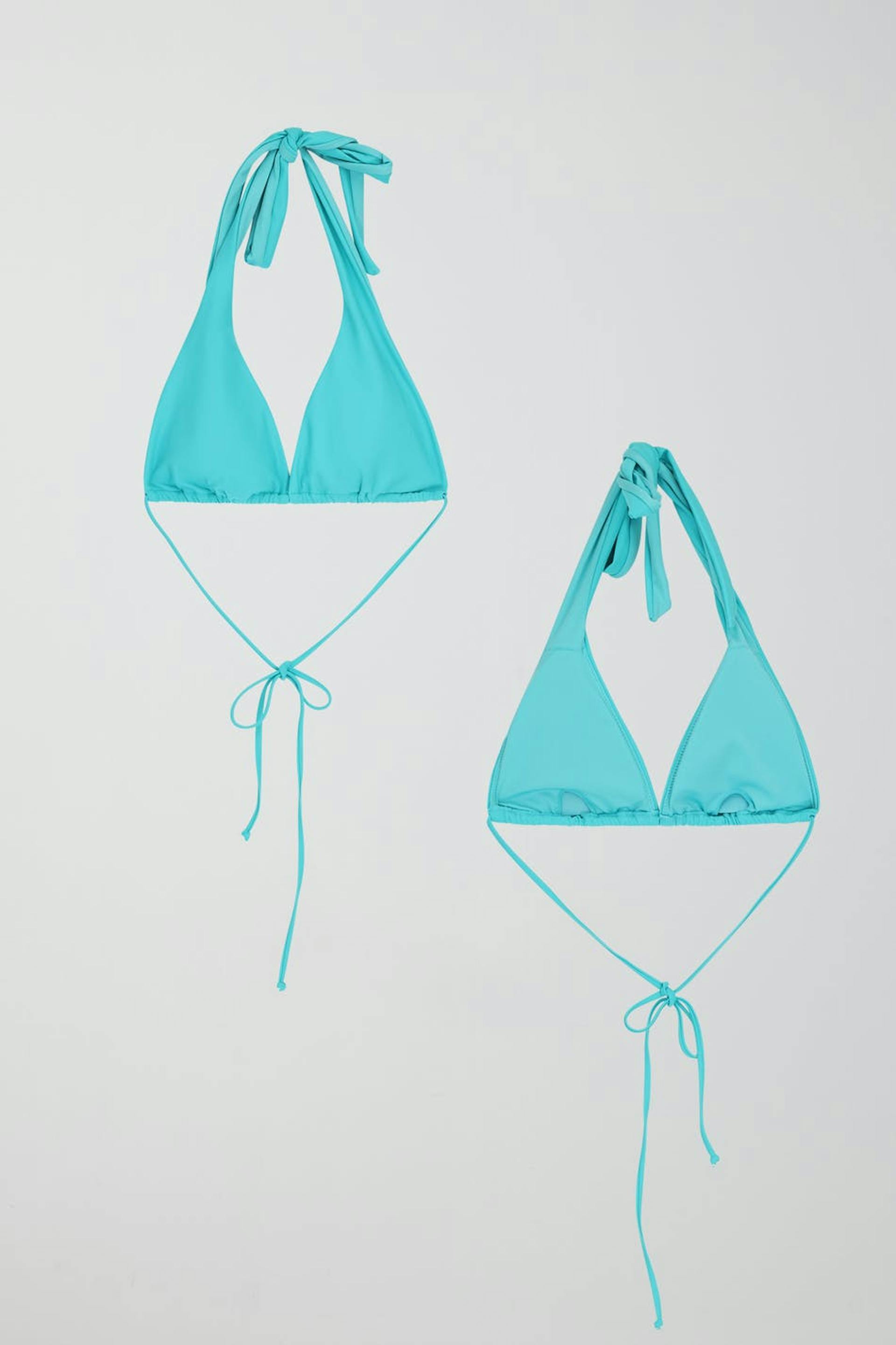 Trekantsbikini-topp med halterneckdesign. Bikinitoppen är blå och har knytning bak och i nacken.