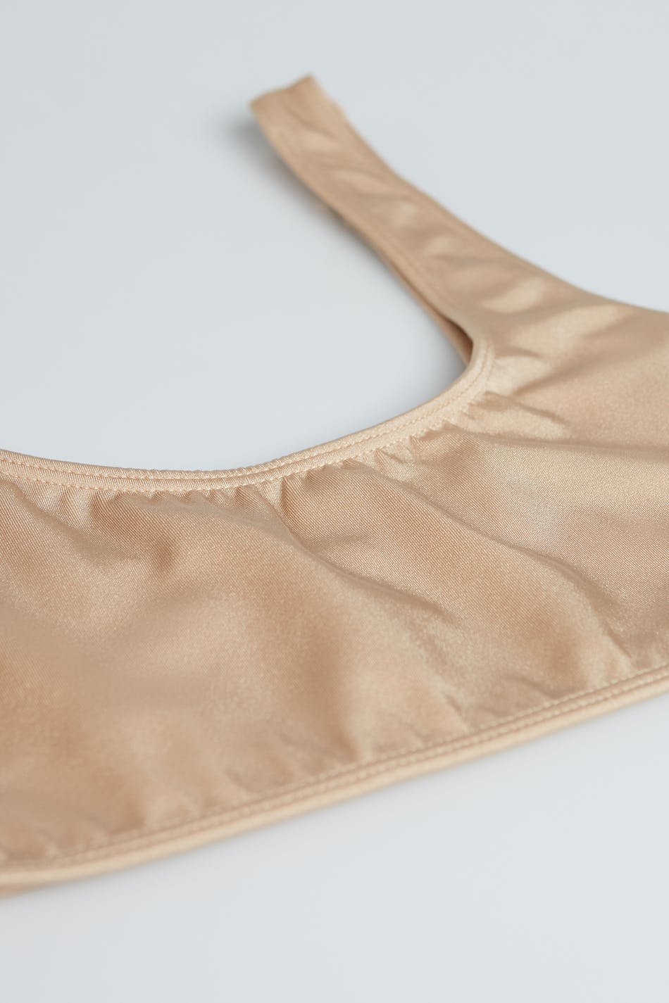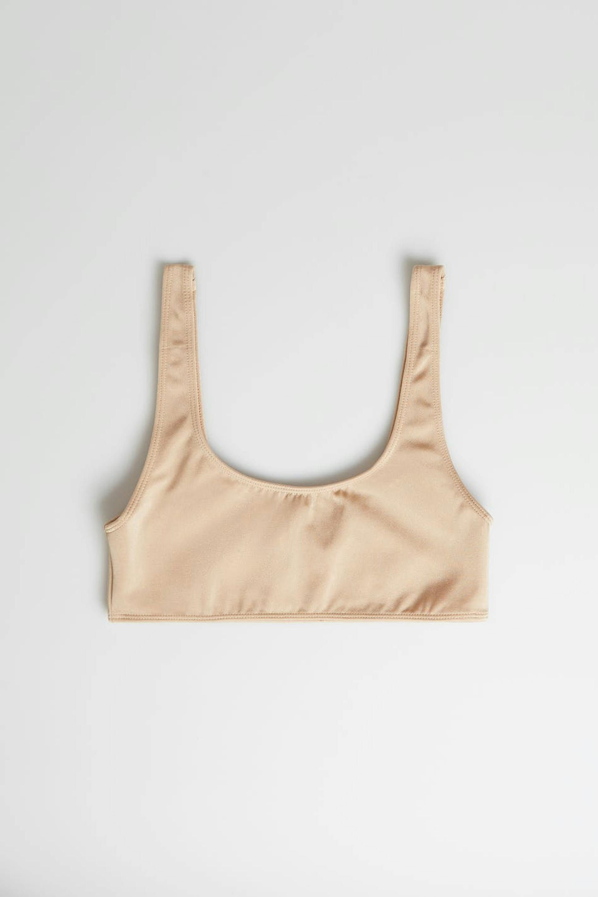 Bikinitopp med en rund halsringning. Bikinitoppen är beige och har ett baddräktsmaterial.