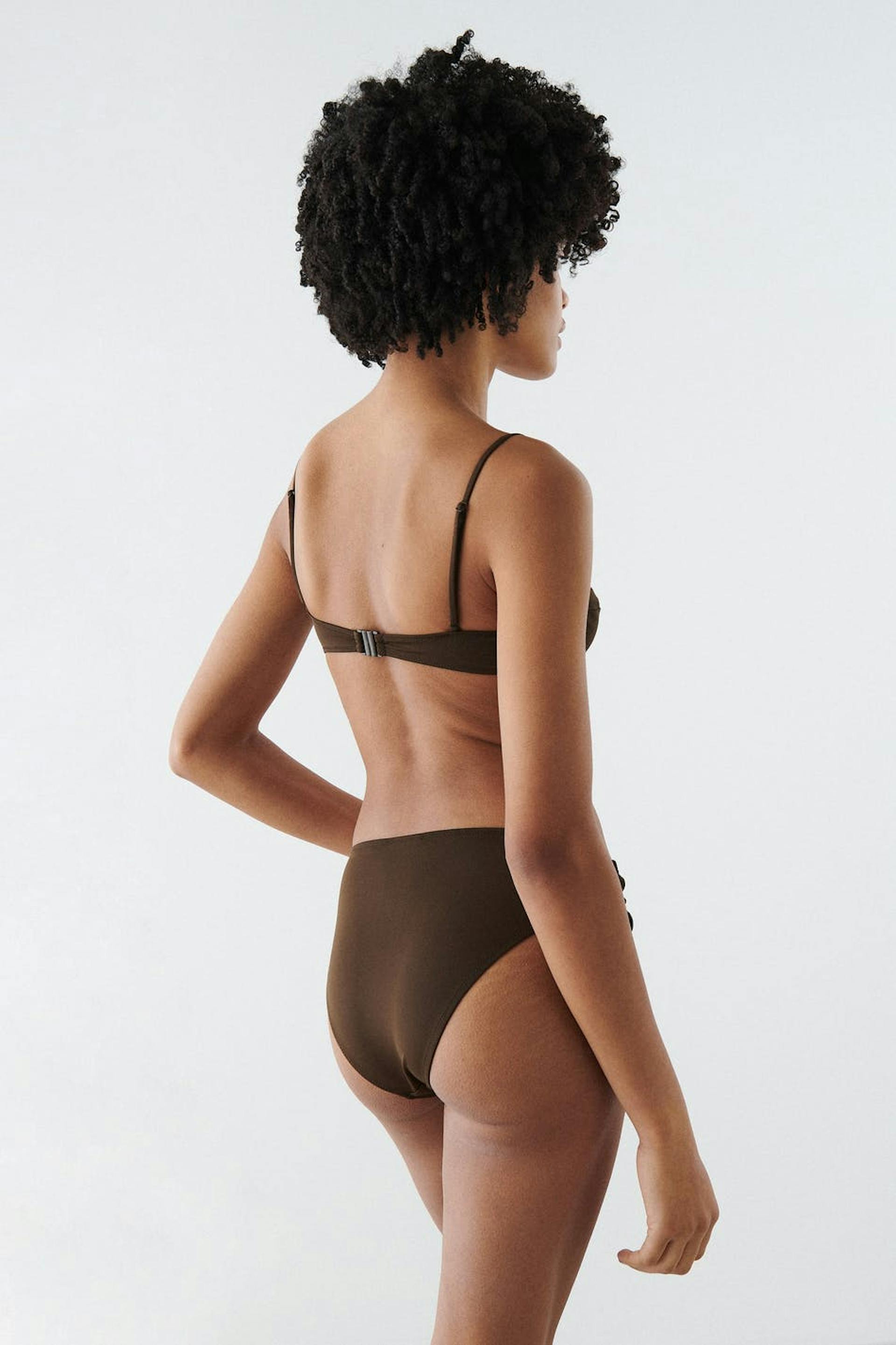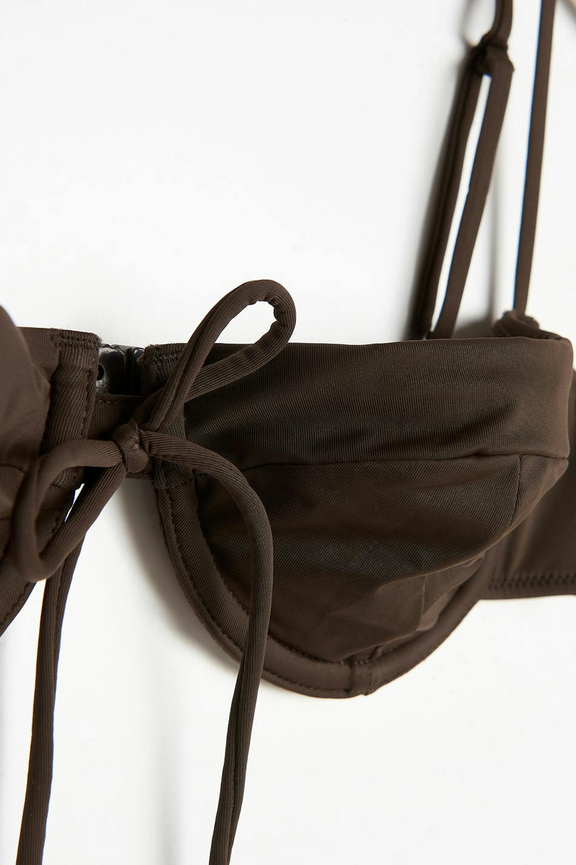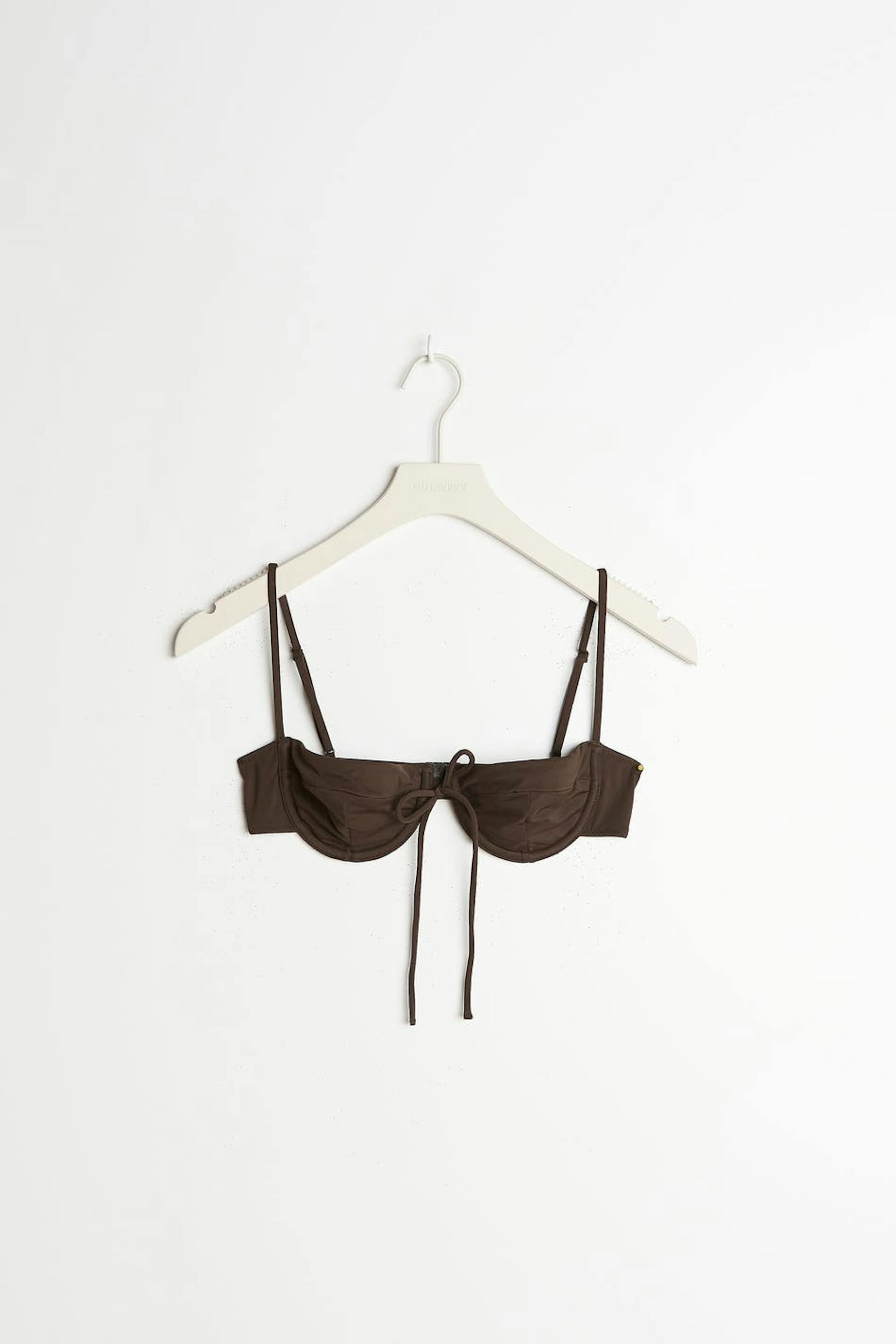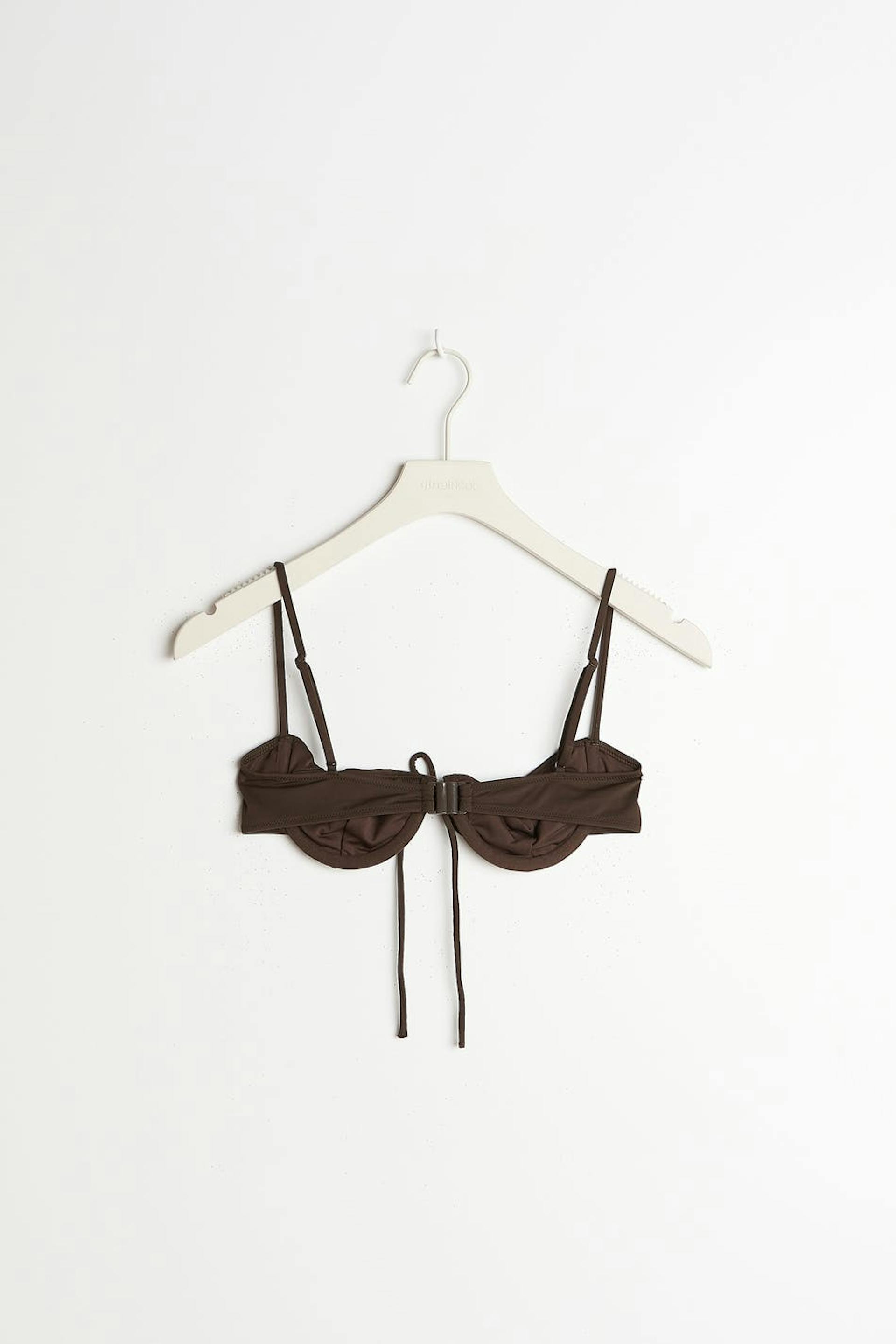 Bikinitopp med bygel. Bikinitoppen är brun och har en knytdetalj framtill. Den har ett halvglansigt material, justerbara axelband och ett spänne baktill.