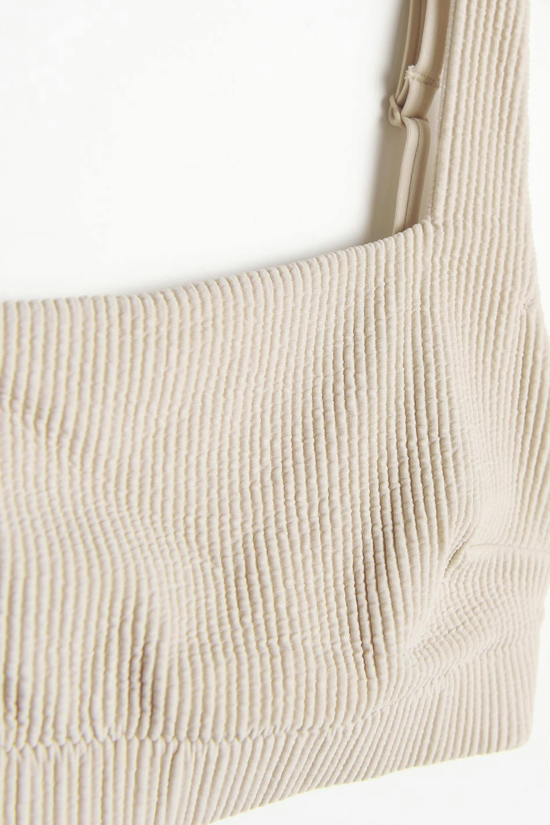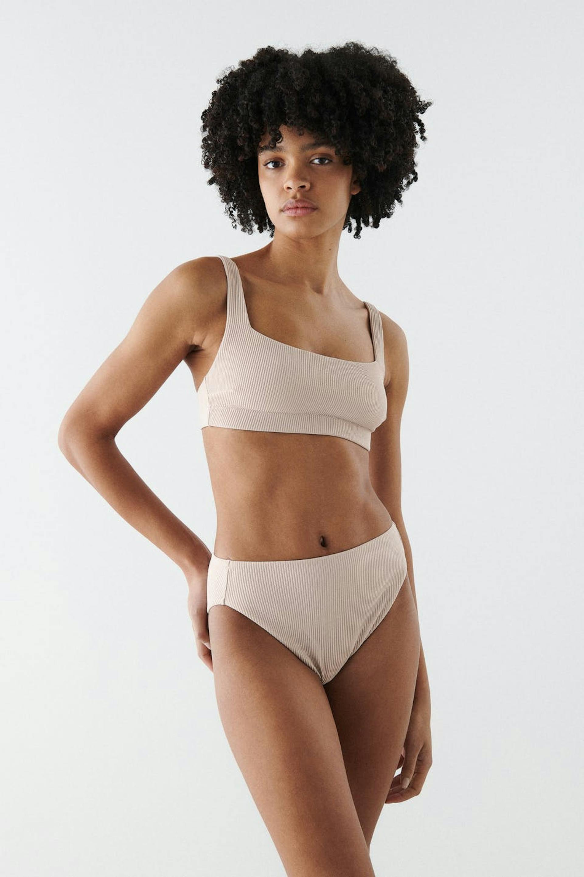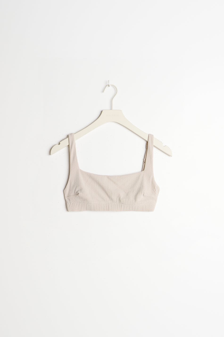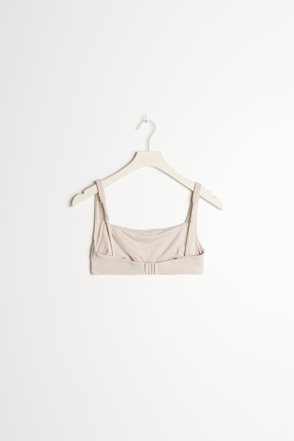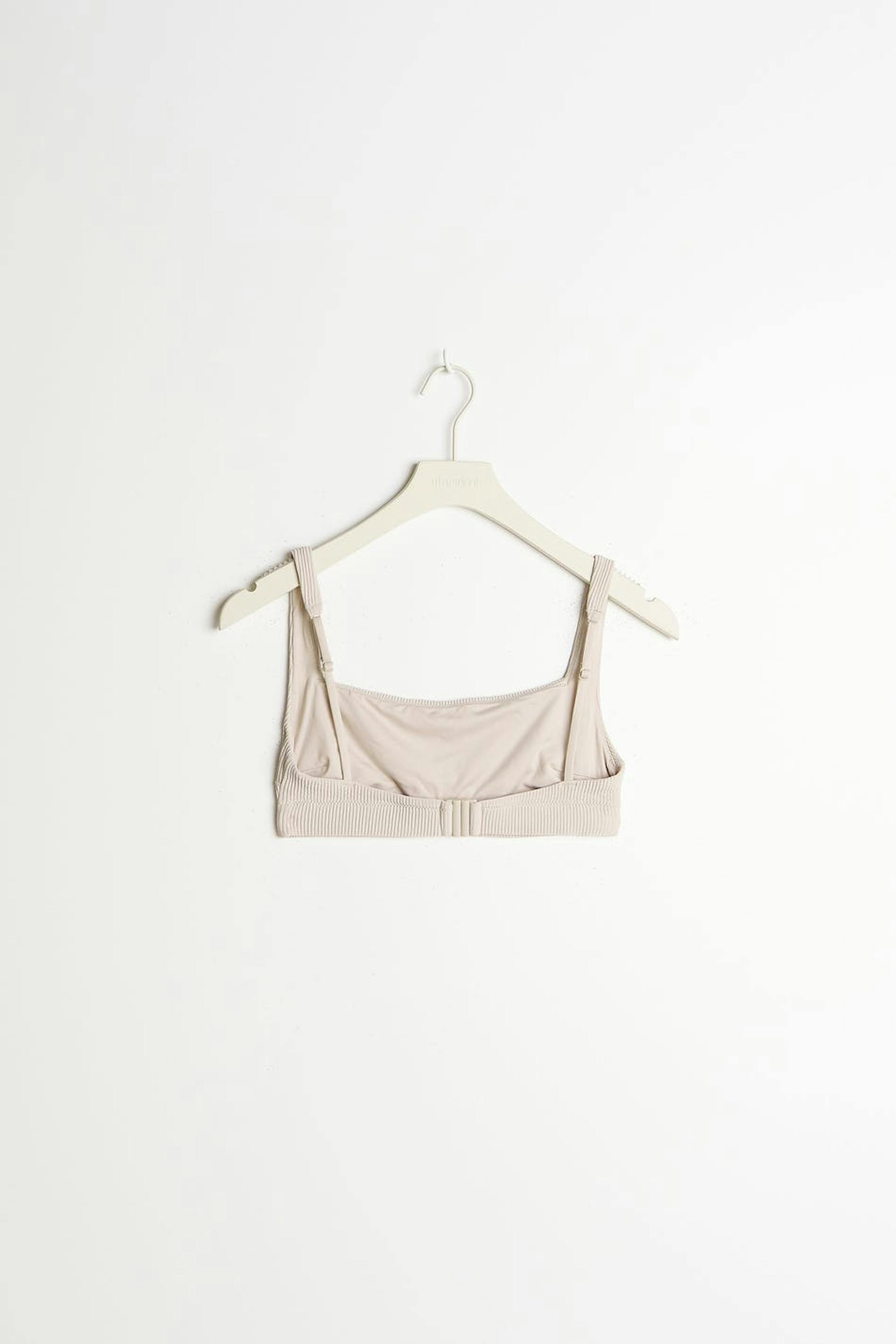 Fodrad bikinitopp med justerbara axelband. Bikinitoppen är beige och har ett strukturerat baddräktsmaterial med spänne baktill.