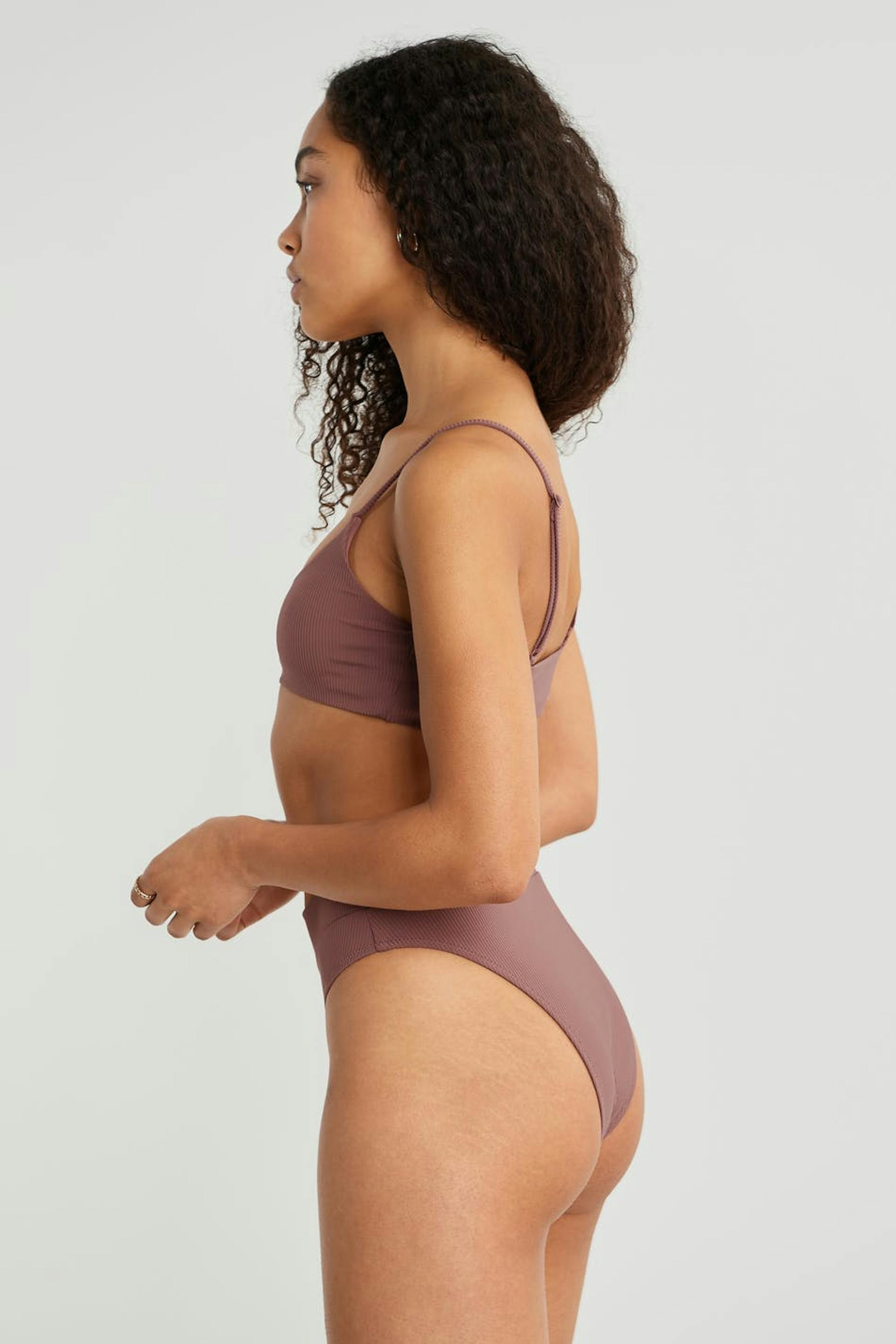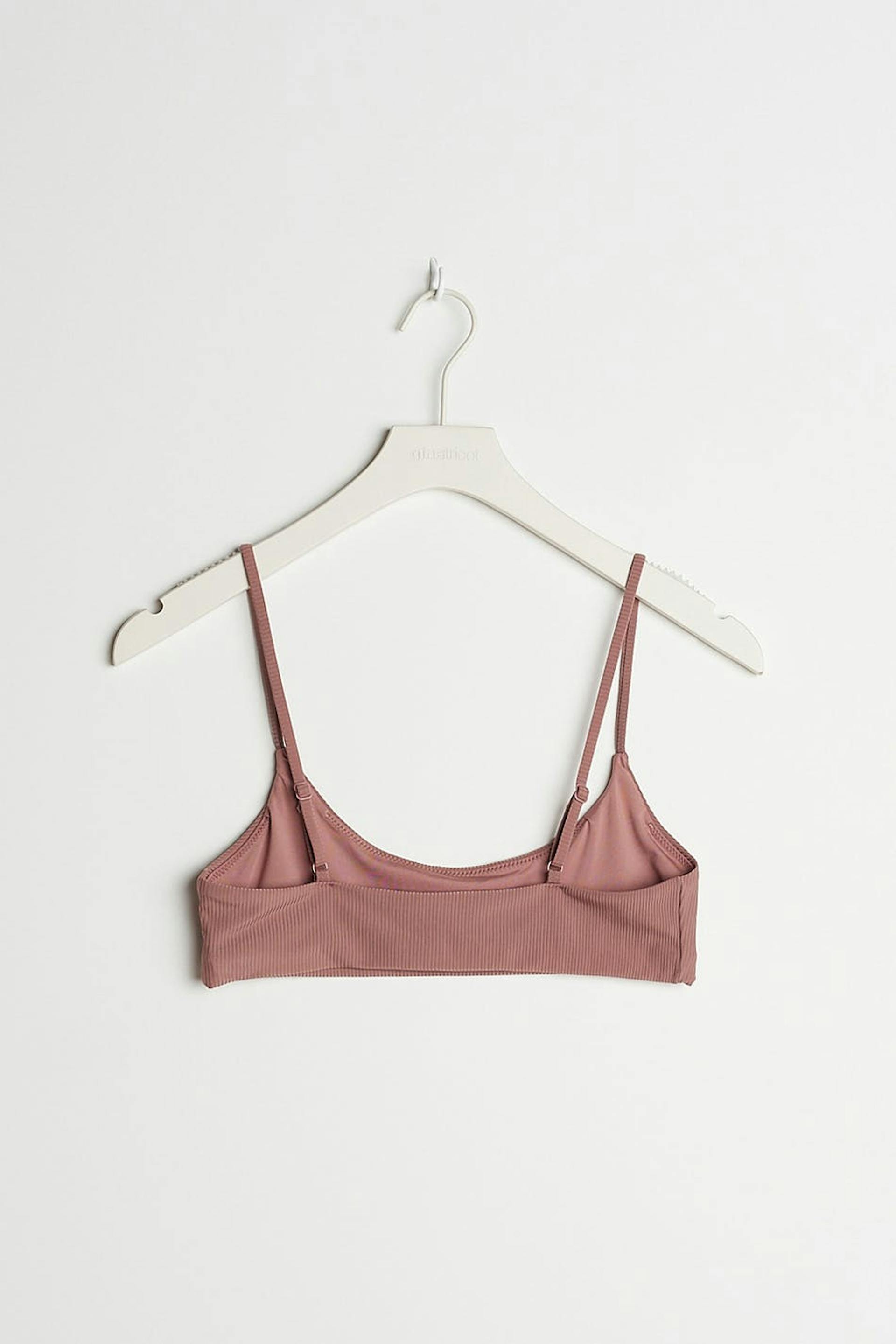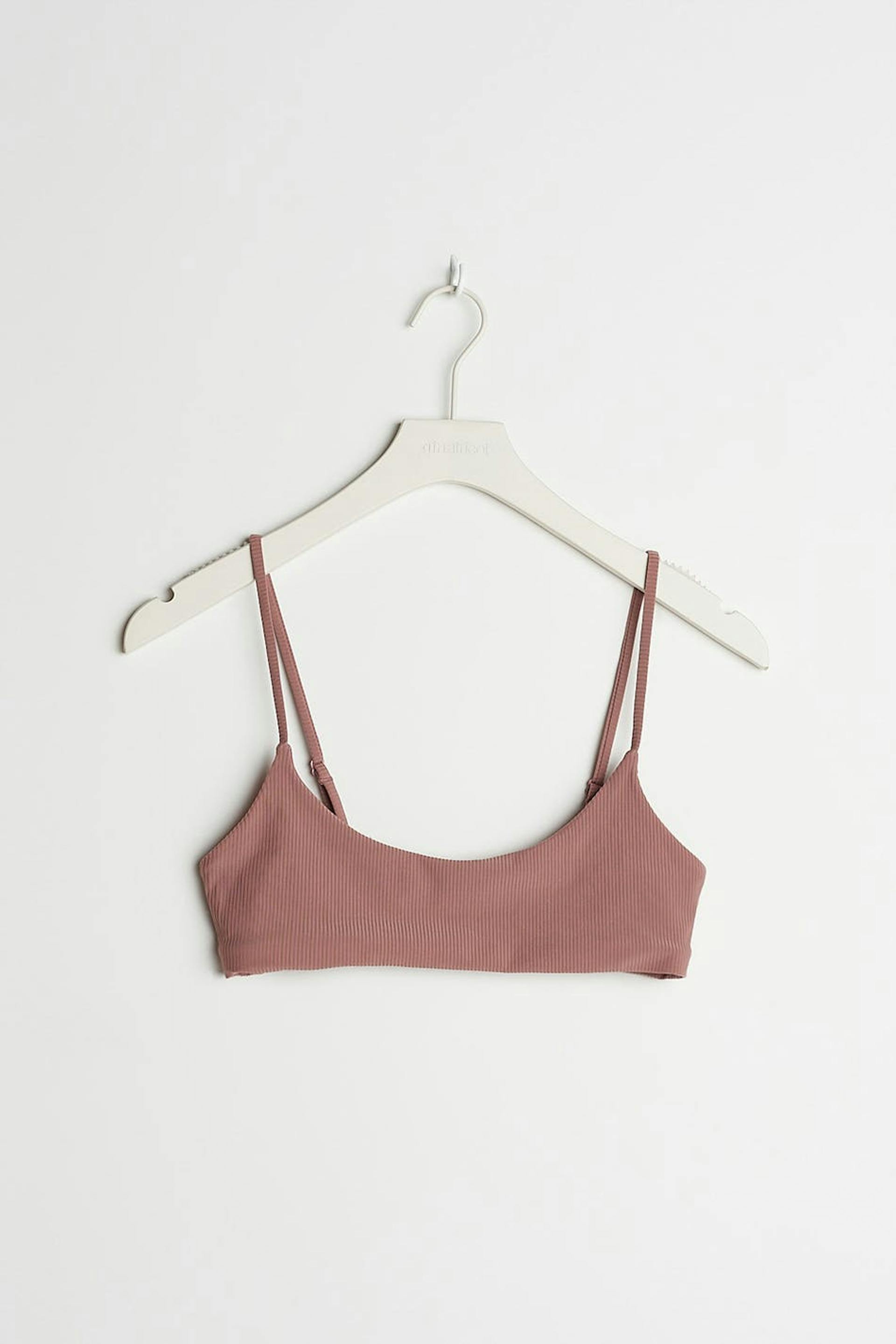 Ribbad bikinitopp med justerbara axelband. Bikinitoppen är rosa.